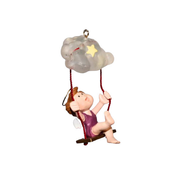 Joyful and whimsical, the 1989 Playful Angel ornament (part of the Artists’ Favorites collection) depicts a cherubic child angel gleefully swinging from a fluffy cloud shaped like a star-marked sky. Sculpted by Donna Lee, her rosy cheeks and carefree pose bring holiday delight. The ornament typically arrives in the original green Artists’ Favorites box; tags may vary. No batteries, cords, or light strings are needed—purely decorative charm.