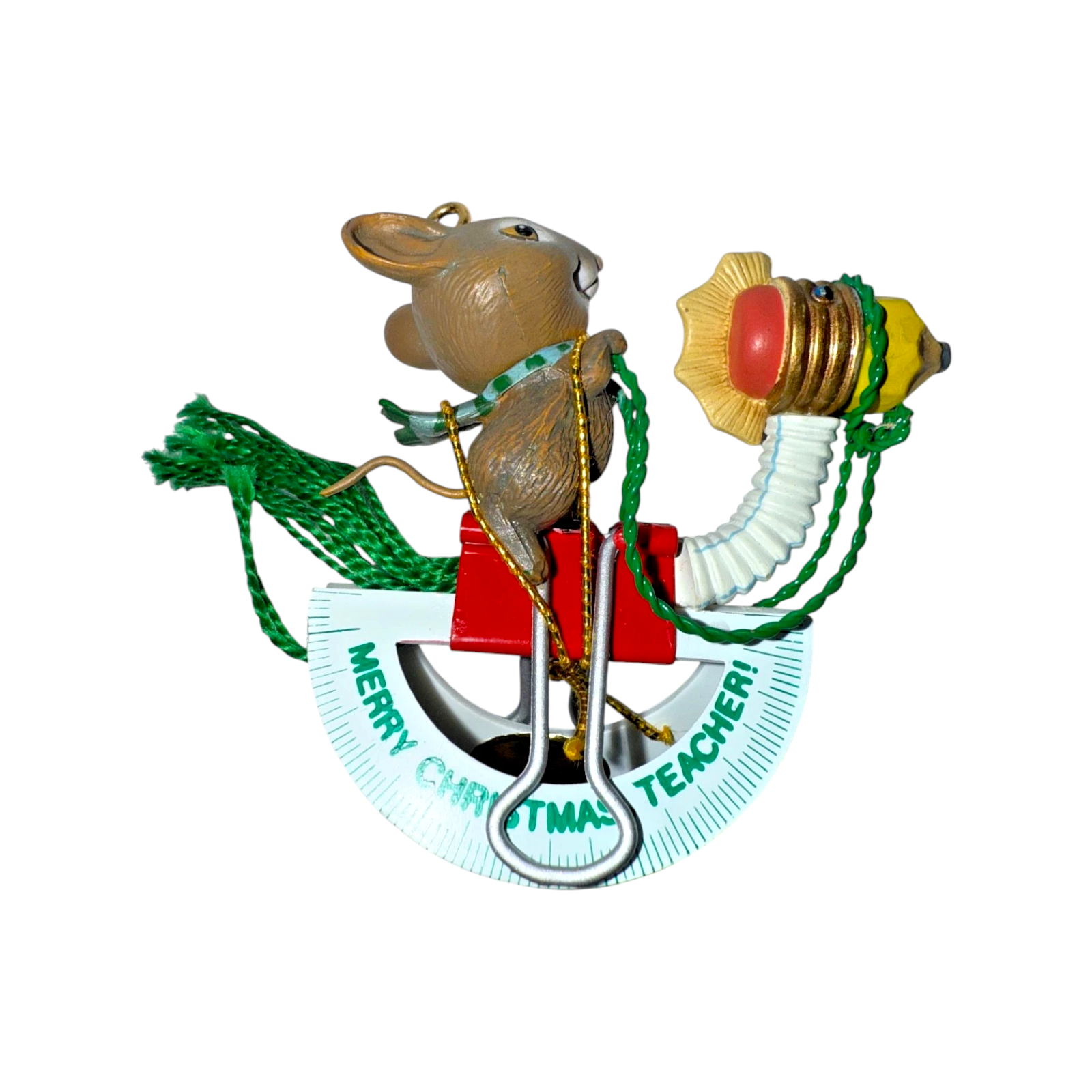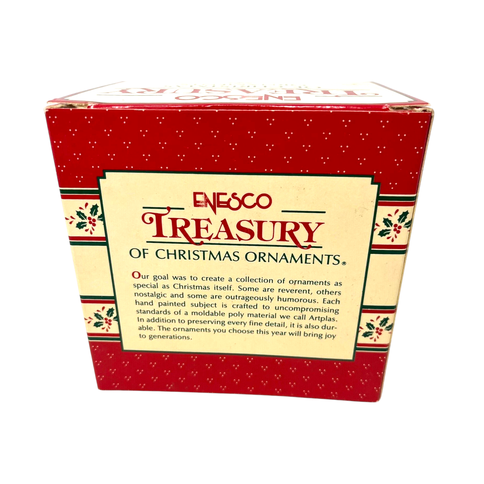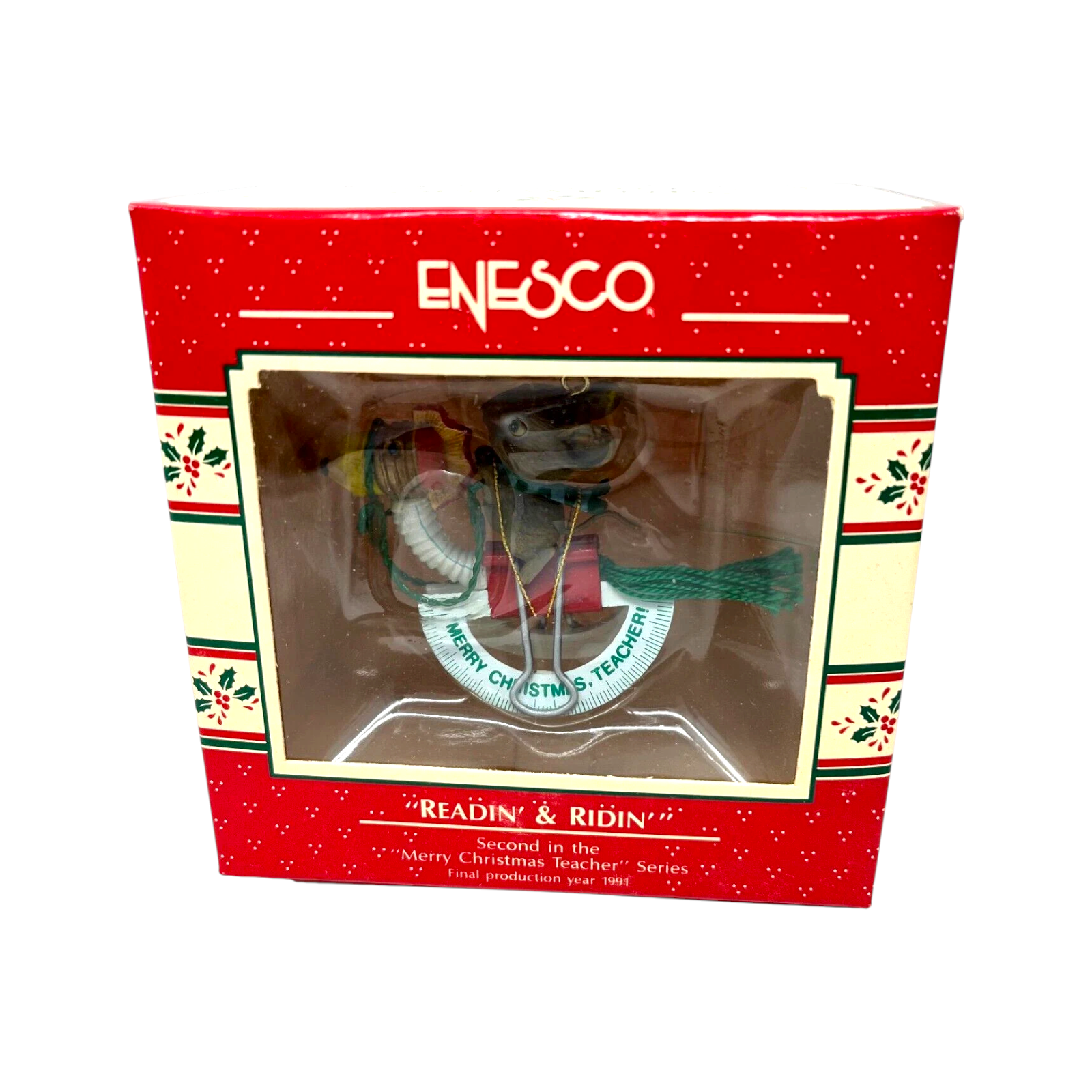 Honor the joy of teaching and holiday cheer with the 1989 Enesco “Readin’ & Ridin’” ornament — the second issue in the charming “Merry Christmas Teacher” series. This delightful collectible features a cheerful teacher bear riding a rocking horse, holding a book and apple as symbols of learning and care. Hand-painted with warm colors and crafted with Enesco’s signature detail, this ornament captures the timeless appreciation for educators. A thoughtful keepsake for teachers and collectors alike, it adds a nostalgic and heartfelt touch to any Christmas tree.
