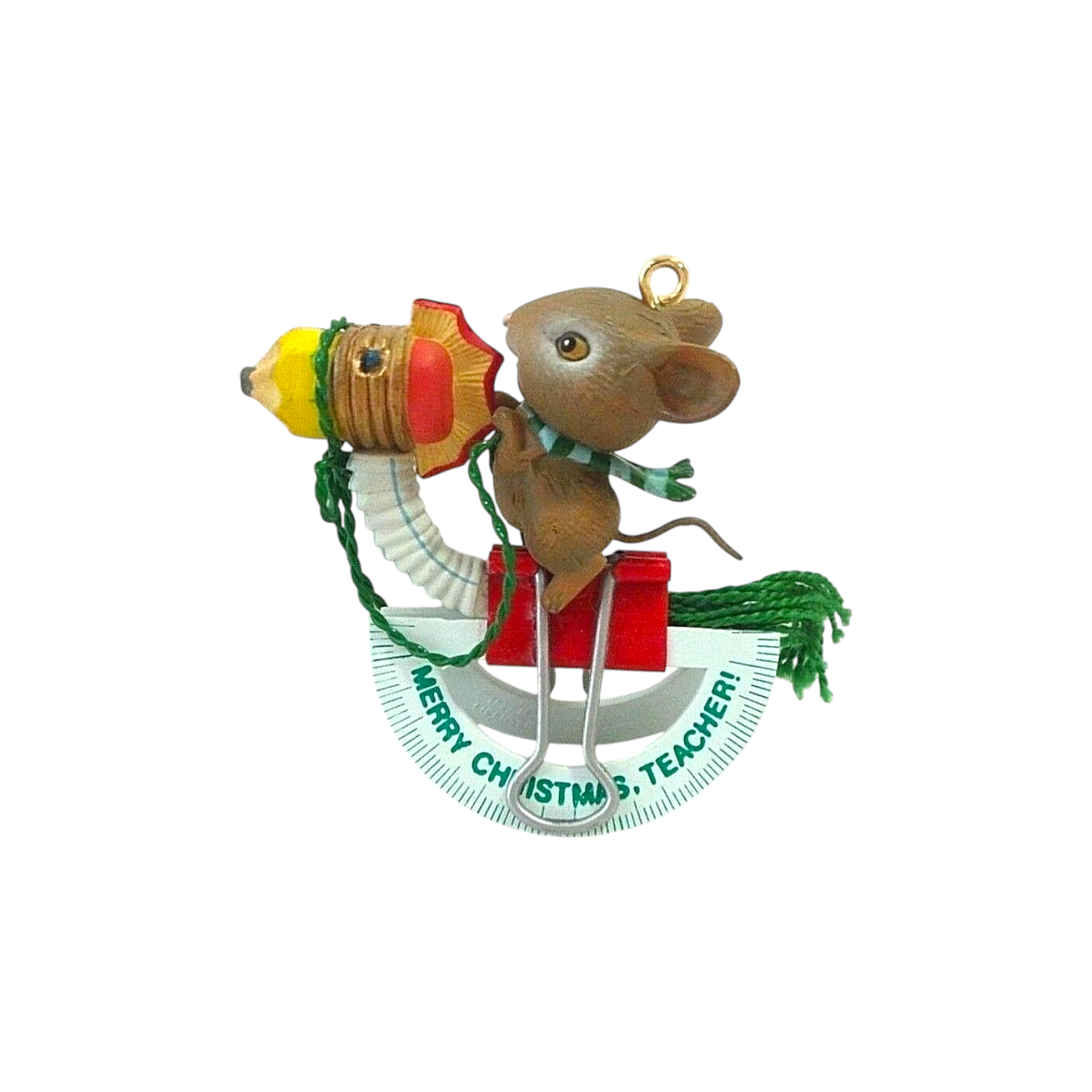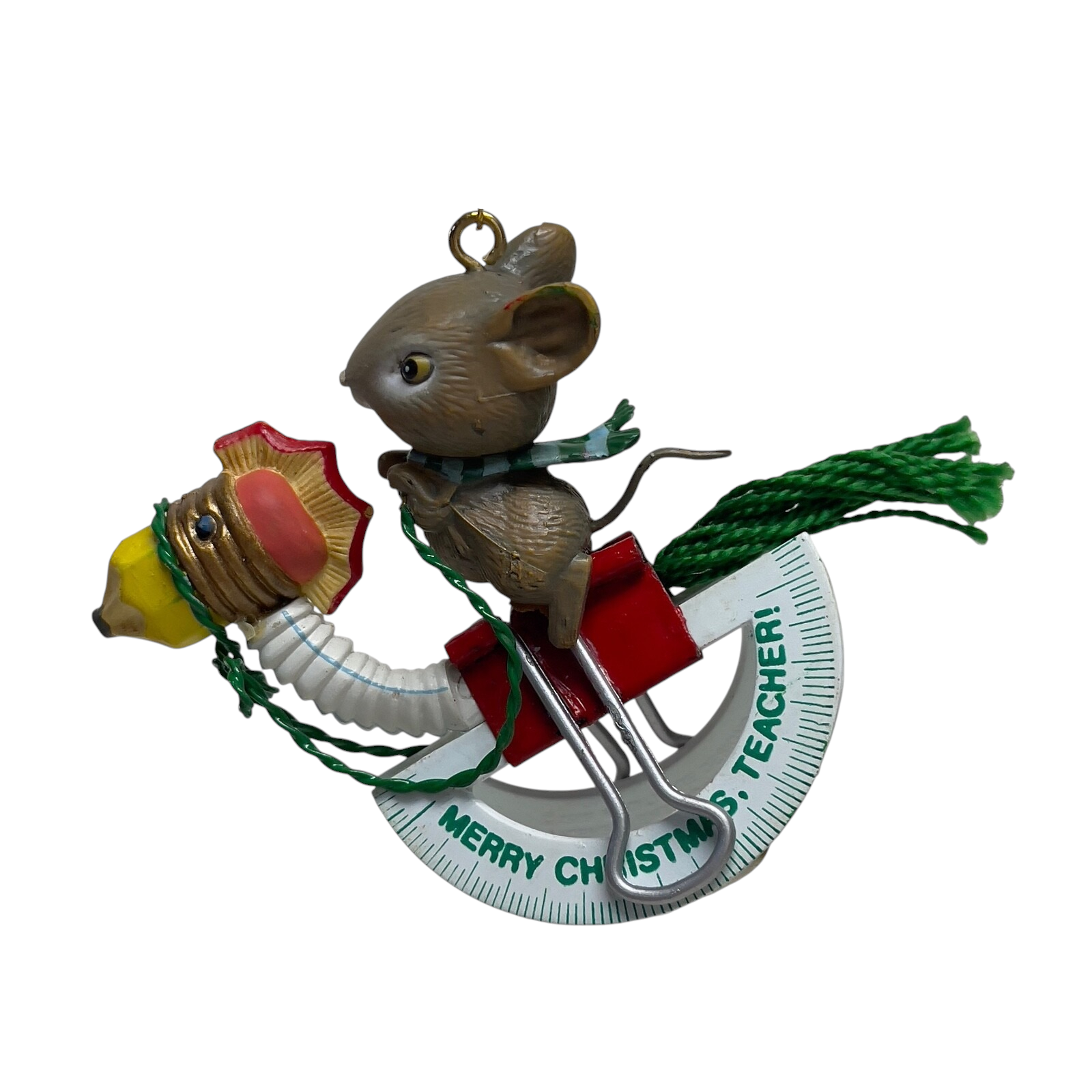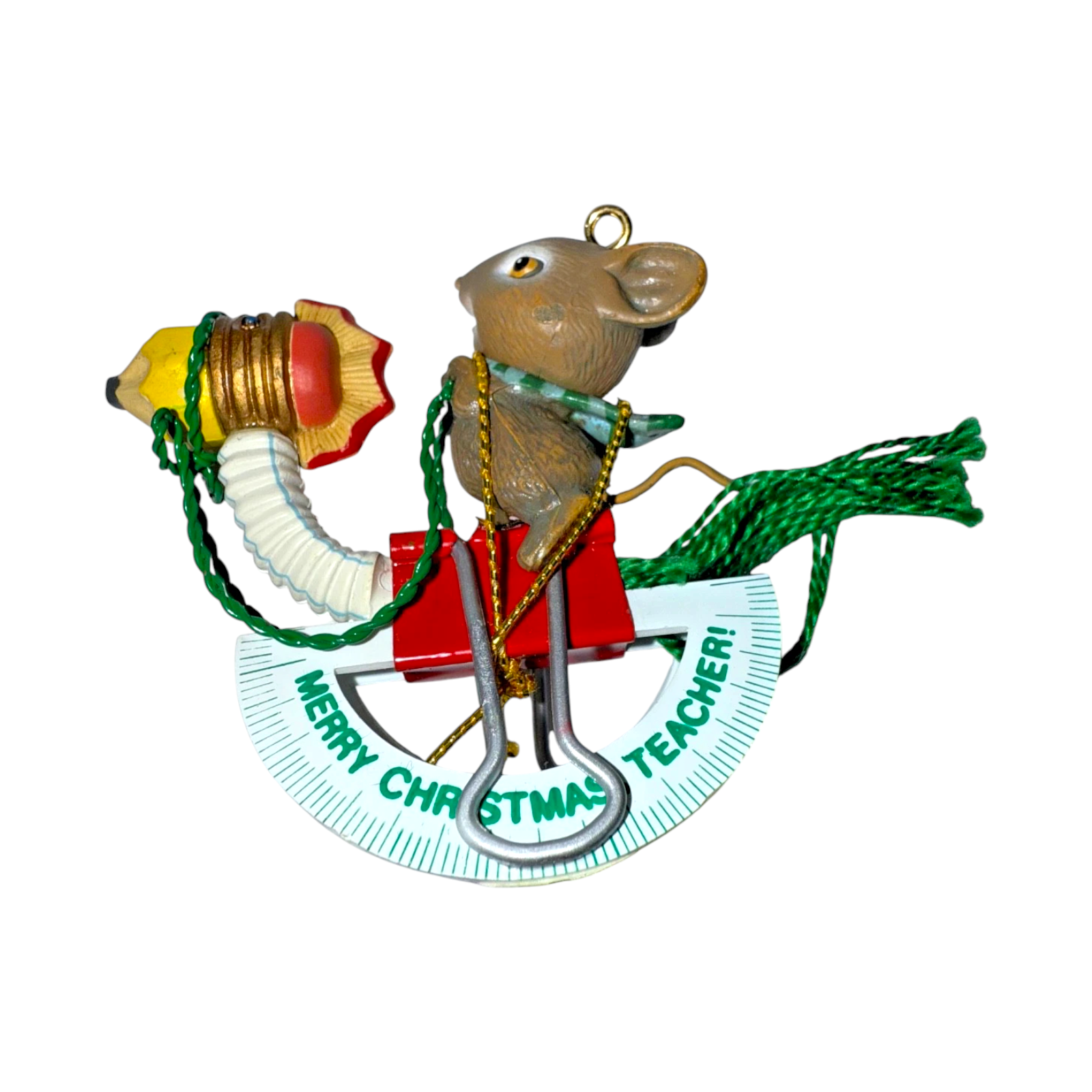 Honor the joy of teaching and holiday cheer with the 1989 Enesco “Readin’ & Ridin’” ornament — the second issue in the charming “Merry Christmas Teacher” series. This delightful collectible features a cheerful teacher bear riding a rocking horse, holding a book and apple as symbols of learning and care. Hand-painted with warm colors and crafted with Enesco’s signature detail, this ornament captures the timeless appreciation for educators. A thoughtful keepsake for teachers and collectors alike, it adds a nostalgic and heartfelt touch to any Christmas tree.