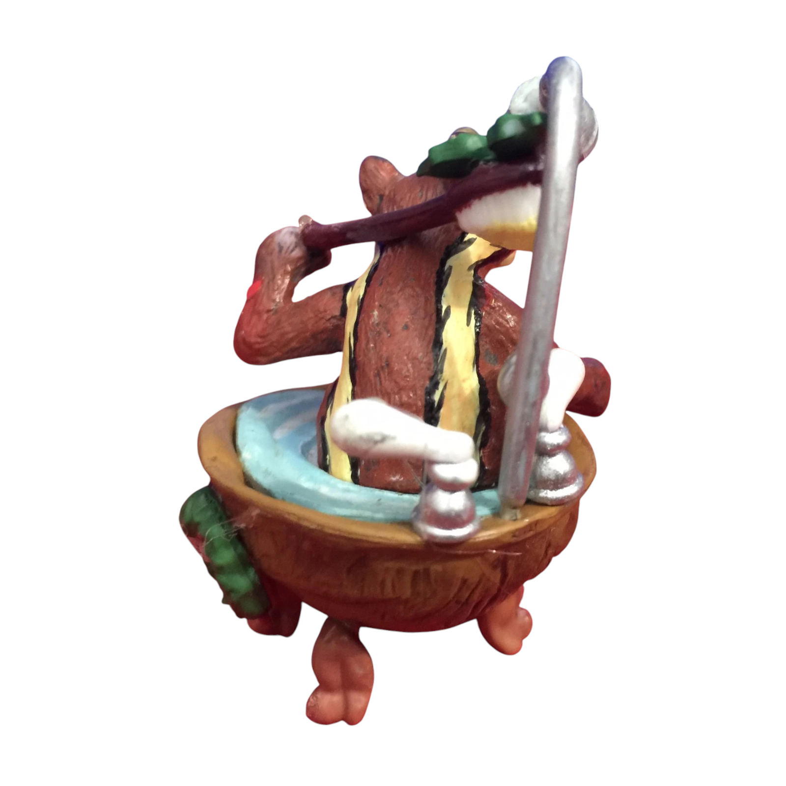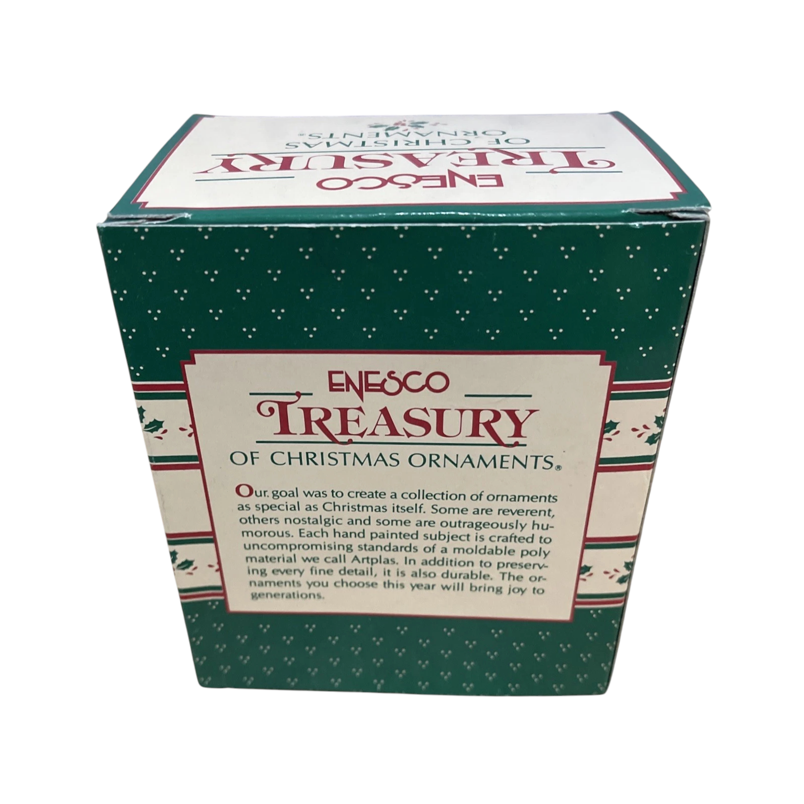 This playful ornament features a cheerful little squirrel relaxing in a walnut-shell bathtub—complete with soap bubbles and scrub brush—bringing a humorous twist to holiday décor. Crafted in the late-1980s, the piece is part of the “In a Nutshell” novelty series and captures Enesco’s signature whimsy and fine moulding. With its hand-painted detail and compact design, it appeals to collectors of vintage holiday ornaments and fans of animal-themed keepsakes alike. As the first issue in the “In a Nutshell” series, it holds special appeal for series-seekers and those wanting that “start” of a collection.
