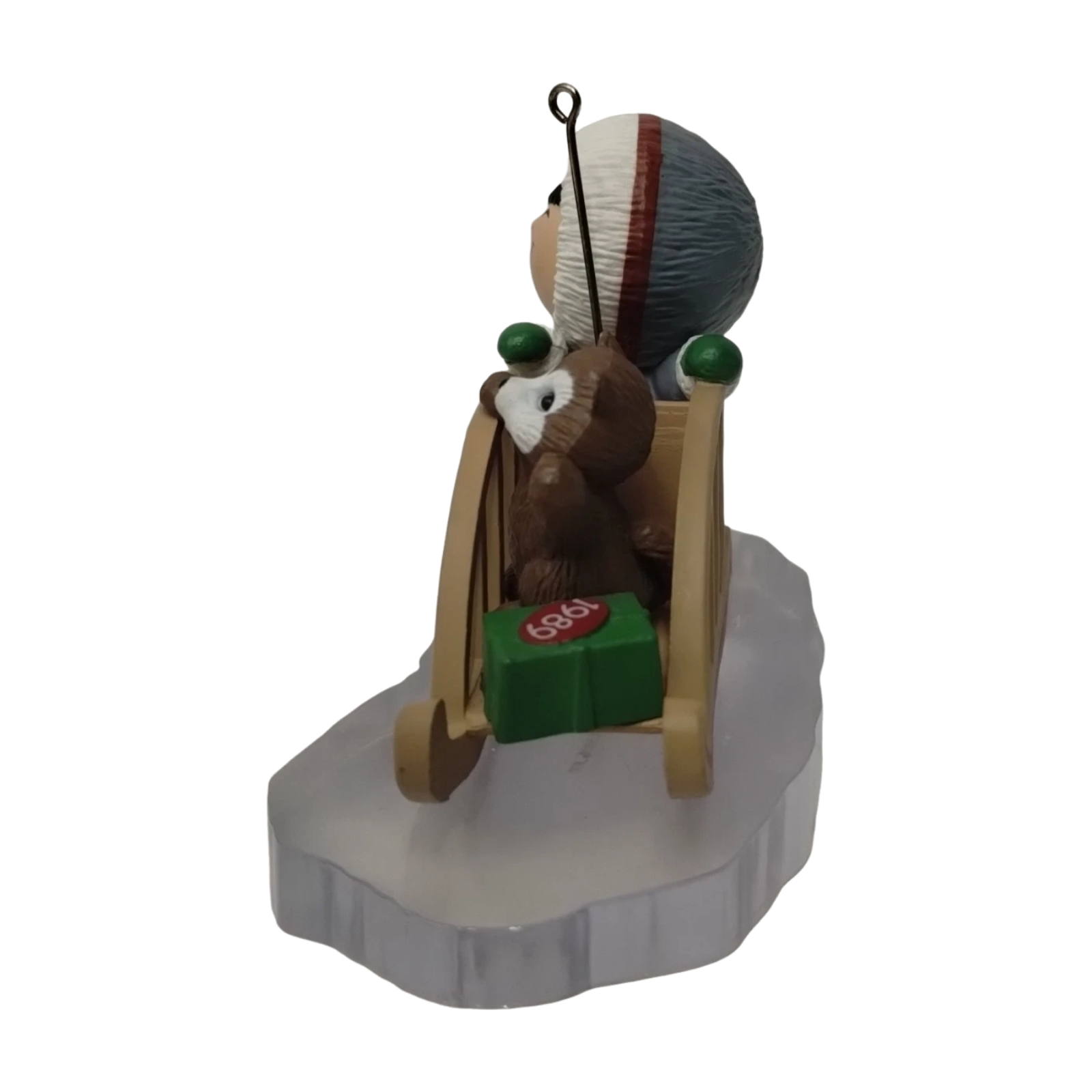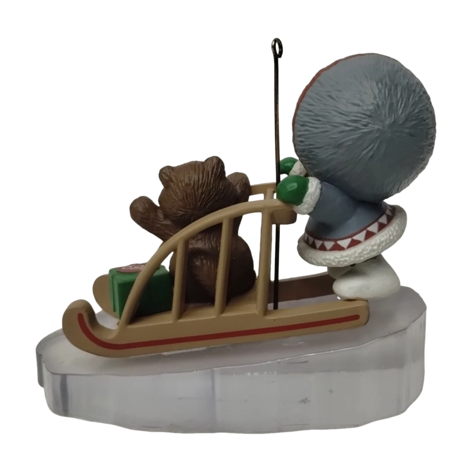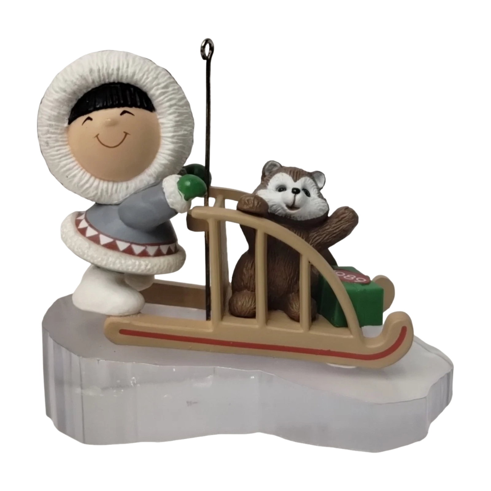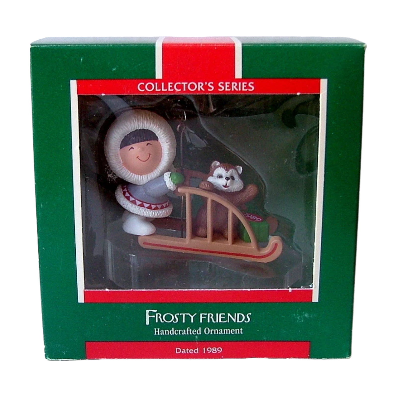 Delight in whimsical winter nostalgia with the 1989 Frosty Friend (Frosty Friends Series) ornament. This favorite from Hallmark’s long-running Frosty Friends line—10th in the series—depicts a smiling Eskimo bundled in cozy winter wear, sledding across a clear ice base alongside a playful husky friend. Crafted by artist Ed Seale and dated “1989,” it includes its original collector’s box and tag. Powered through a bulb on a standard miniature light string (push-in), it illuminates the scene—no batteries needed.
