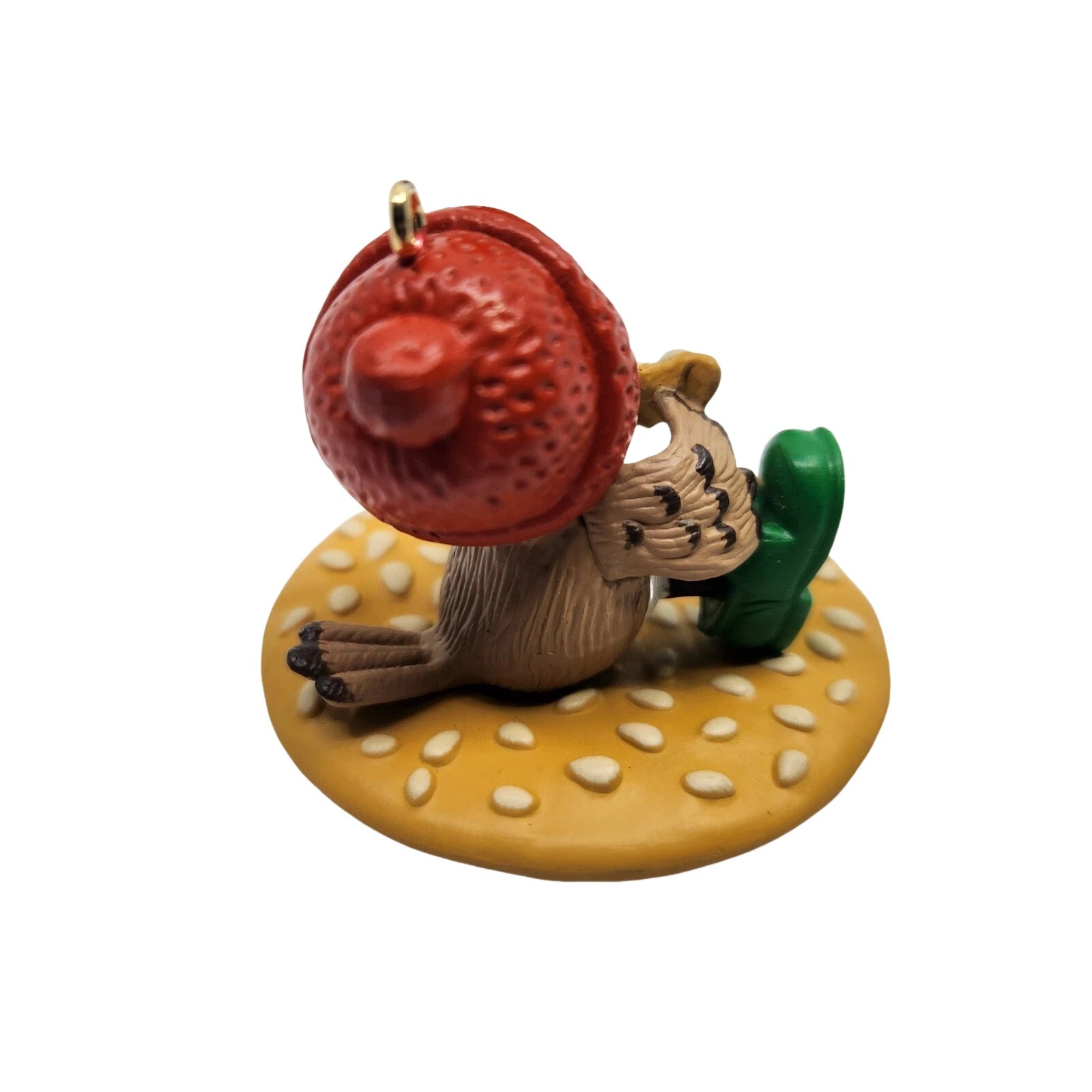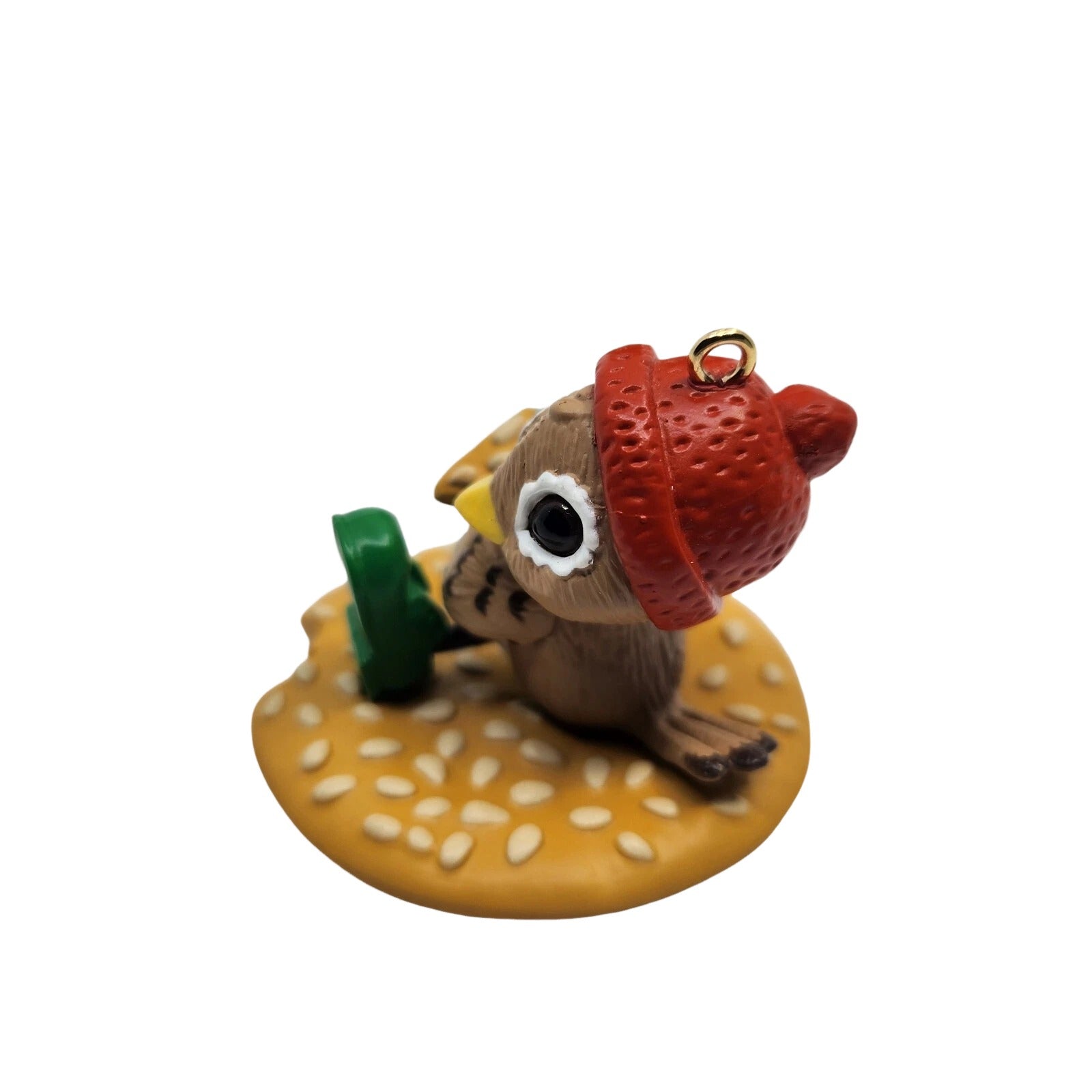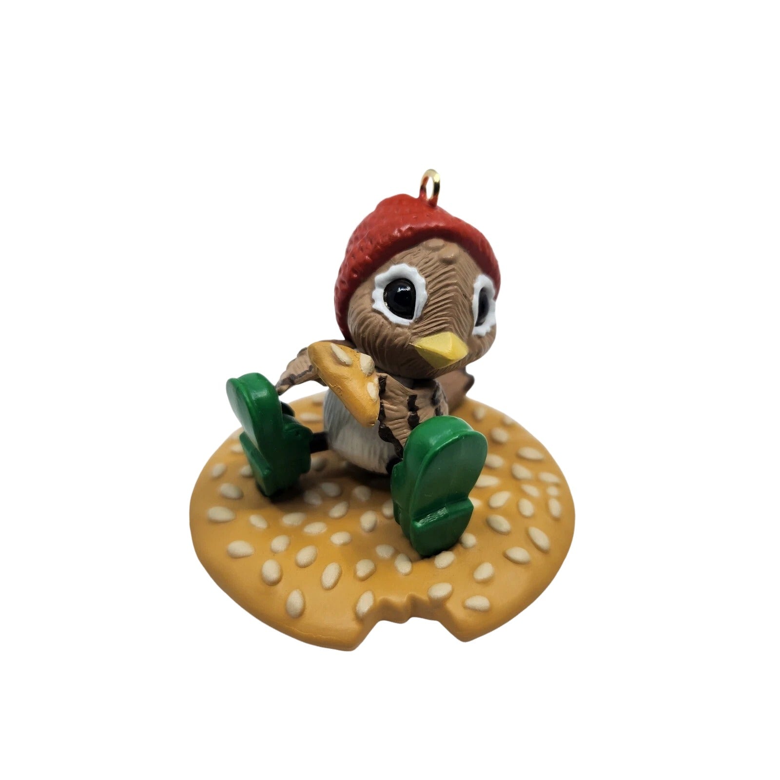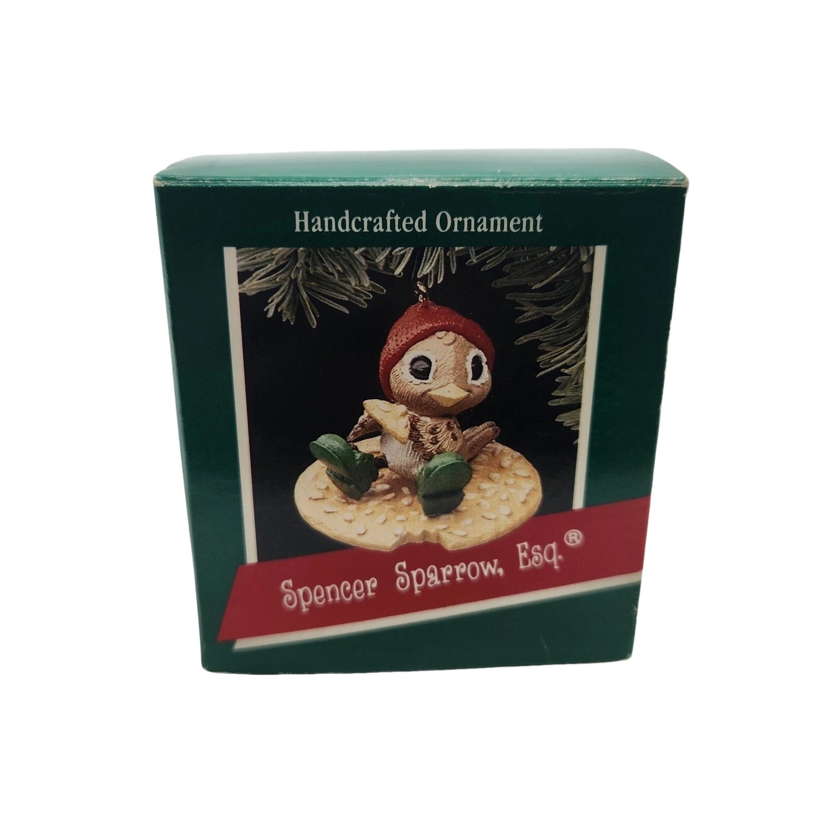 Charming and whimsical, the 1989 Spencer Sparrow, Esq. ornament features a happy little sparrow sitting atop a sesame cracker—with a bite missing—holding the crumb he’s nibbling on. He wears a red cap and green shoes, radiating playful Christmas cheer. This collectible piece usually ships in its original green Keepsake Ornament box with festive design. No batteries, lights, or cords are required—simply delightful display appeal for bird lovers and snack-humor enthusiasts alike.