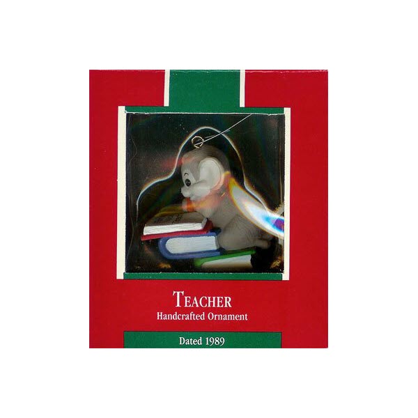 The 1989 Teacher ornament features an adorable grey mouse perched atop a stack of three brightly colored books—red, blue, and green—intently writing in an open book with a pencil. Marked “1989” on one of the books, it captures the spirit of learning and holiday gratitude. This sweet Keepsake ornament typically includes its original red Keepsake Miniature Ornament box with date imprint on the box. No batteries, lights, or cords are needed—just charming decor to celebrate teachers or book lovers. .