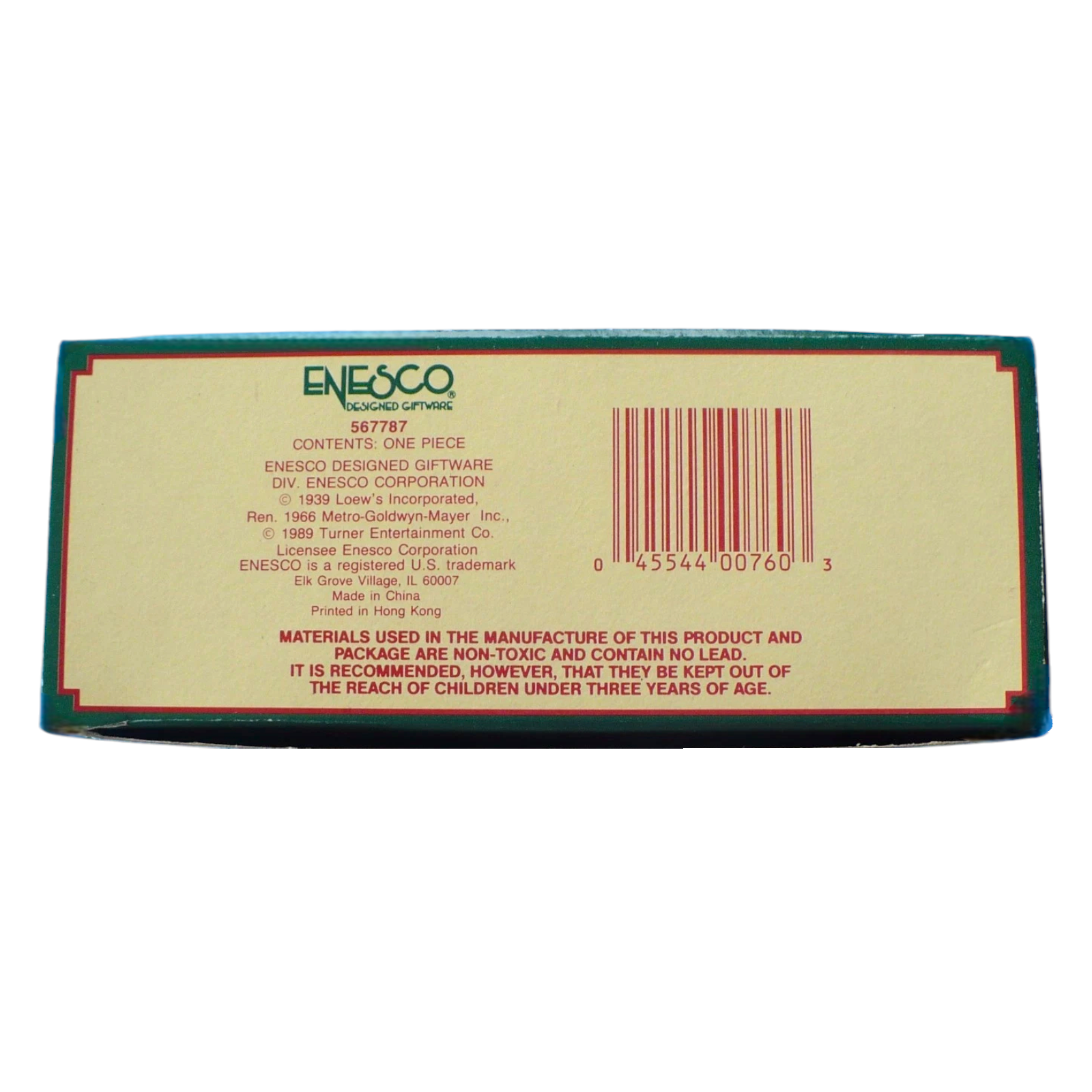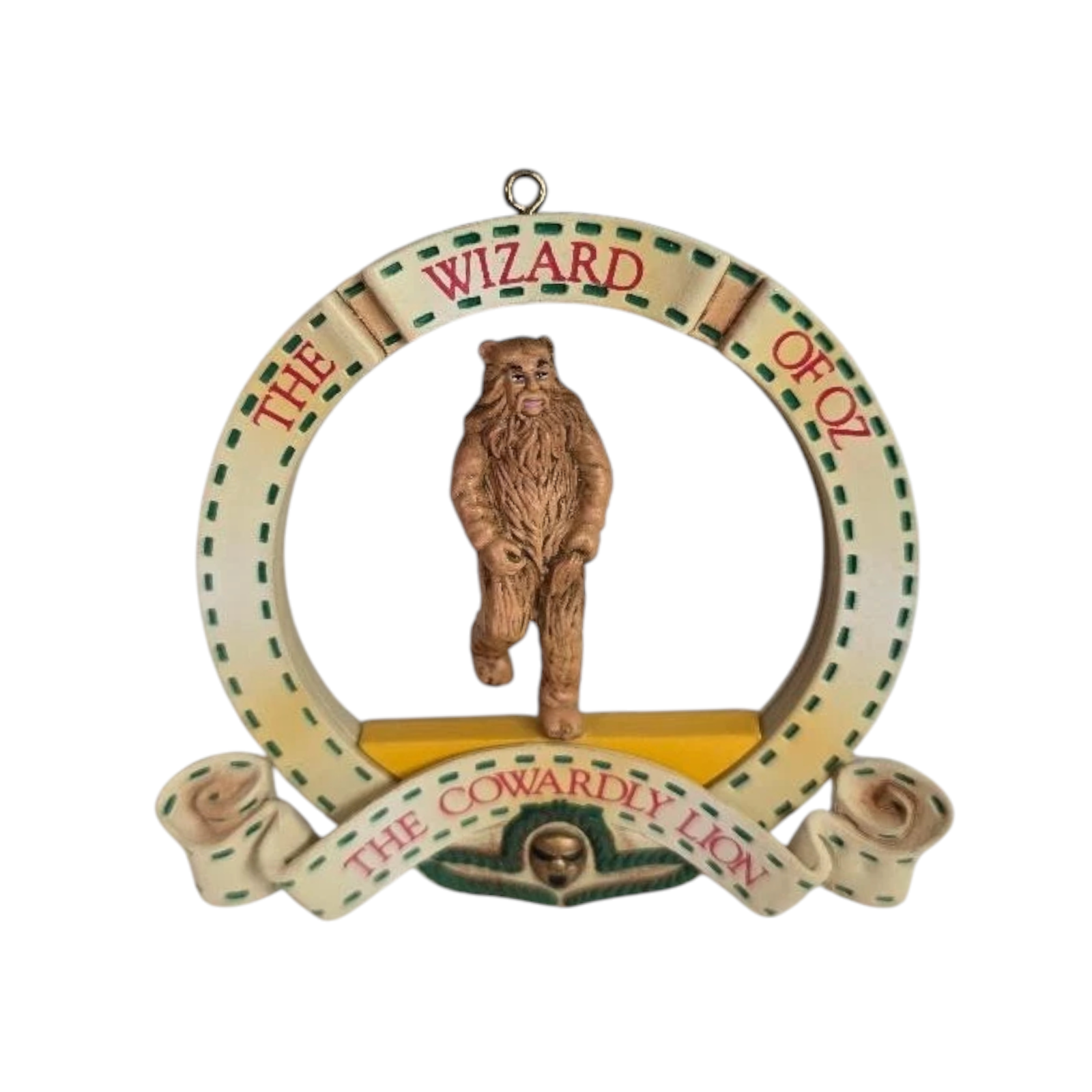 This collectible ornament features the iconic Cowardly Lion character framed within a decorative holiday ring, beautifully sculpted in hand-painted molded plastic. The rich multicolored detailing captures the lion’s expressive face and signature mane, while holiday accents highlight the vintage charm of the piece. Released in 1989 as part of Enesco’s Wizard of Oz 50th anniversary collection, it appeals to both film-fans and dedicated ornament collectors. With its nostalgic appeal and series significance, this rare piece makes a standout addition to any holiday décor or collector’s tree.