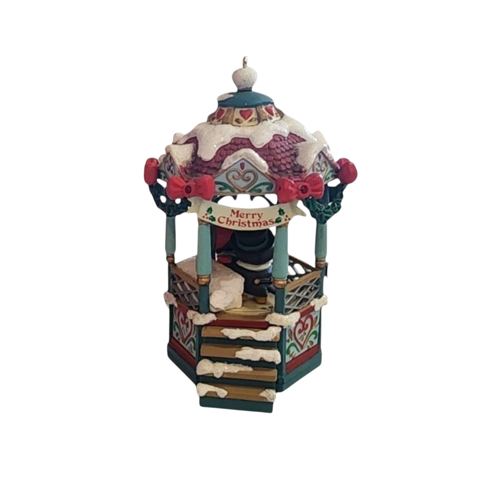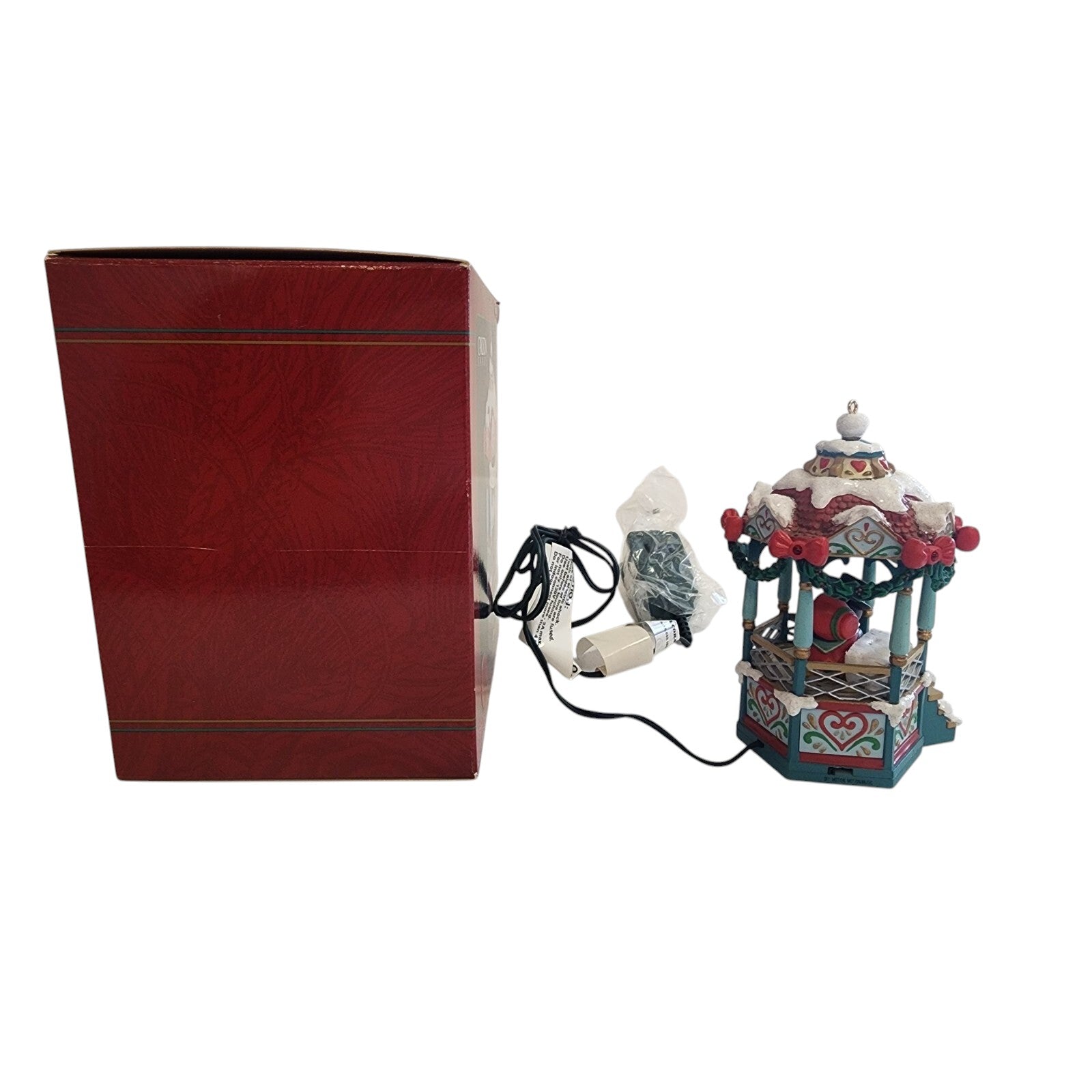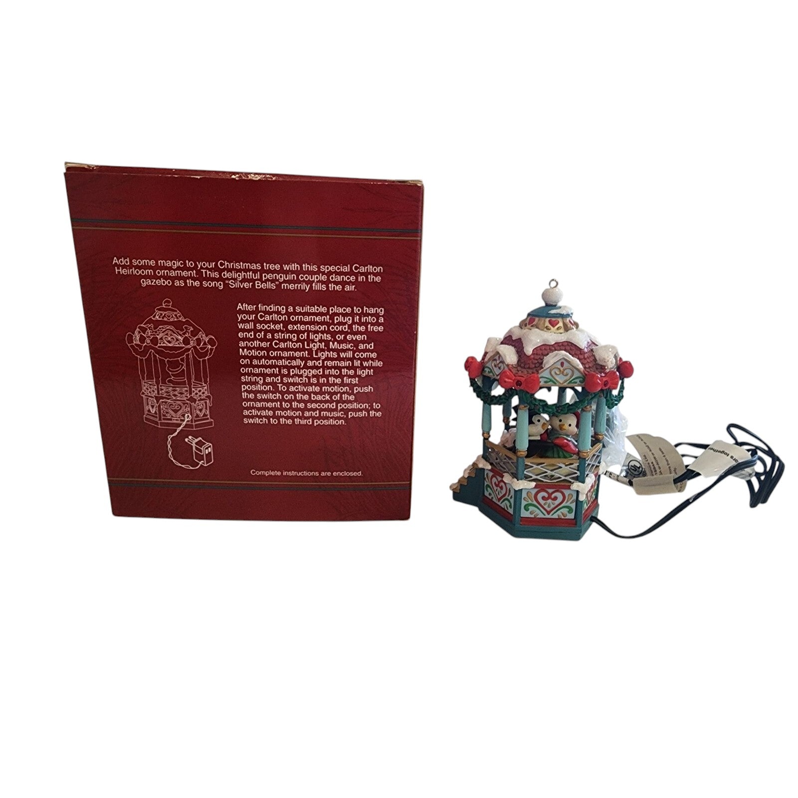 This collectible ornament features an enchanting penguin couple gathered under a festive gazebo, beautifully sculpted in mixed materials with lively colours and fine detailing. The piece includes built-in light and musical motion elements, making it both decorative and interactive for holiday display. As a vintage Heirloom-style release with a penguin motif, it appeals to animal-theme collectors and those seeking fun, nostalgic ornaments. Its combination of music, light and thematic charm provides a standout piece that enhances both holiday décor and collectible value.