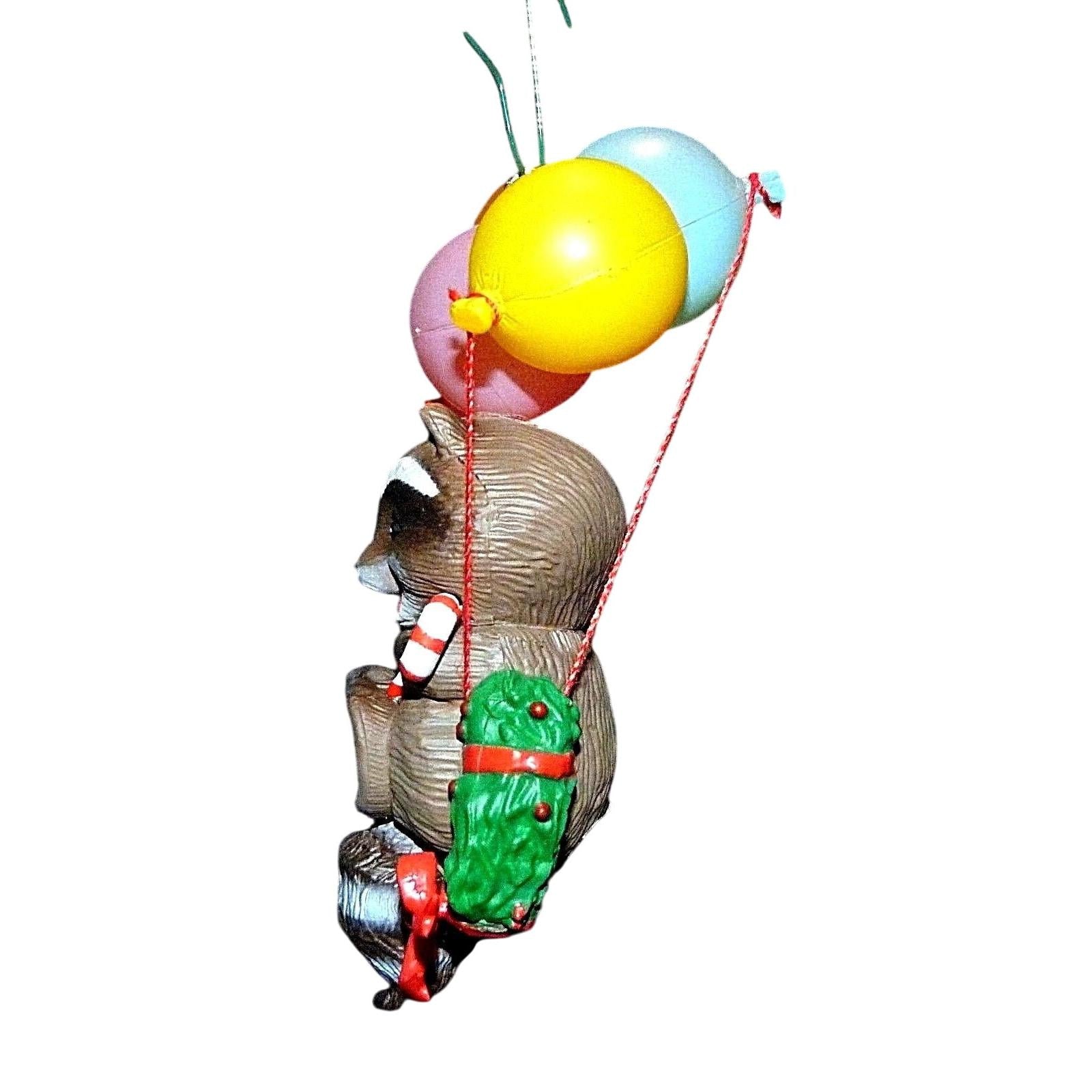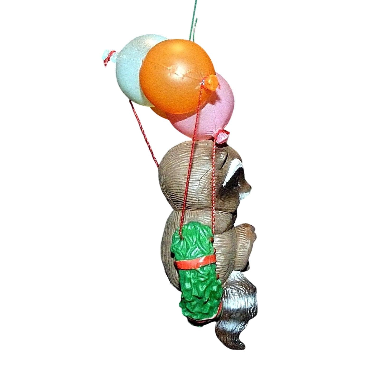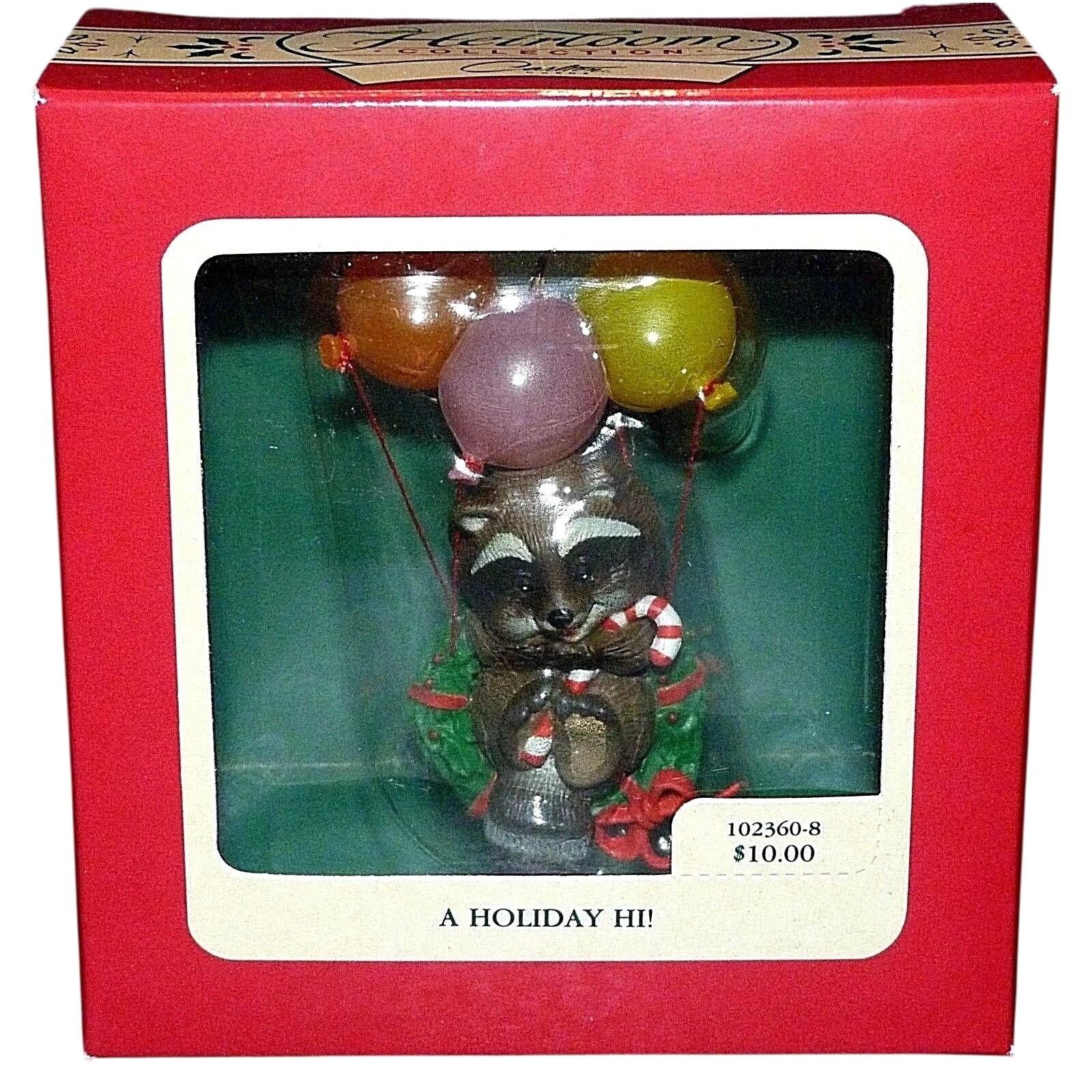 Celebrate timeless charm with this “A Holiday Hi!” ornament by Carlton Cards, introduced in 1990. It showcases an adorable raccoon clutching a holiday wreath while suspended by bright, pastel balloons—capturing warmth, festivity, and the playful spirit of the season. The package typically includes the original box—sometimes with slight wear—preserving its collectible appeal. No batteries, cords, or any power sources are needed—this figurine is purely decorative and ready to hang.