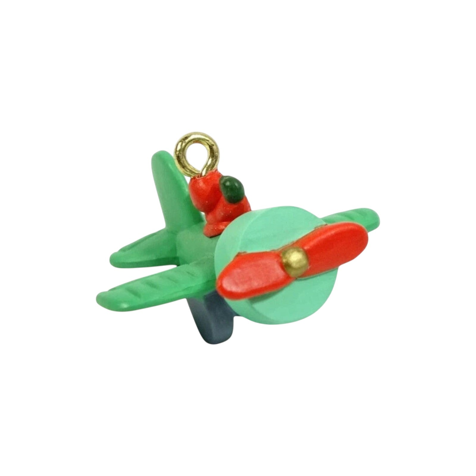 Take flight with Air Santa, a whimsical 1990 miniature ornament featuring Santa Claus piloting a bright green airplane adorned with a red propeller and the "90" tail marking. Crafted as a non-powered figural piece, this petite keepsake typically includes the original red-and-green box and hanging loop—no batteries or cords required for display