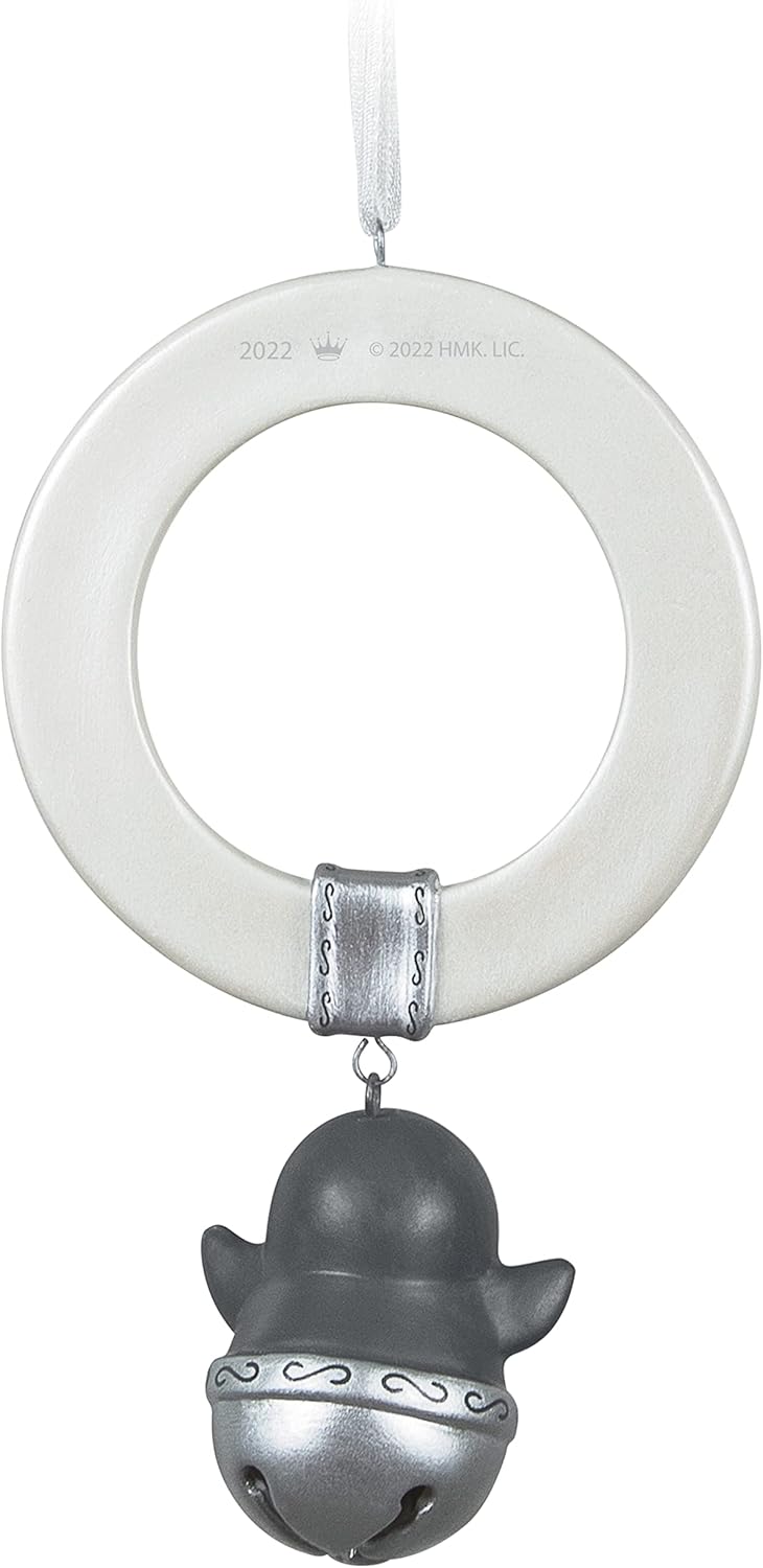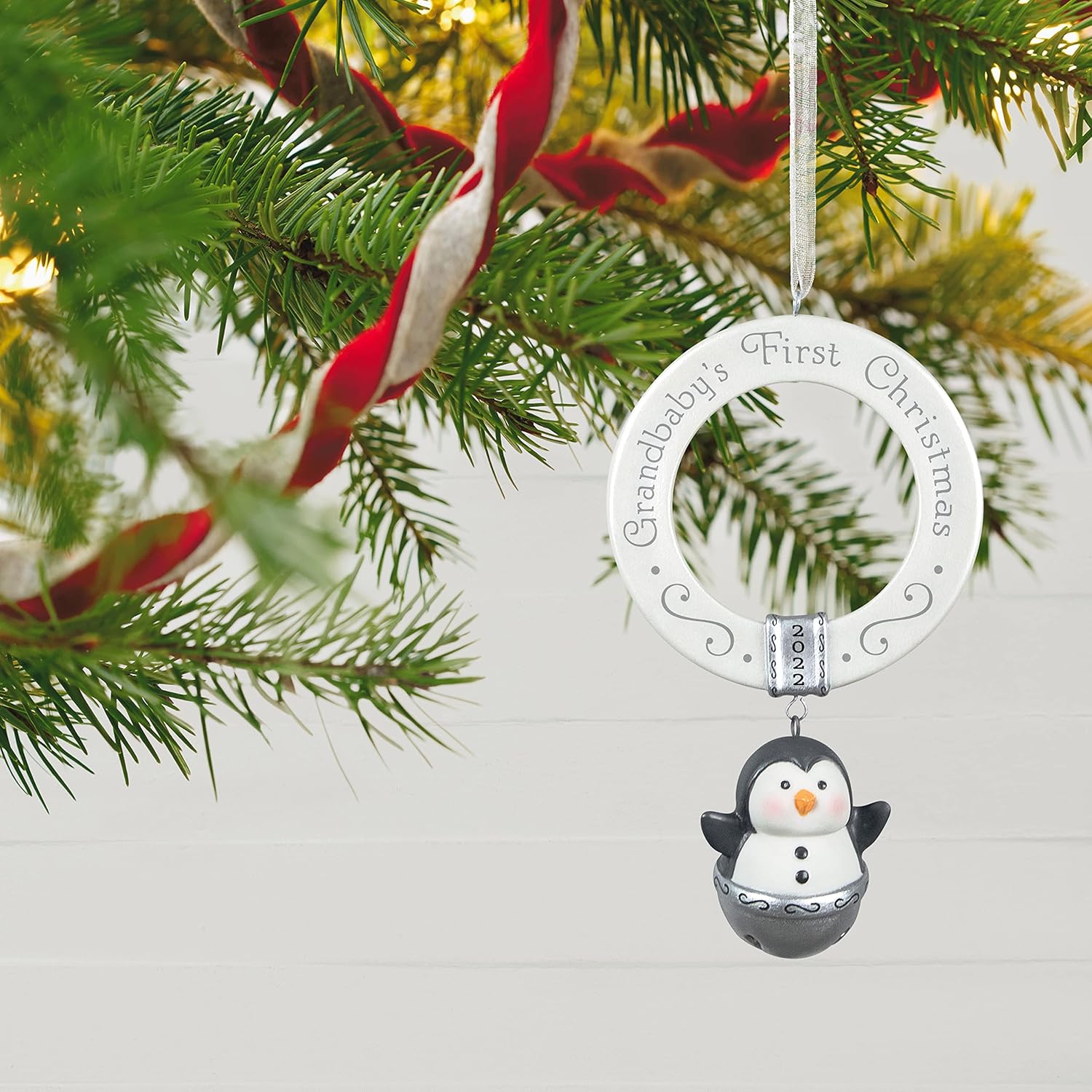 Cherish a grandchild’s first Christmas with this delightful 2022 keepsake ornament. It features a sweet penguin jingle bell suspended from a pearlescent ring, with shimmering accents and a graceful design that brings a soft holiday glow. The ring and penguin are crafted in porcelain, and the ornament is inscribed with “Grandbaby’s First Christmas 2022.”