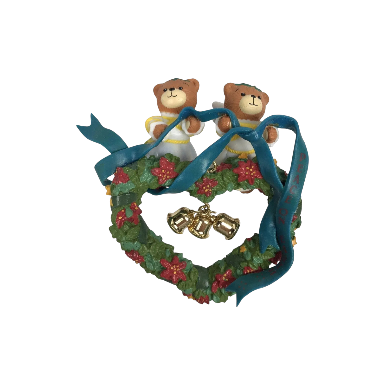 The 1990 Bearing Holiday Wishes ornament from Enesco delivers festive cheer with a cuddly twist. This charming holiday piece features an adorable teddy bear wearing a Santa hat and red scarf, peeking joyfully from the center of a lush, green Christmas wreath adorned with holly berries and a festive red bow. Expertly sculpted and hand-painted, the ornament captures the warmth and joy of the season. It comes complete with the original Enesco packaging, perfect for collectors and gift-givers alike. No cords, batteries, or lights are required—just heartwarming holiday spirit.