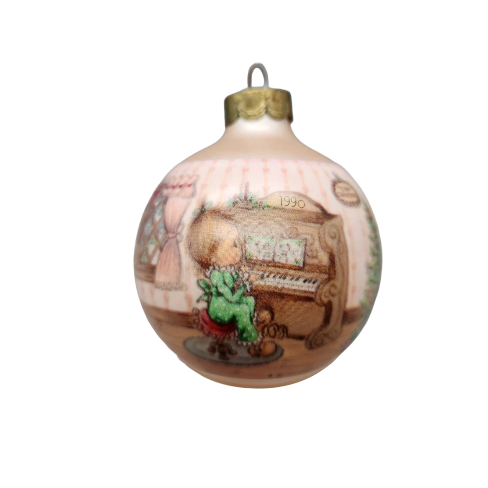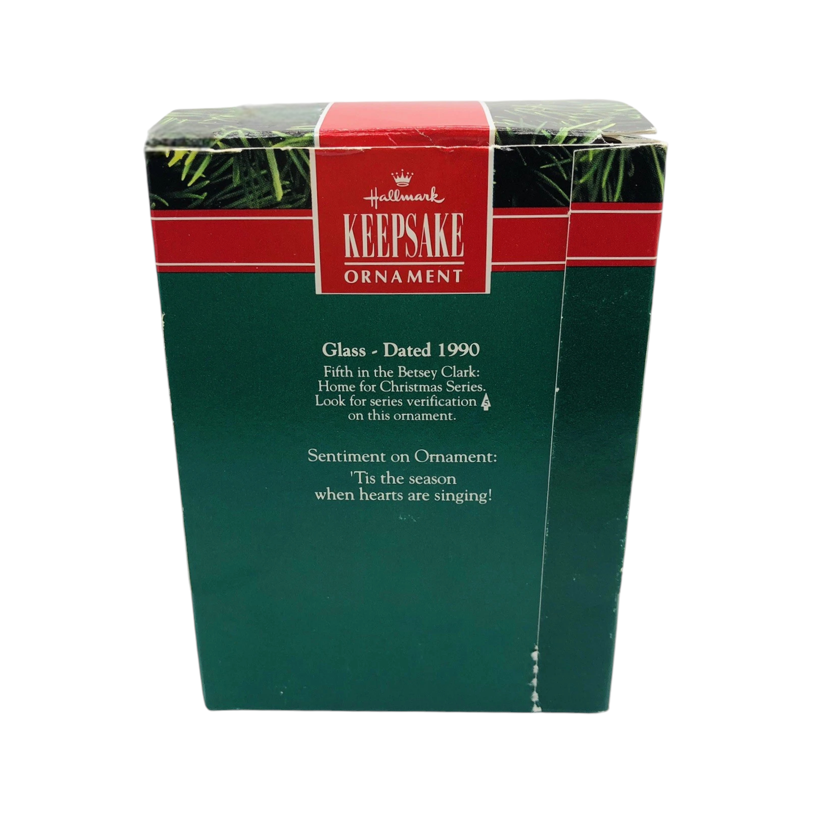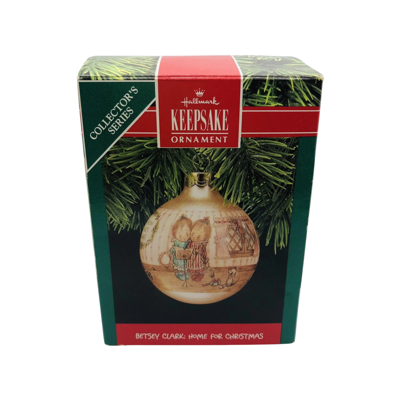 This 1990-dated piece by Betsey Clark is the fifth ornament in her “Home for Christmas” series, featuring a cozy folk-art-style house warmed by soft light and surrounded by children caroling in a winter scene. Rendered in vibrant colors and hand-painted glass, the design captures Clark’s signature nostalgic charm and evokes the joy of family and home at the holidays. Its traditional round bulb shape and date make it especially appealing to collectors of vintage Hallmark Keepsake ornaments. Whether displayed among other Betsey Clark ornaments or as a stand-alone tribute to holiday homecomings, it offers both decorative appeal and collector interest.