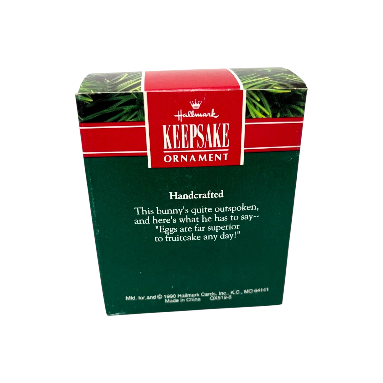 This vintage 1990 Keepsake ornament from Hallmark features a cheeky white bunny holding a red sandwich-board sign that reads “Bah Hum Bug” on the front and “Ban Fruit Cake” on the back. The whimsical design combines holiday humour with springtime imagery—a basket of pastel Easter eggs bundled to the bunny’s arm—creating a unique collectible that stands out in bunny or novelty-theme ornament collections. Artist’s name is credited as Julia Lee.