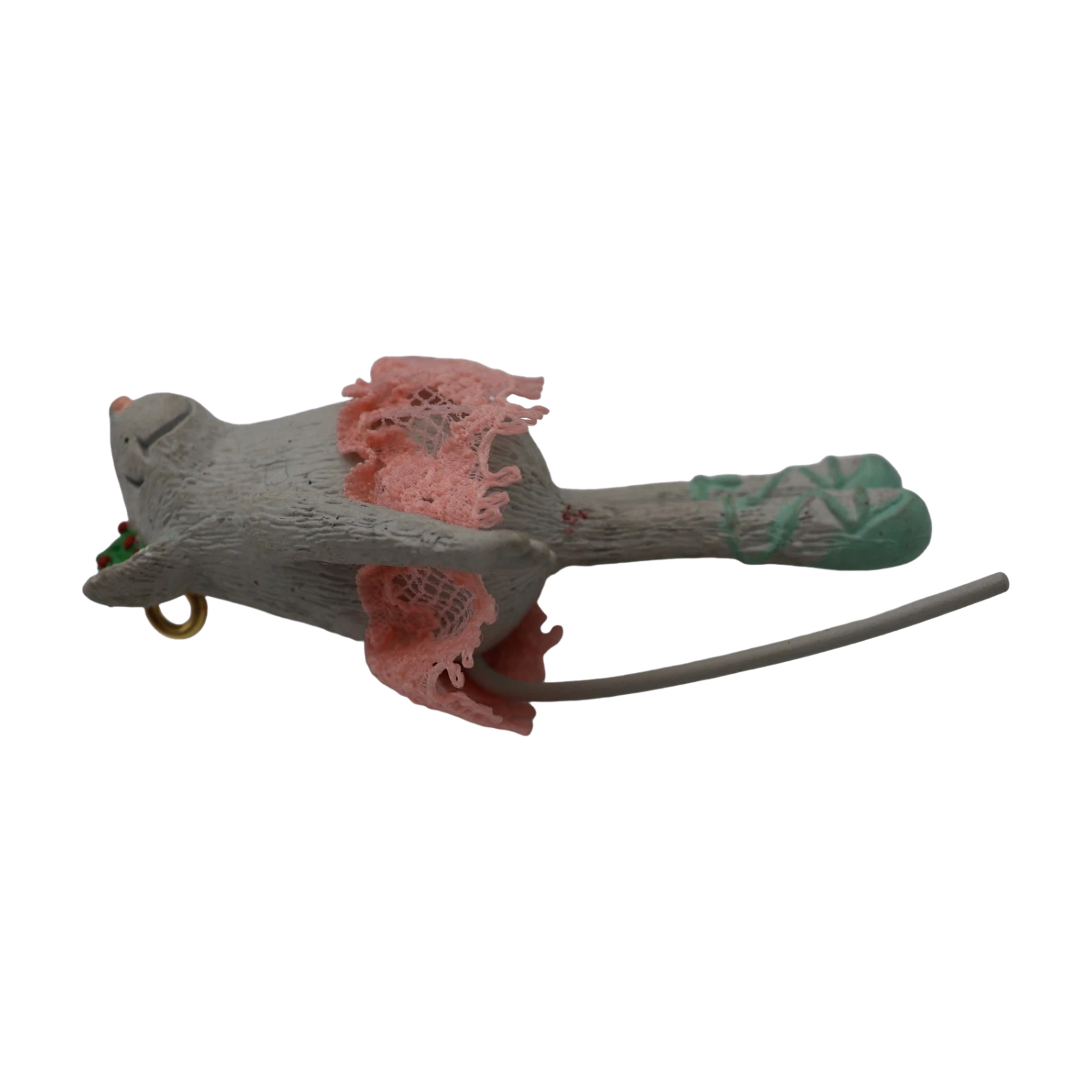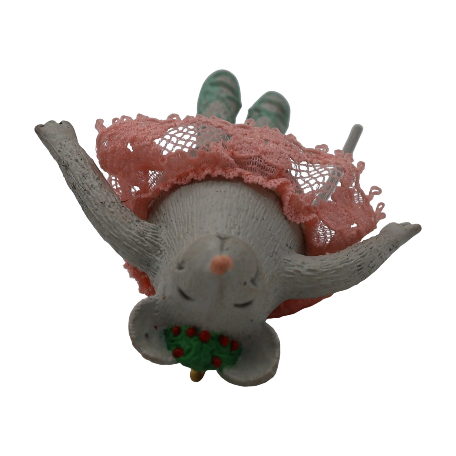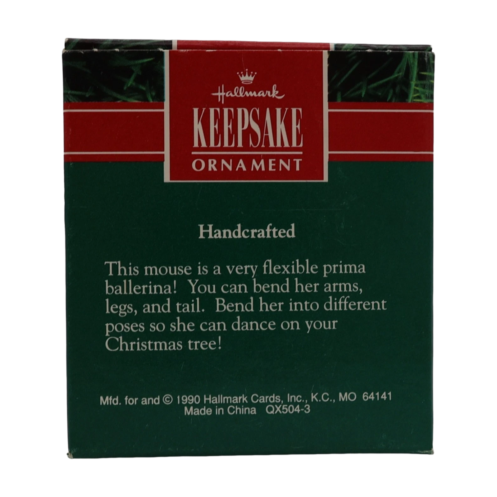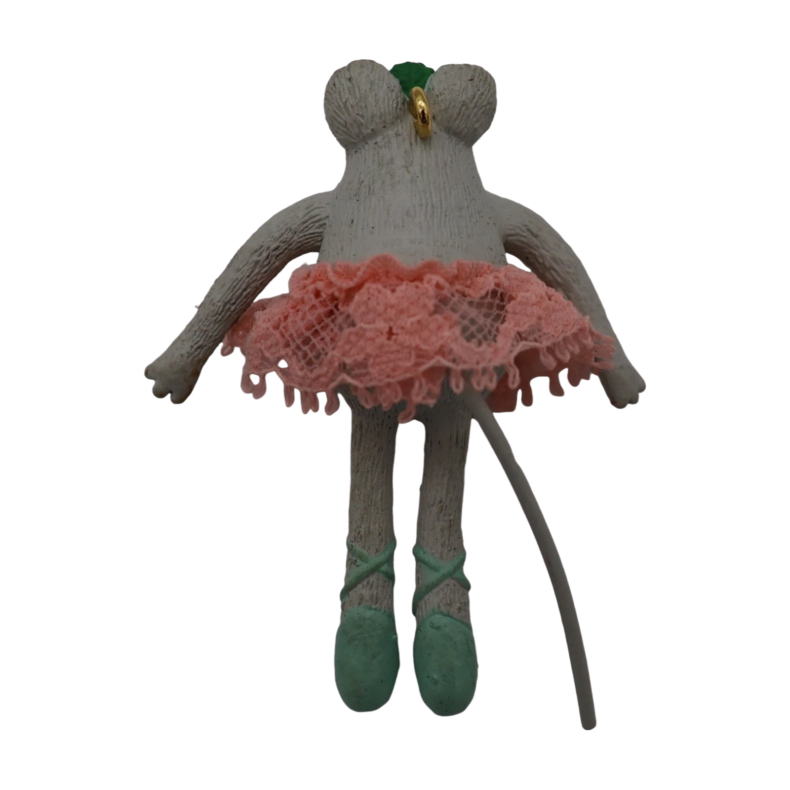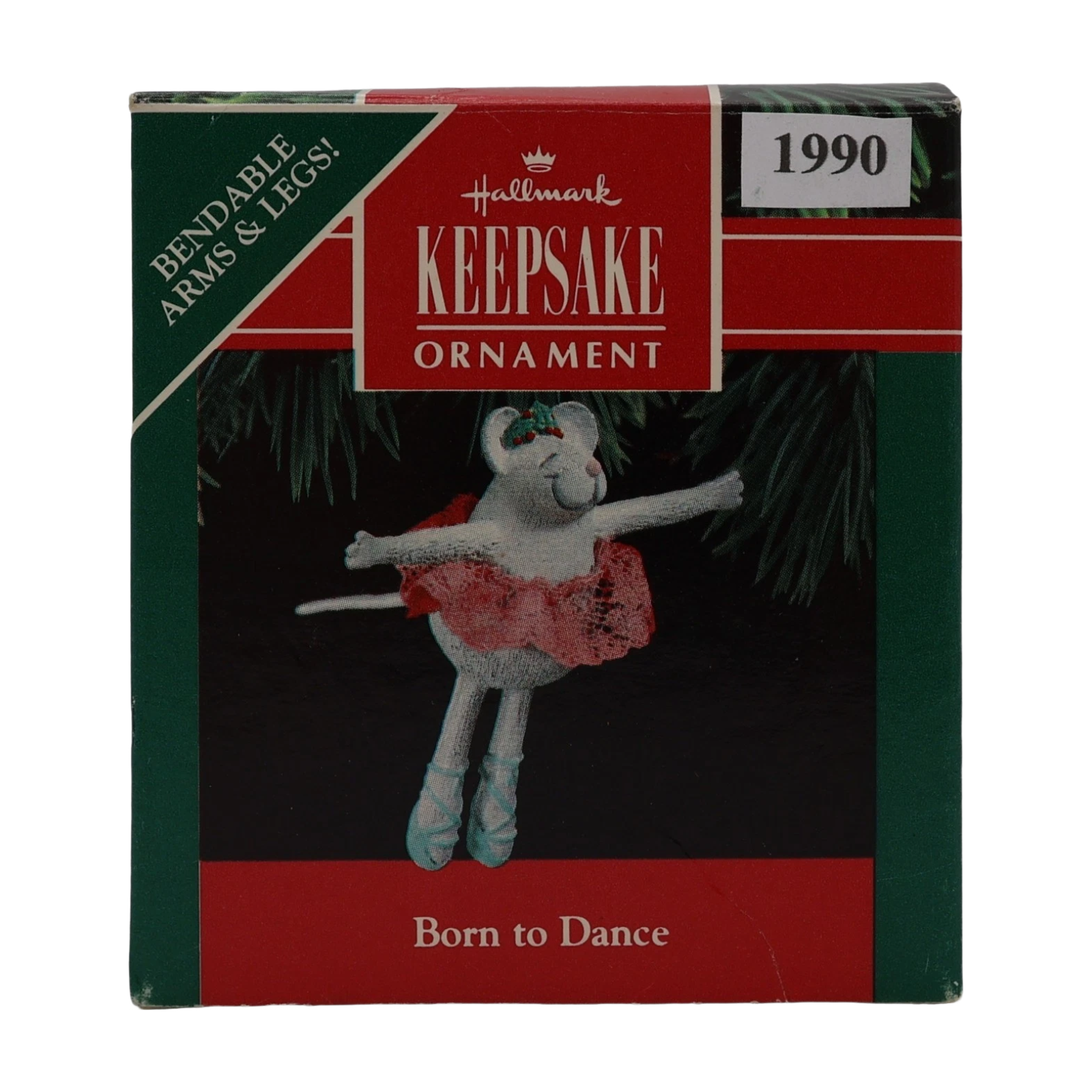 Delight in Born to Dance, a whimsical 1990 keepsake ornament showcasing a spry ballerina mouse dressed in a pink lace tutu and a sprig-of-holly tiara. Complete with bendable arms, legs, and tail, she strikes graceful dance poses with flair. Mint-in-box examples typically include the ornament, its original box, and hanging loop—this is a non-powered figural piece requiring no batteries or cords.