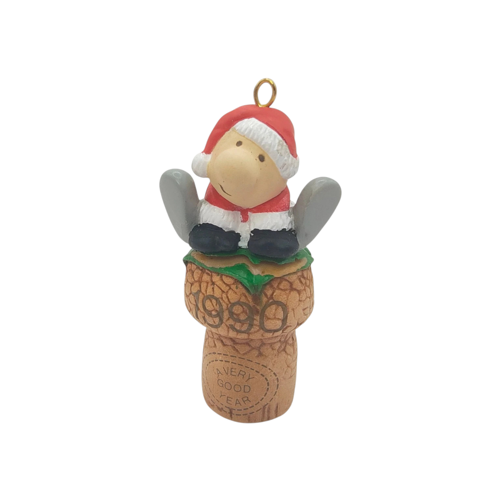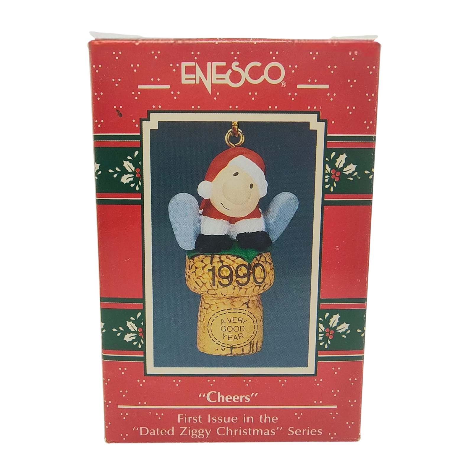 Celebrate the holiday season with humor and heart in the 1990 Cheers ornament from Enesco—marking the first issue in the delightful “Dated Ziggy Christmas” series. This festive collectible features the beloved comic character Ziggy holding a mug of hot cocoa, donning a Santa hat emblazoned with “1990.” His timeless grin and simple charm bring warmth to any tree or holiday display. Meticulously crafted in resin and hand-painted, the ornament comes in its original Enesco collector’s box. No power or lights are required—just Ziggy’s classic cheer to toast the season!