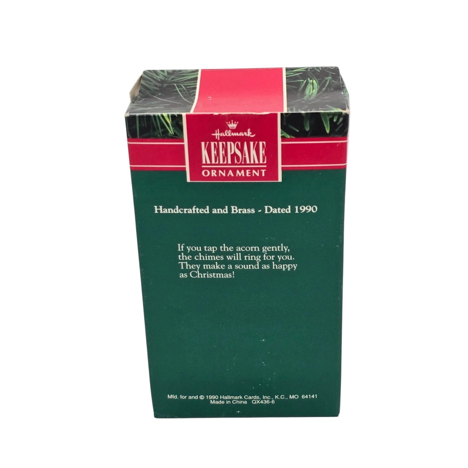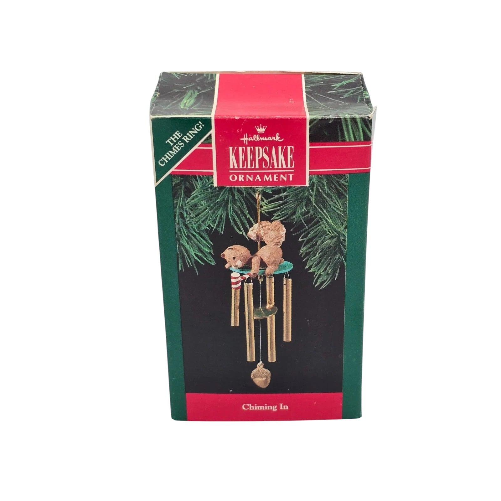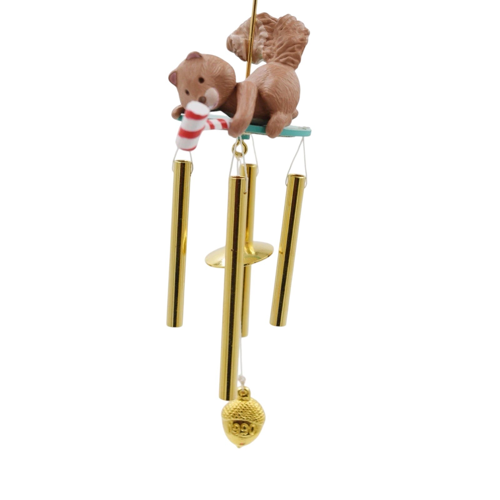 Experience festive charm with Chiming In, a playful 1990 miniature ornament featuring an animated squirrel perched atop real brass chimes. Using a candy-cane mallet, the squirrel gently taps the chimes to ring like a miniature wind chime display. Mint-in-box sets typically include the ornament, original box, hanging loop, and mallet—no batteries or cords required, as it operates manually by tapping the acorn-tone.