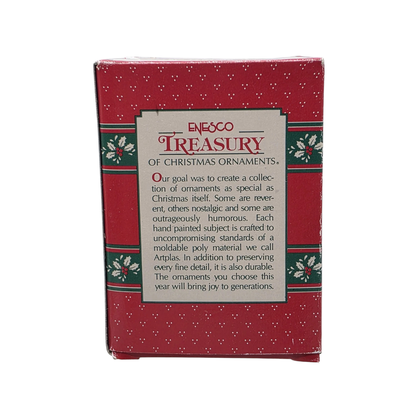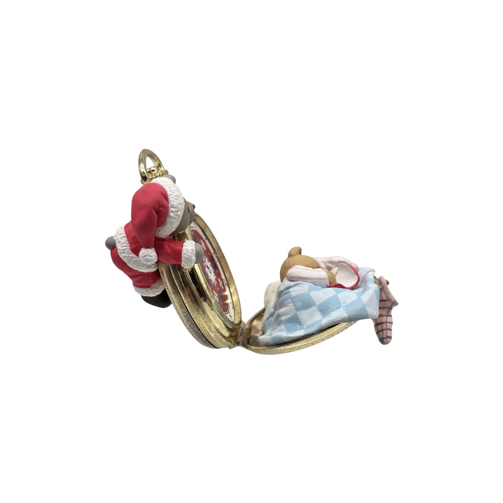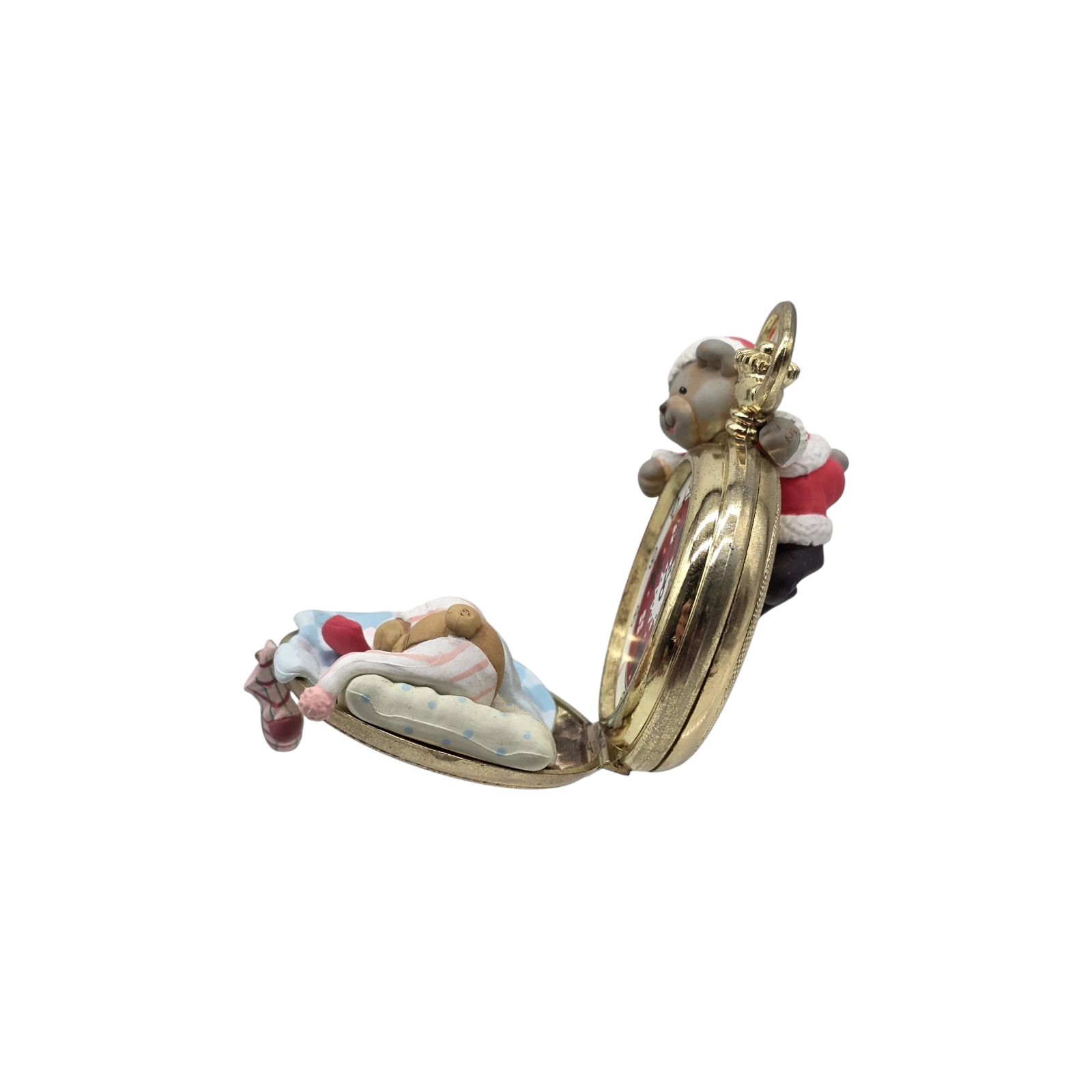 This whimsical collectible ornament features a sweet little bear dozing atop a classic pocket-watch style clock face, marking the countdown to Christmas in charming vintage style. Crafted with a hand-painted finish and molded plastic body, this keepsake captures both the magic of the holiday season and the nostalgic appeal of late-1980s/early-1990s design. Ideal for holiday décor, collectors of countdown-themed ornaments, or anyone seeking a timeless piece to hang each year.