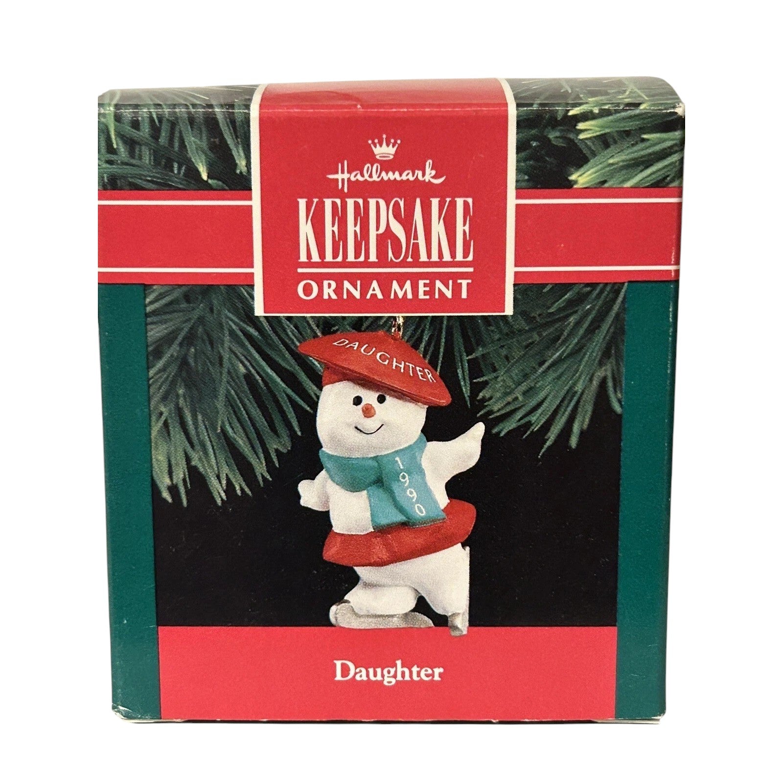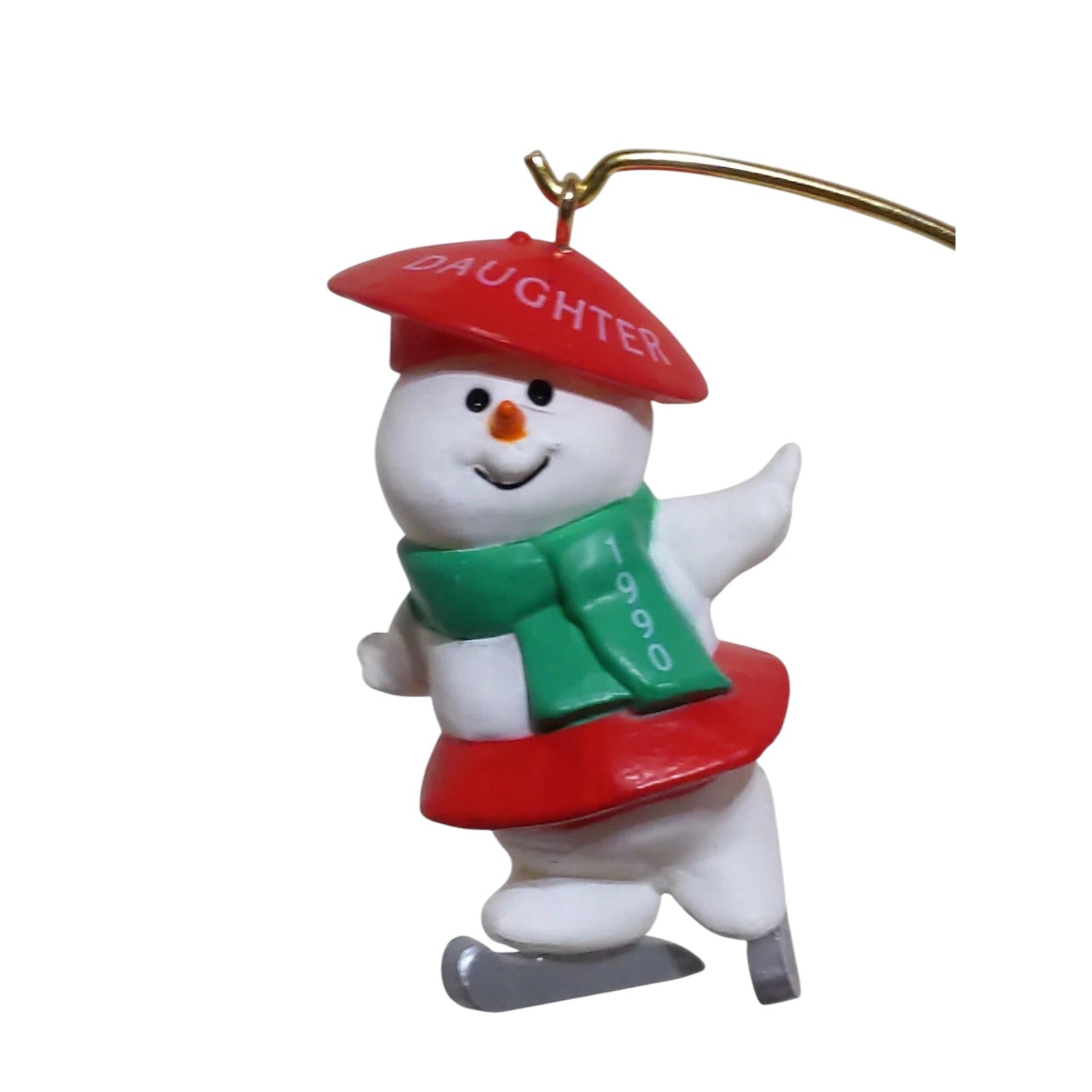 Celebrate your daughter with a touch of winter wonder using this charming 1990 Daughter (Family) ornament. The adoring snowgirl, adorned with a festive red hat labelled “Daughter” and a teal scarf embroidered with “1990,” twirls gracefully on ice. Crafted by artist Bob Siedler, this miniature keepsake captures both nostalgia and familial love. Mint-in-box versions are perfect for collectors or sentimental decorations. No batteries or cords required—just hang and let her frosty smile warm your heart.