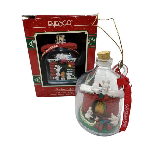 Bring playful warmth to your holiday decor with the 1990 Fireplace Frolic ornament from Enesco. This adorable piece features a mischievous little mouse peeking from a red Christmas stocking as it dangles from a festively decorated stone fireplace. Complete with garland, bows, and sculpted brick detailing, this ornament captures the cozy spirit of Christmas with a dash of whimsy. Hand-painted and crafted in sturdy resin, it’s a charming addition to any ornament collection. Comes with the original Enesco box. No lights, cords, or batteries—just holiday cheer in miniature form.