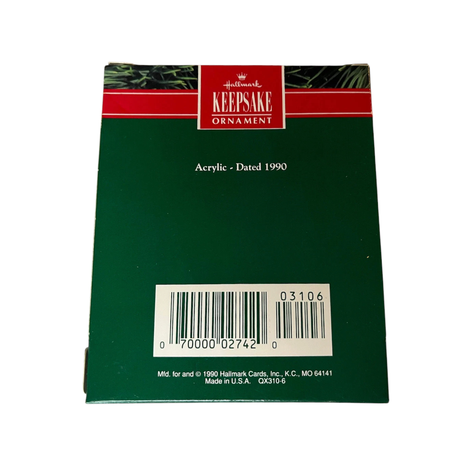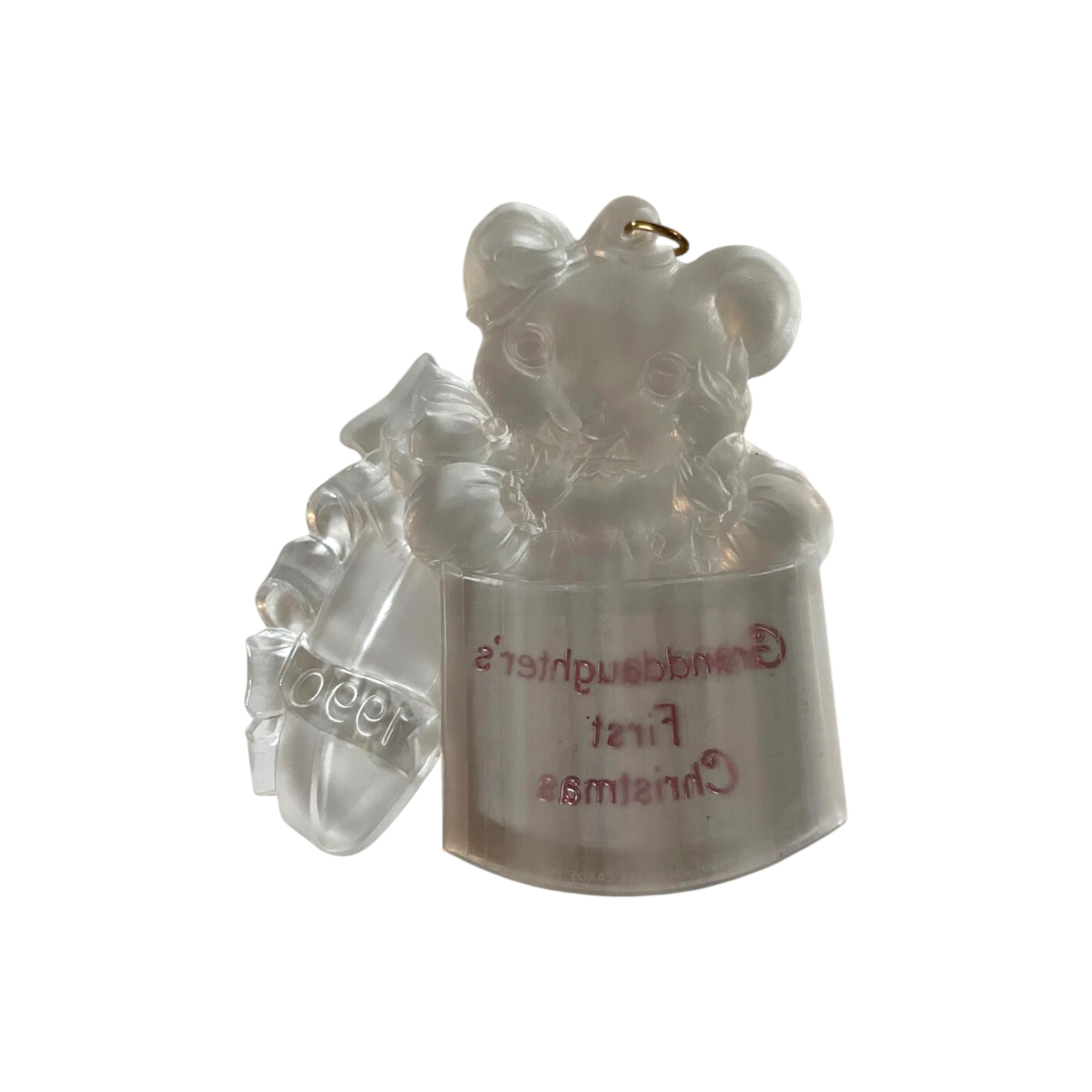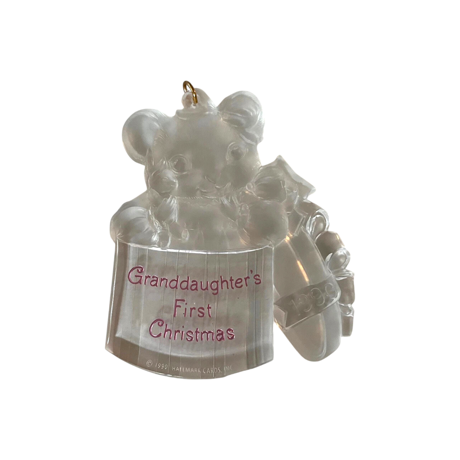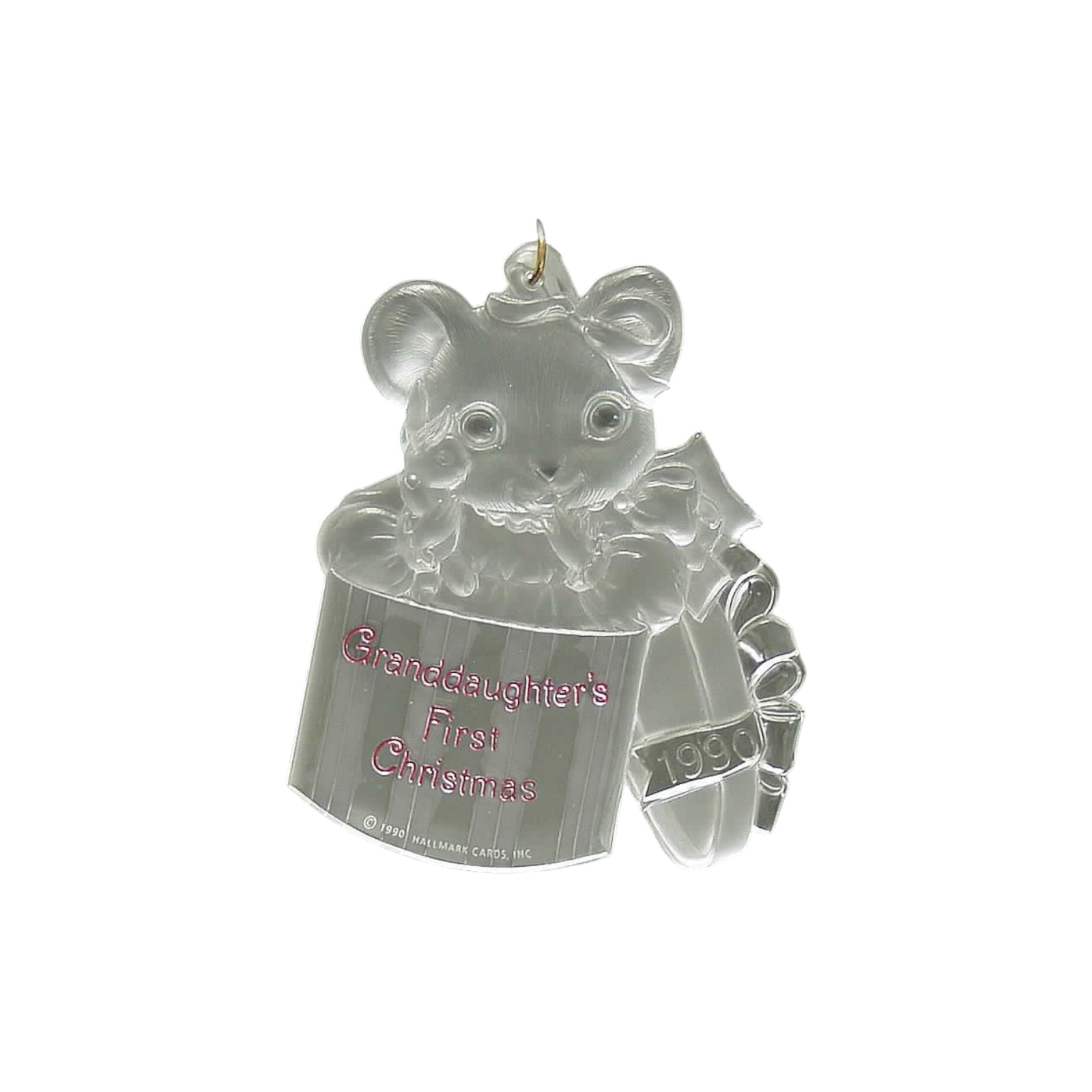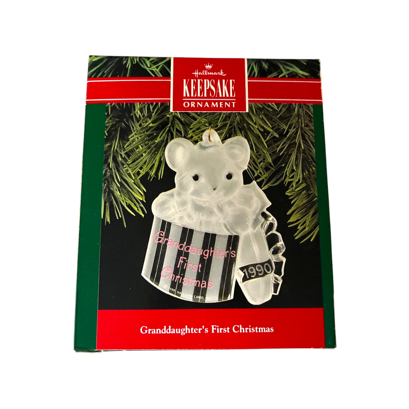 This sentimental 1990 edition of the Hallmark Keepsake ornament celebrates the milestone of a granddaughter’s first Christmas. Featuring a charming baby mouse peeking out of an acrylic box marked “Granddaughter,” the pastel-toned design conveys warmth and childhood charm. Crafted in lightweight clear acrylic, the flat profile makes it ideal for hanging on a tree or adding to a “first-year” memory display. The simplicity of the piece lends it universal appeal for grandparents, parents, and collectors alike.