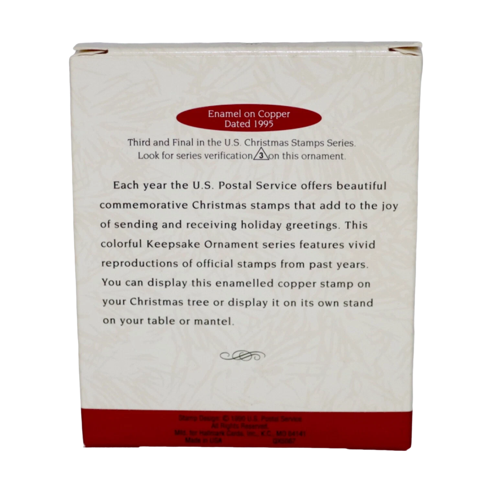 Celebrate holiday nostalgia with the 1990 U.S. Christmas Stamps ornament, designed as a replica of the 25¢ U.S. Postal Service Christmas stamp featuring a decorated evergreen against a bold red background and the word “Greetings” beneath. This enamel-on-copper ornament comes with a display stand and the original Collector’s Series box and gold-tone hanger loop when in mint-in-box condition. No power is required—just hang or display this charming tribute to vintage Christmas postage design.