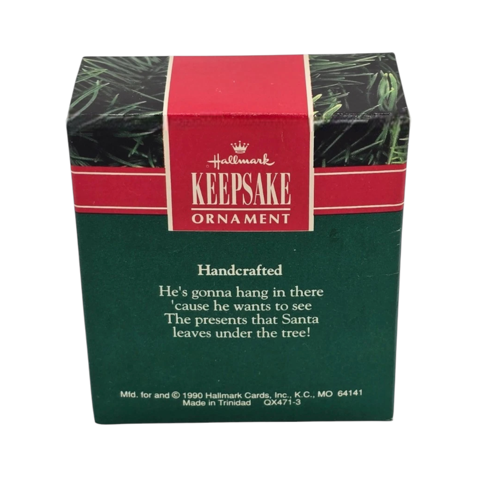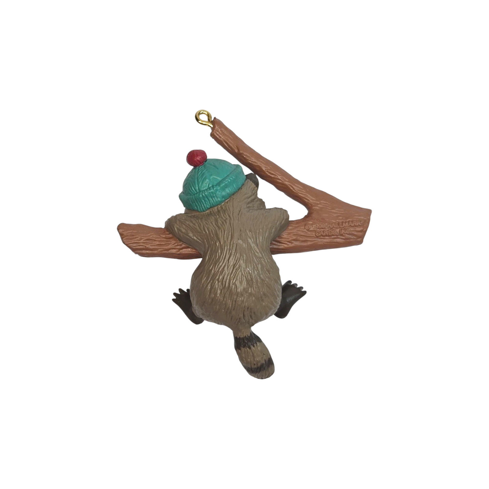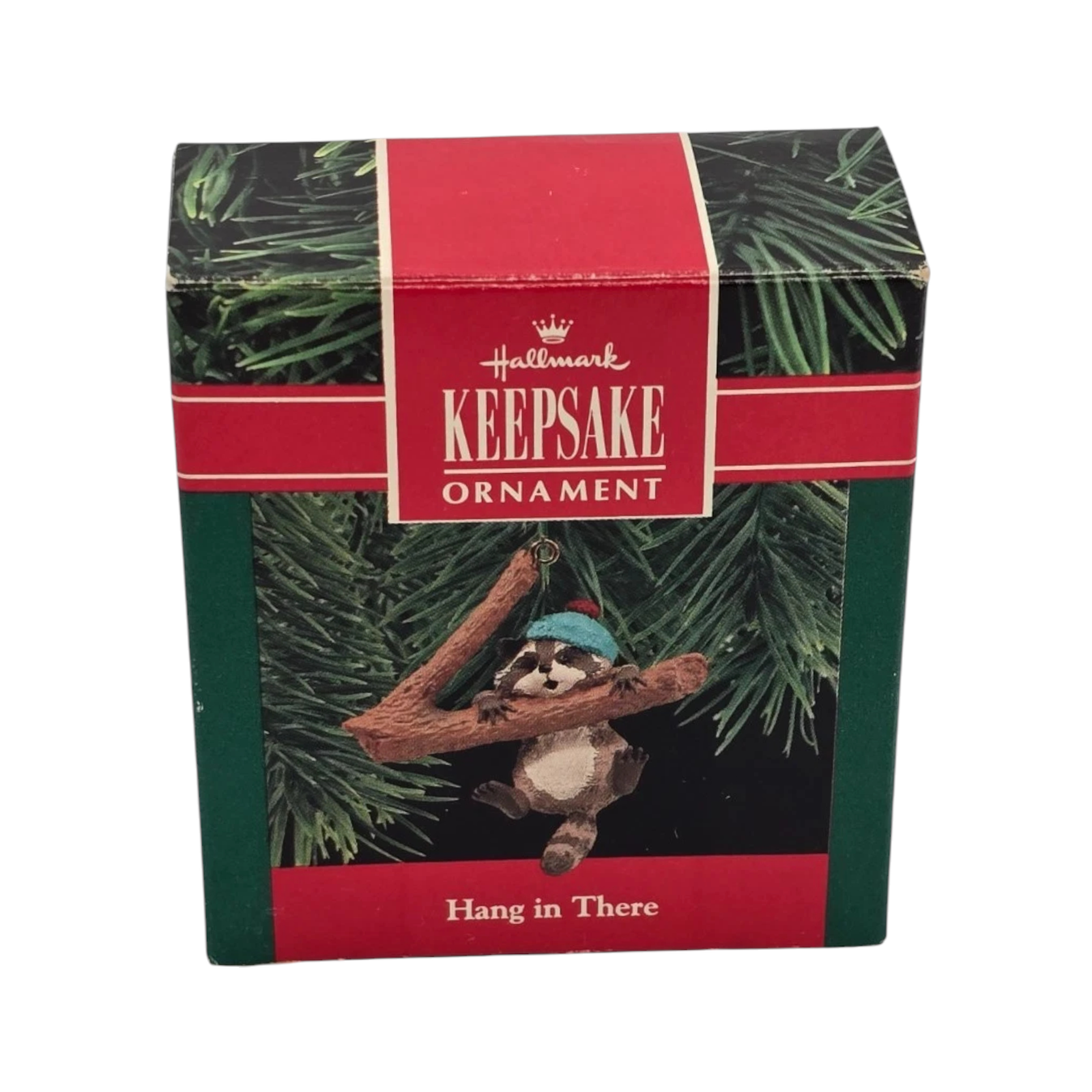 Cheerful resilience embodied in miniature form, Hang in There showcases a playful raccoon wearing a teal knit cap as he clings to a tree branch—his tiny silhouette a heartwarming nudge to persevere. Originally released in 1990, this non-powered keepsake typically includes the ornament, original dated box, and hanging loop—no batteries or cords required.