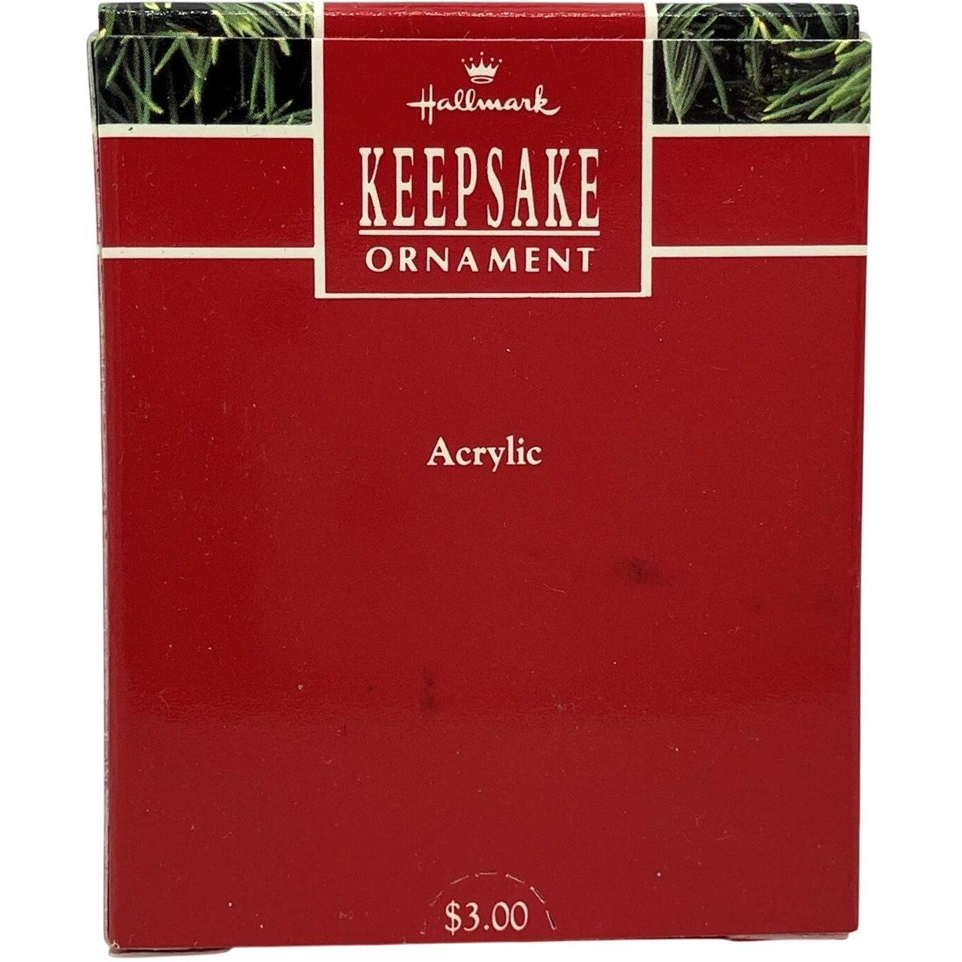 This elegant 1990 ornament features a clear, teardrop-shaped acrylic drop with a beautifully etched cardinal perched on a pine sprig—captured in frosted detail that glimmers in winter light. It arrives in its original miniature Keepsake Ornament box (typically green/red labeled "Miniature" and the ornament name), often including a hanging loop ribbon insert. No batteries, cords, or light strings are necessary—this minimalist jewel is a static beauty offering classic sophistication.