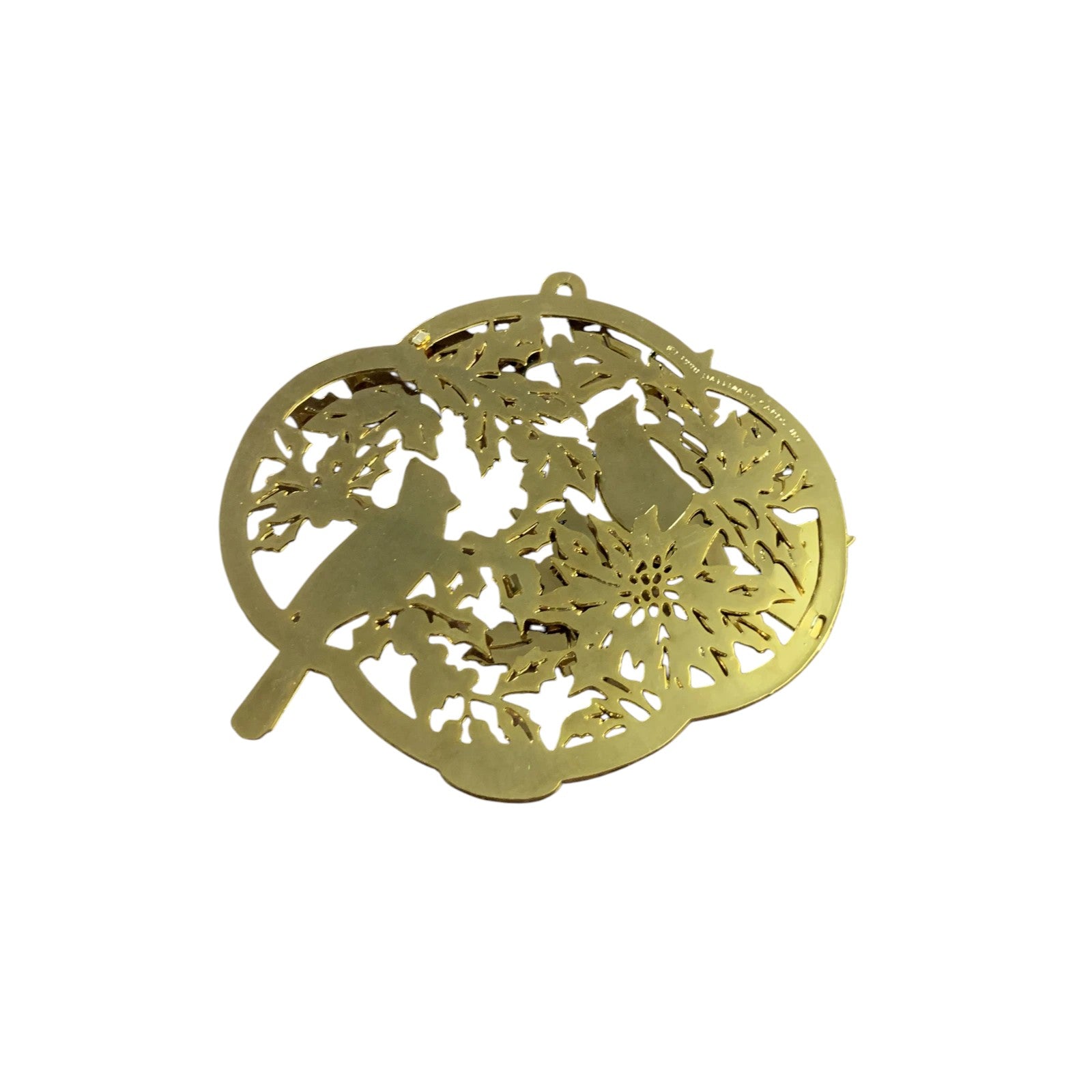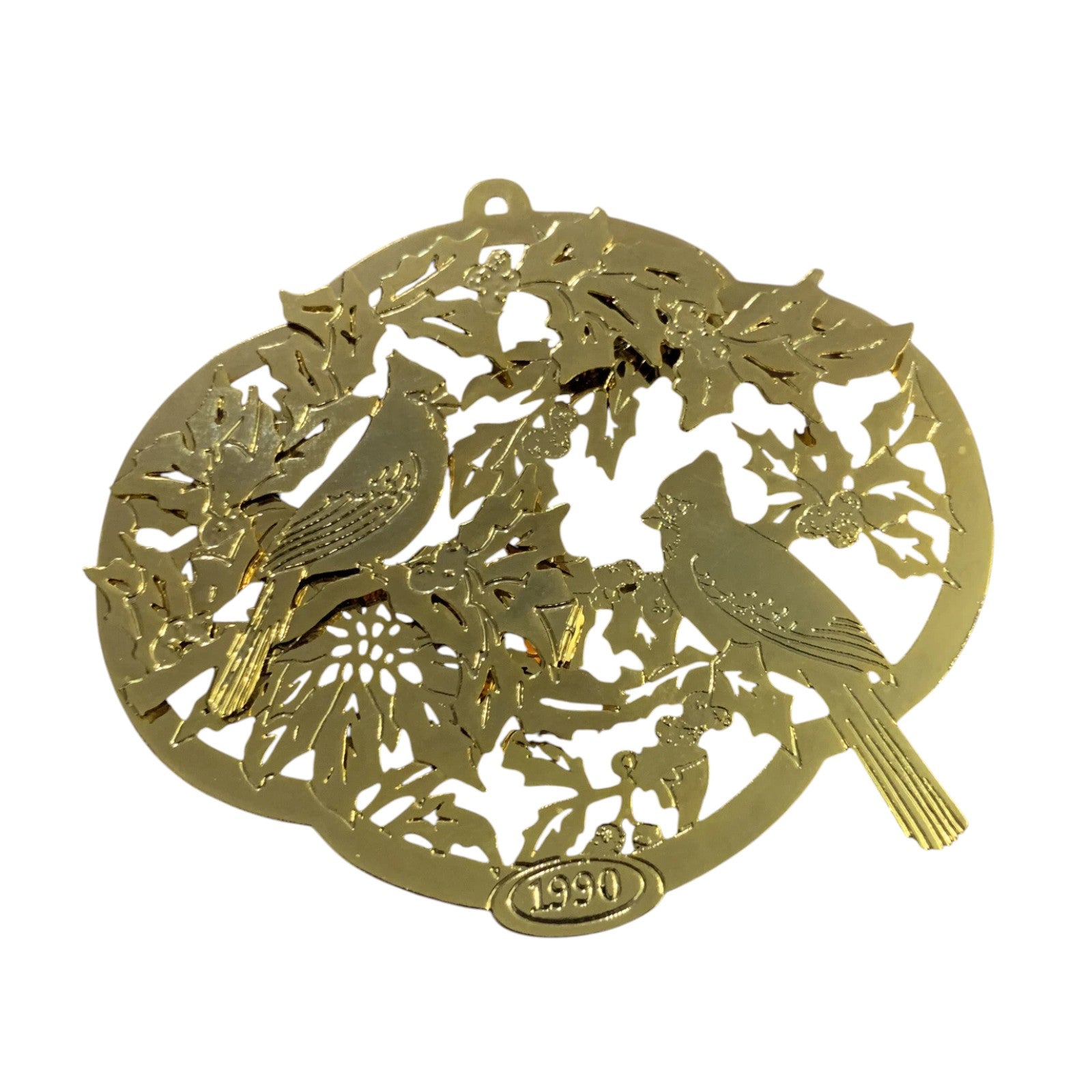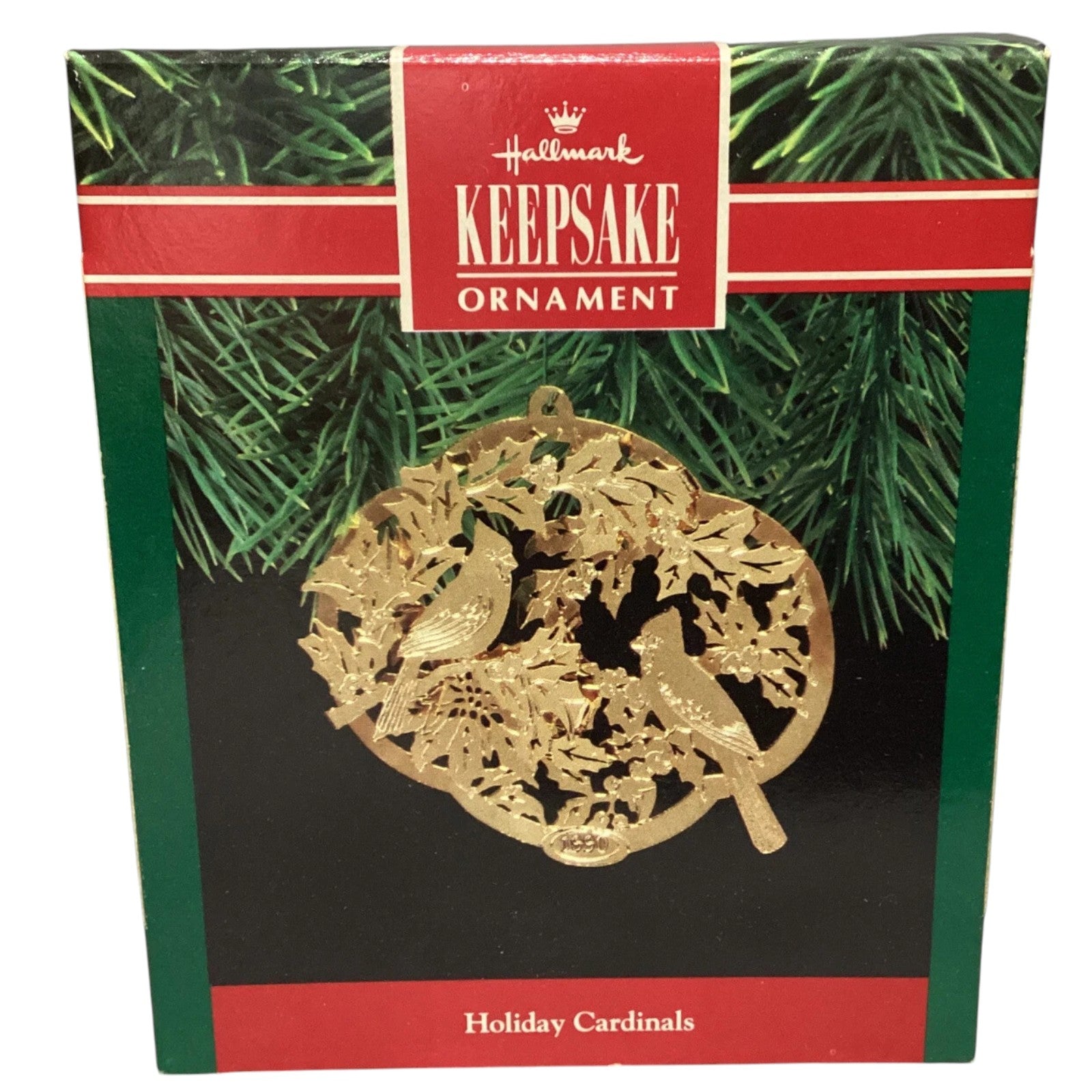 This refined 1990 ornament showcases two beautifully etched cardinals perched amid holly and pine, crafted in dimensional brass for layered depth and classic elegance. Hung from its original green‑and‑red Keepsake Ornament box—typically including the display ribbon—the piece delivers vintage charm without any need for batteries or cords. A truly timeless static collectible.