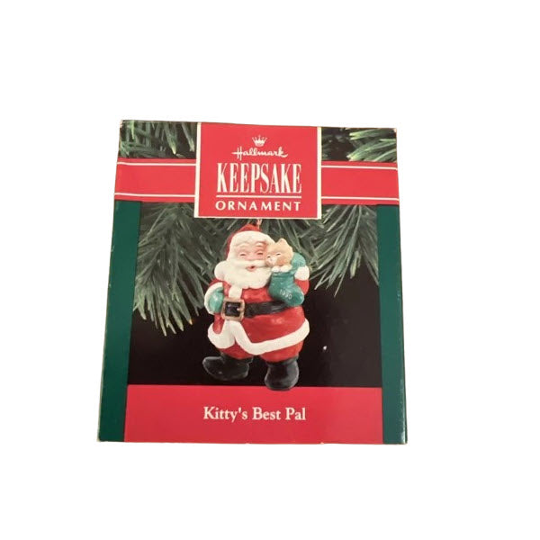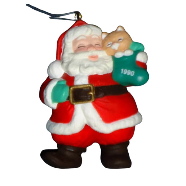 This heartwarming 1990 ornament features Santa cheek-to-cheek with a tiny kitten nestled inside a green stocking stamped “1990.” Designed by John “Collin” Francis, it captures a sweet festive moment full of holiday warmth and companionship. Packaged in its original Collector’s Series box—complete with Hallmark styling, hanging ribbon, and dated insert—it requires no batteries, cords, or lights. A charming static resin collectible perfect for collectors and cat lovers alike.