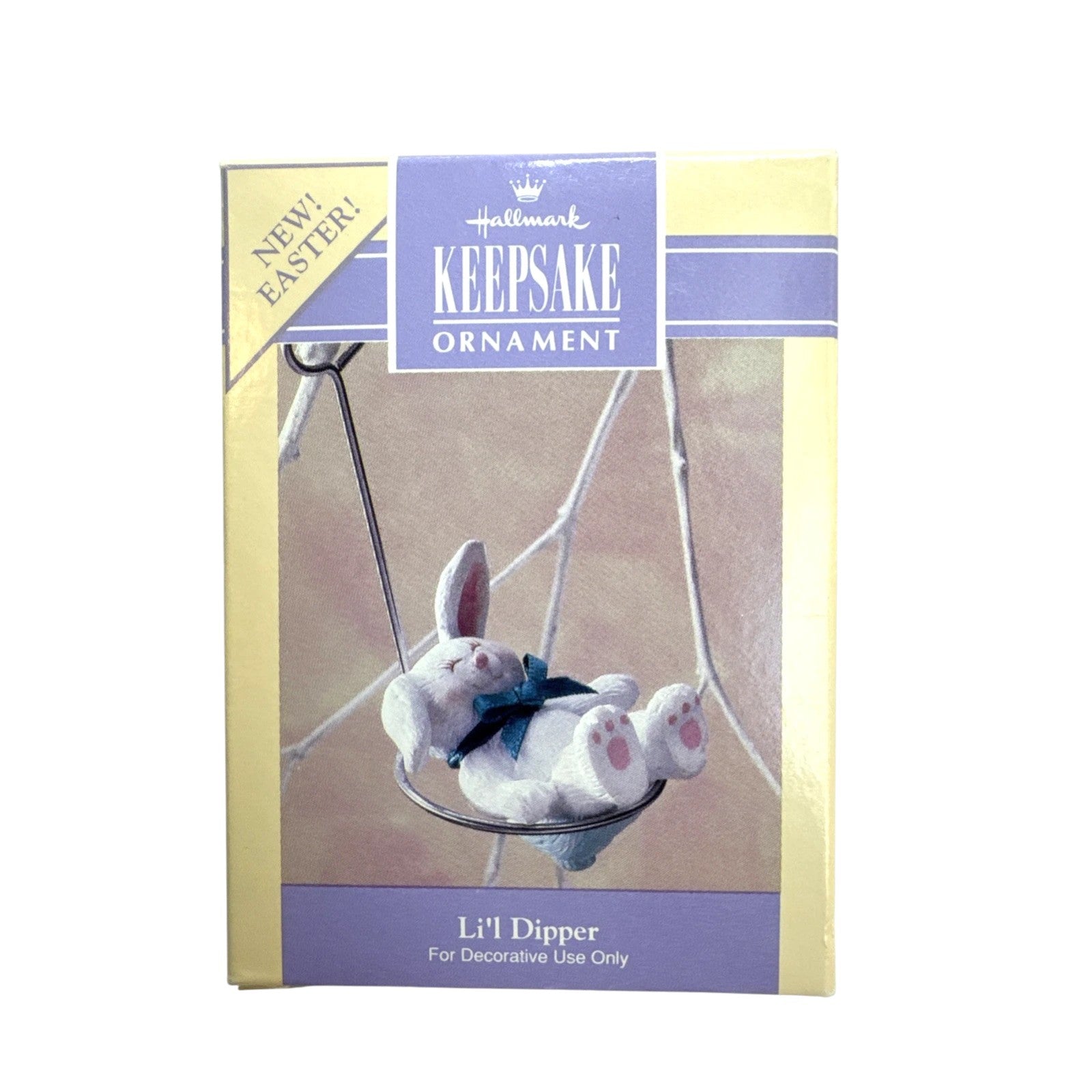 This adorable 1990 Li’l Dipper ornament features a sweet white bunny contentedly dipping its tail into a colorful Easter egg dye dipper—capturing seasonal whimsy at its finest. Often sold mint-in-box with the original tag and presentation box, this charming keepsake includes everything shown: the figurine and full packaging. No batteries, cords, or adapters are needed—this is a purely decorative miniature Easter ornament.