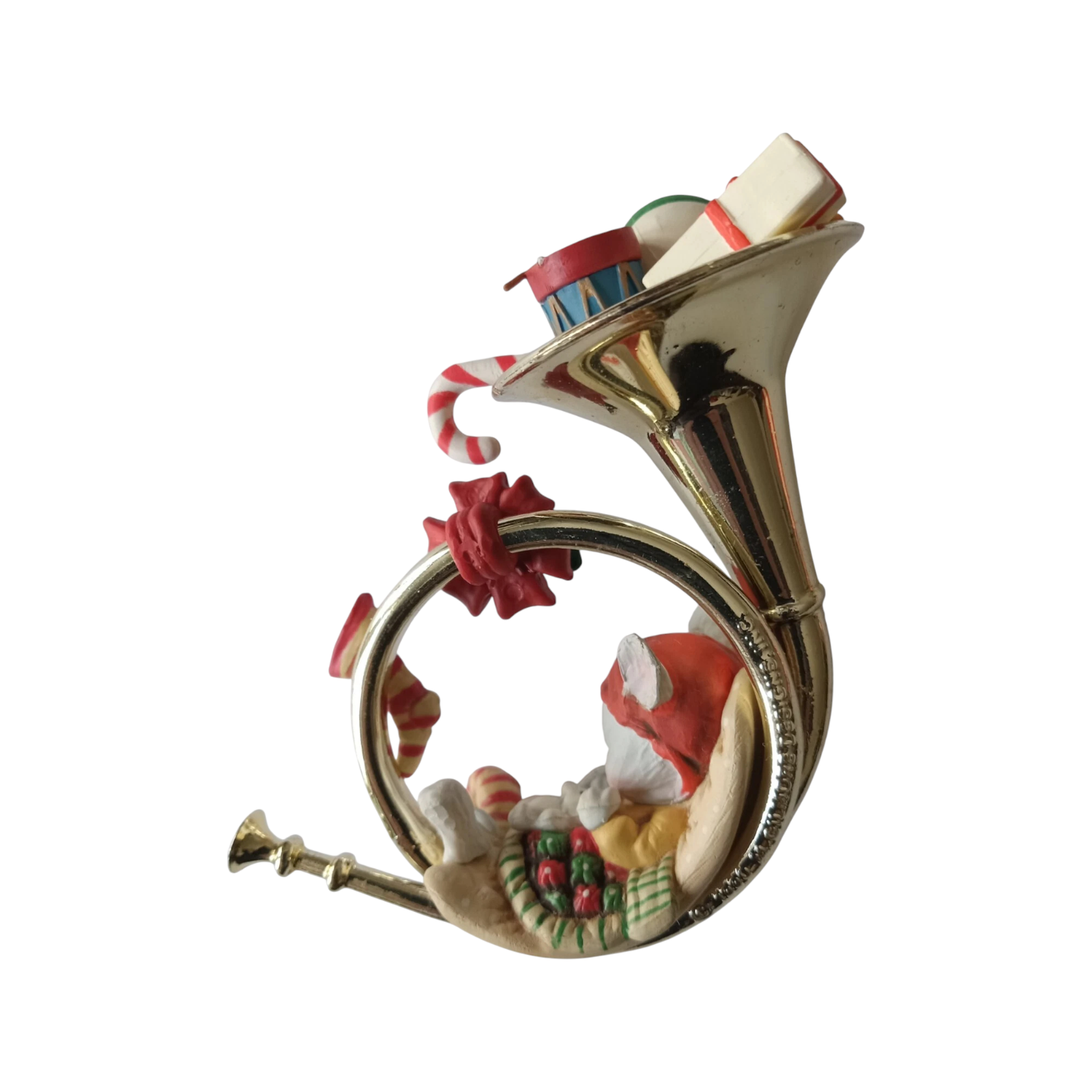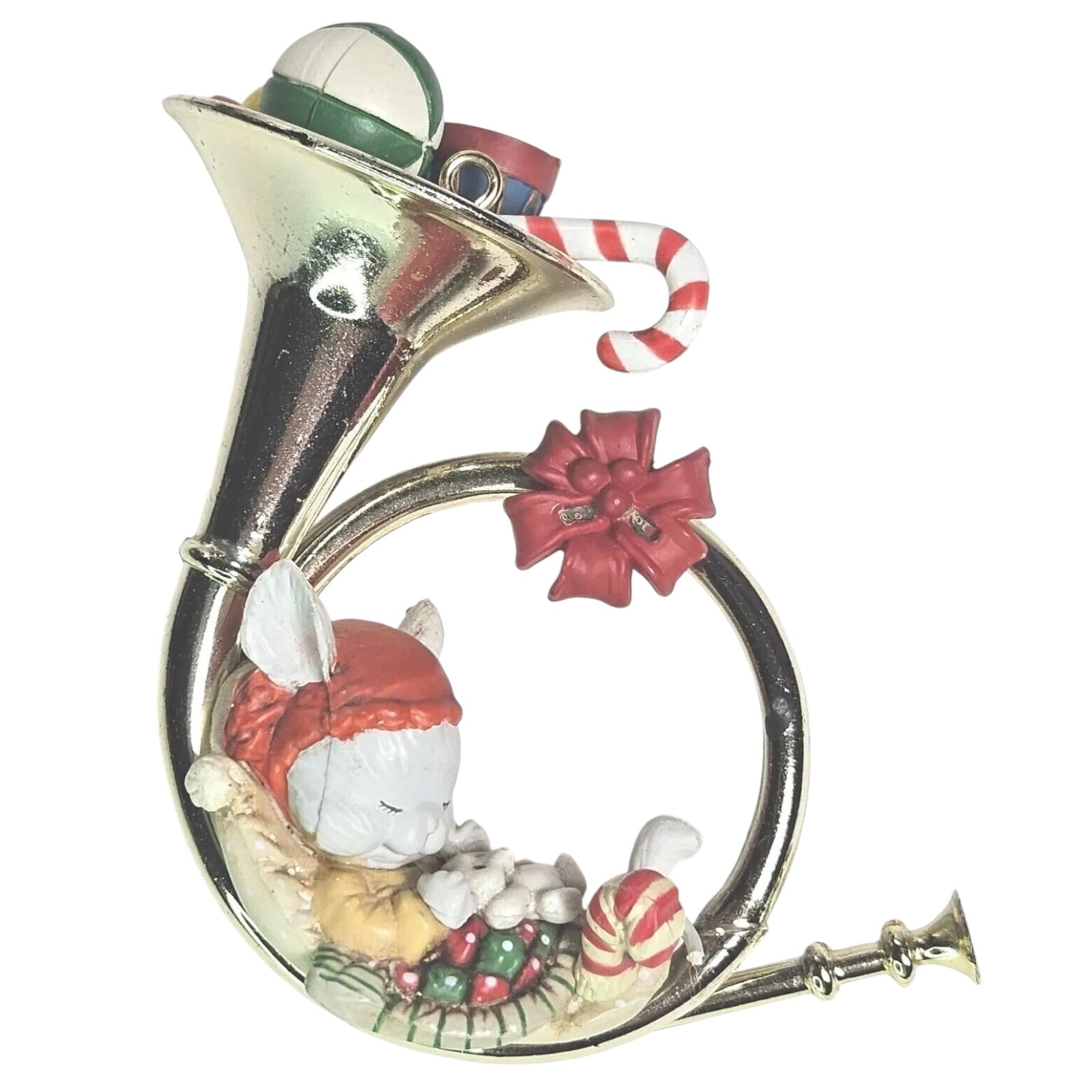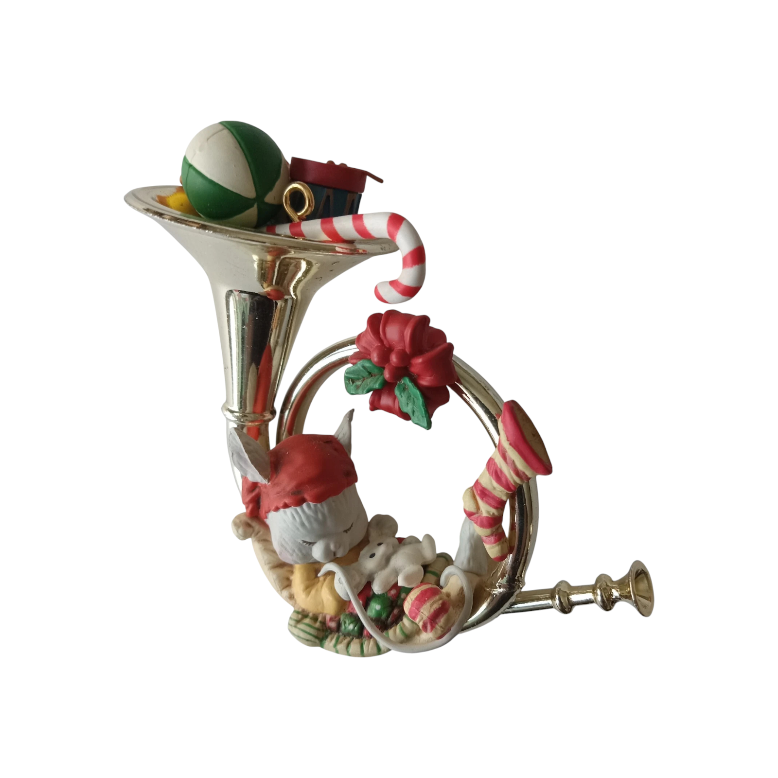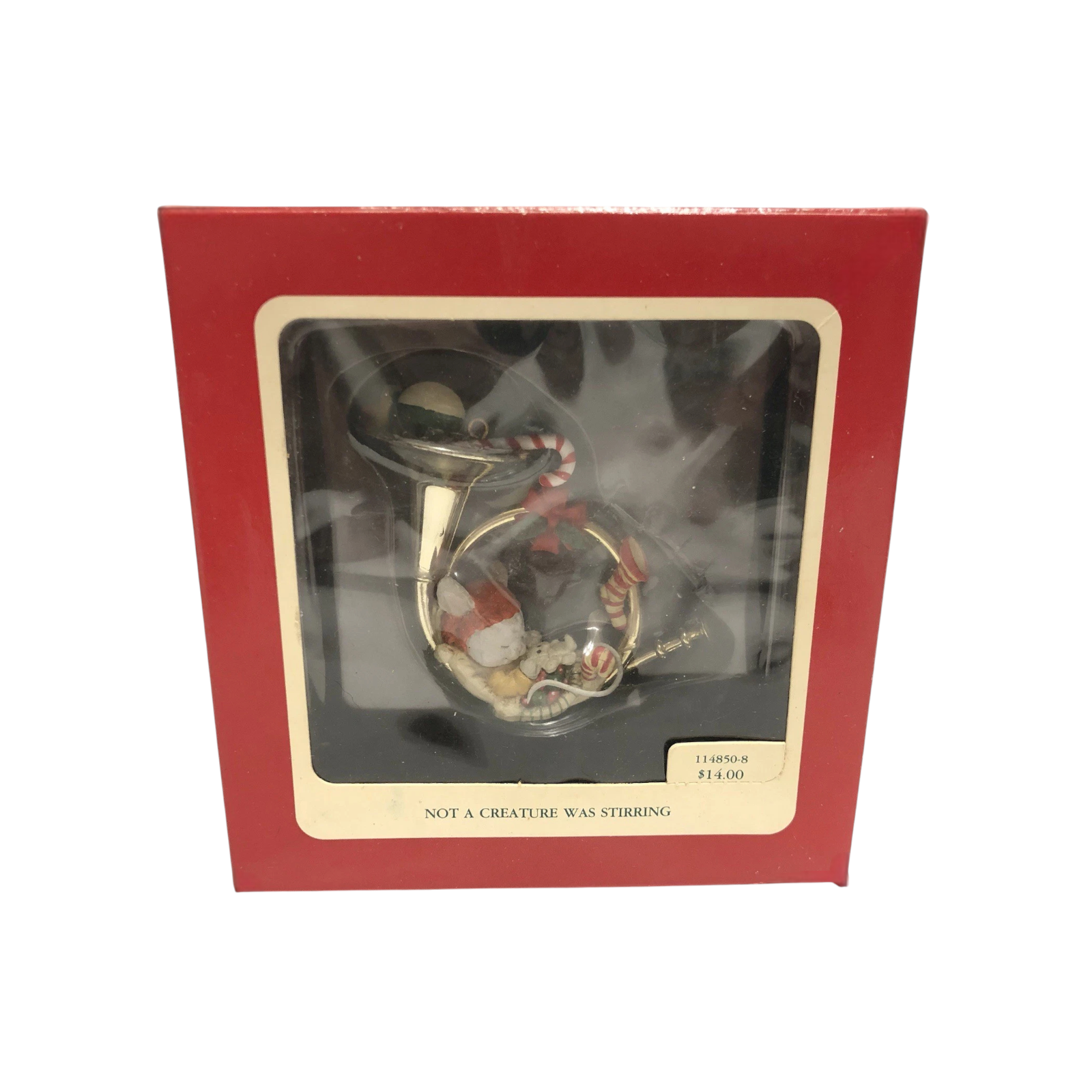 This 1990 Not a Creature Was Stirring ornament from Carlton Cards captures a peaceful Christmas Eve moment with an adorable sleepy mouse nestled into a cozy holiday setting. Sculpted with gentle fur texture, a tiny nightcap, and warm seasonal colors, the mouse rests quietly beside classic Christmas elements such as a stocking, candle, or wrapped gift—beautifully echoing the famous line from ’Twas the Night Before Christmas. The molded plastic design showcases Carlton’s early-1990s craftsmanship, blending storytelling charm with nostalgic holiday warmth. Perfect for mouse enthusiasts, literature-inspired collectors, and fans of whimsical vintage ornaments, this piece brings a soft, heartwarming touch to any tree or display.