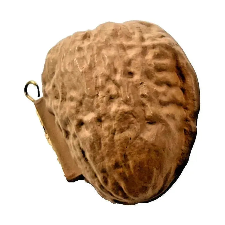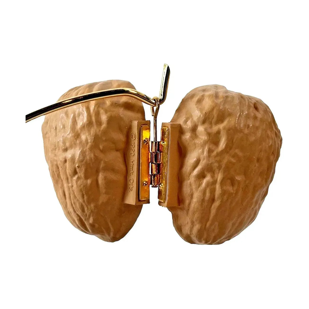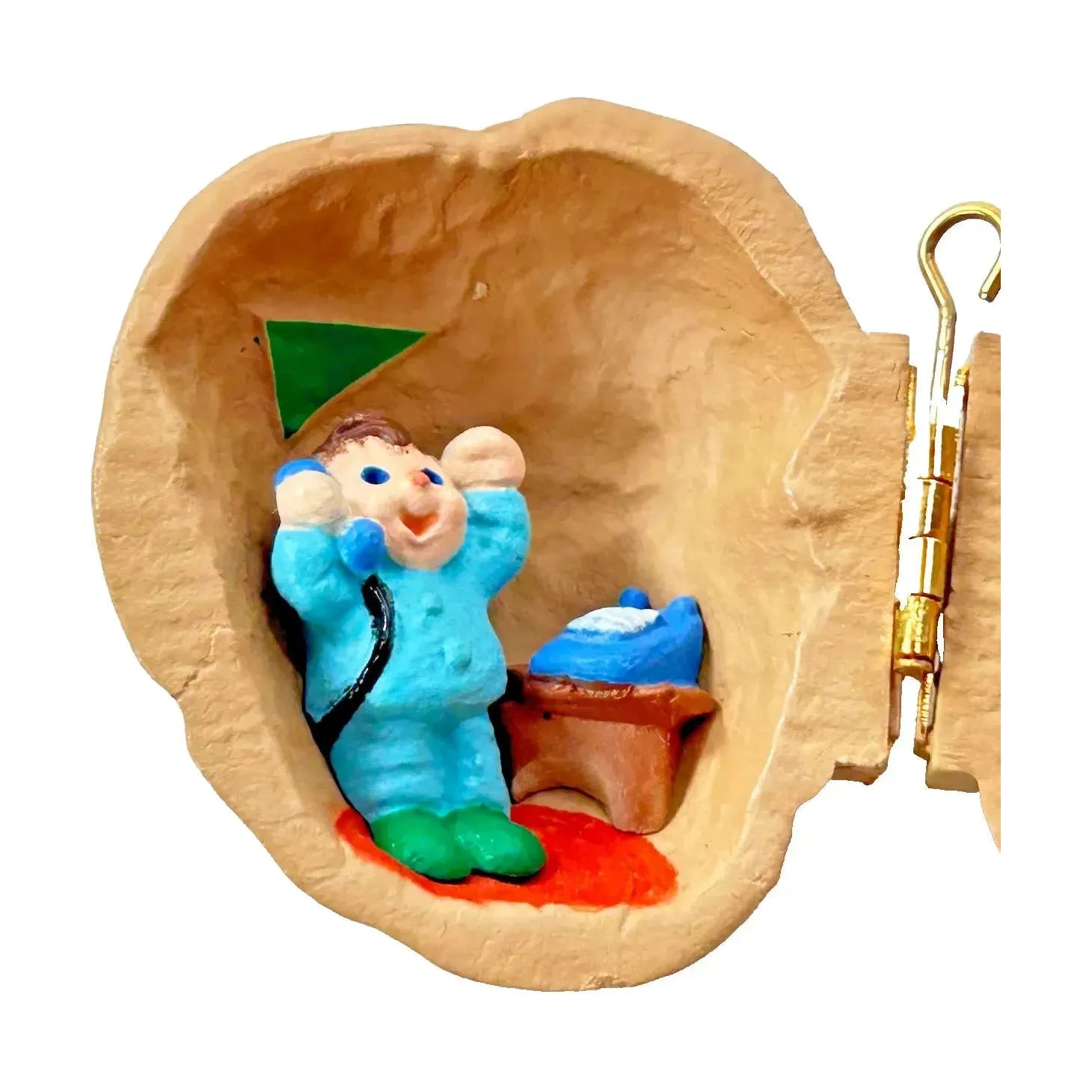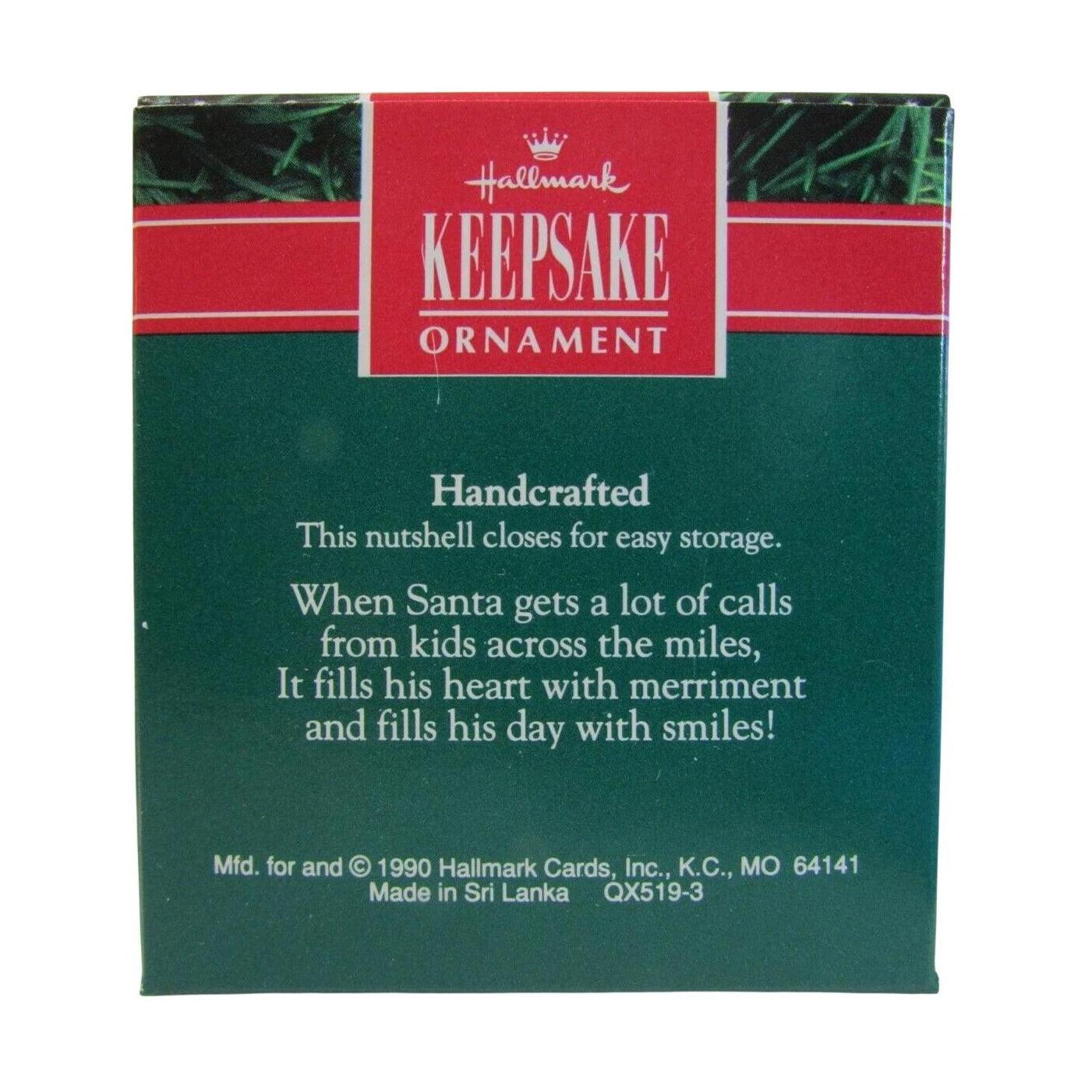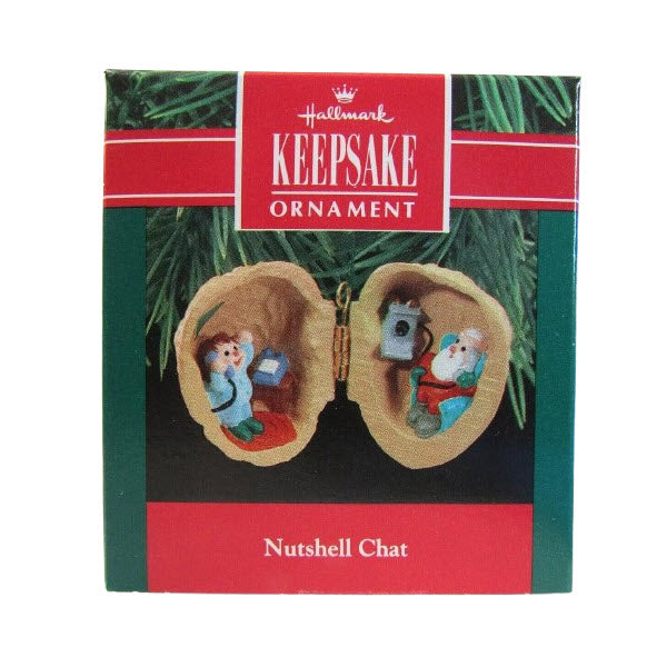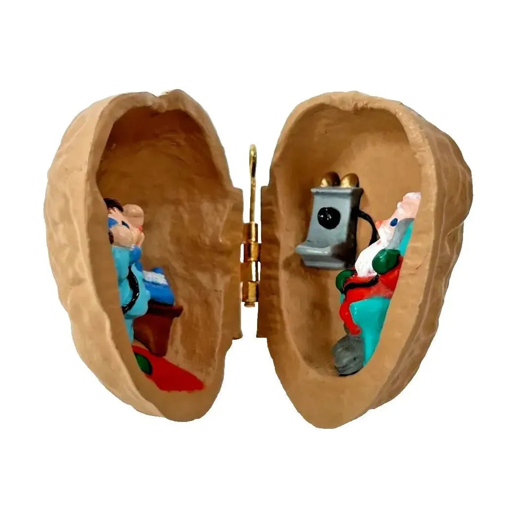 This whimsical 1990 Nutshell Chat ornament features Santa seated in a nutshell chair, chatting on a vintage telephone with a child in blue pajamas—each nestled in half of a walnut shell. The hinged design opens and closes for added playfulness. Mint‑in‑box versions typically include the original packaging and ornament tag. No batteries or power cords are needed—just hang and enjoy the charming conversation between Santa and a child.