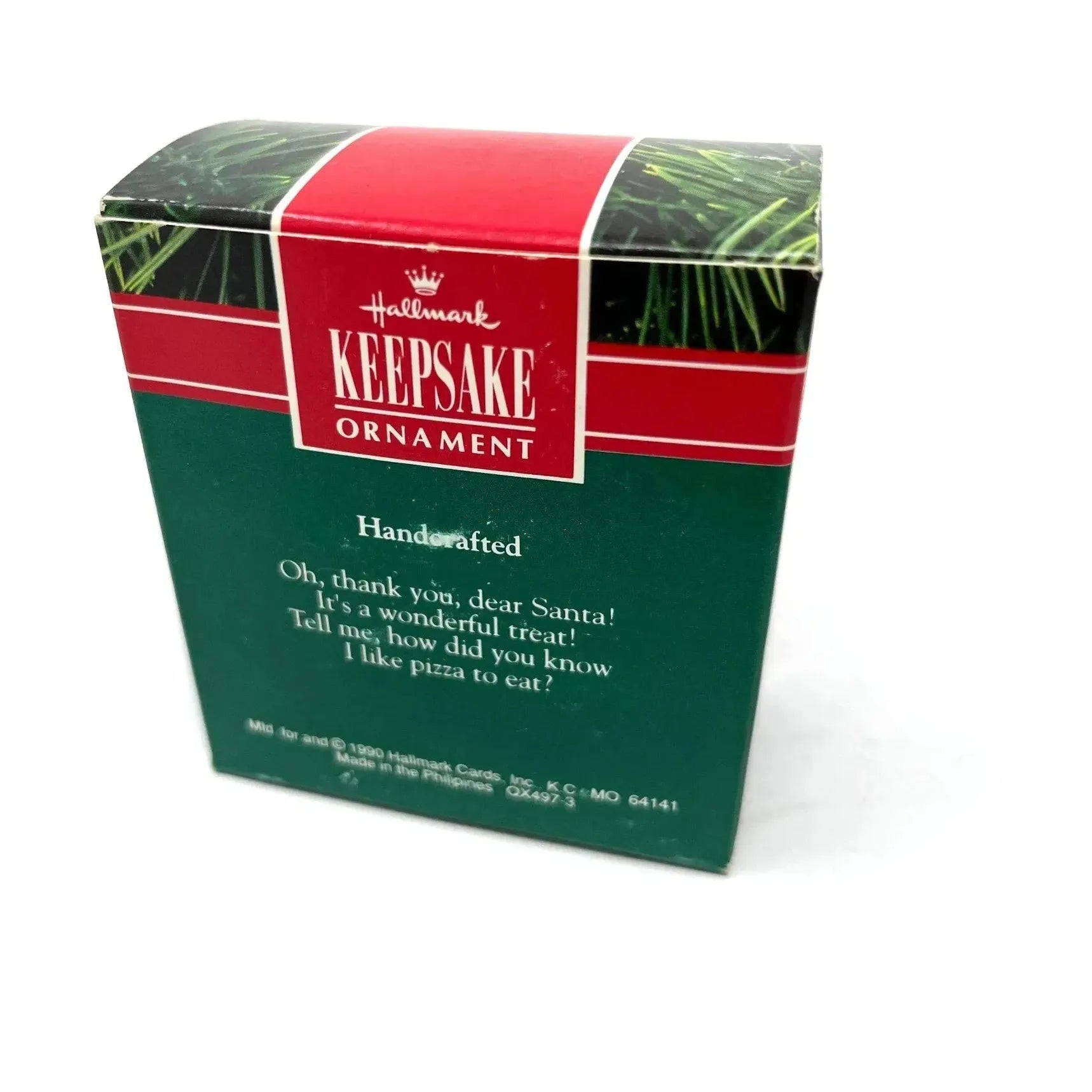 Introduced in 1990, this whimsical Pepperoni Mouse ornament showcases a playful little mouse savoring a giant slice of pepperoni pizza—complete with adorable detailing in resin. The ornament comes in its original red‑and‑green Hallmark box (when mint in box) along with the gold-tone hanging loop included. No power is needed—simply hang it on your tree to enjoy its cheeky charm.