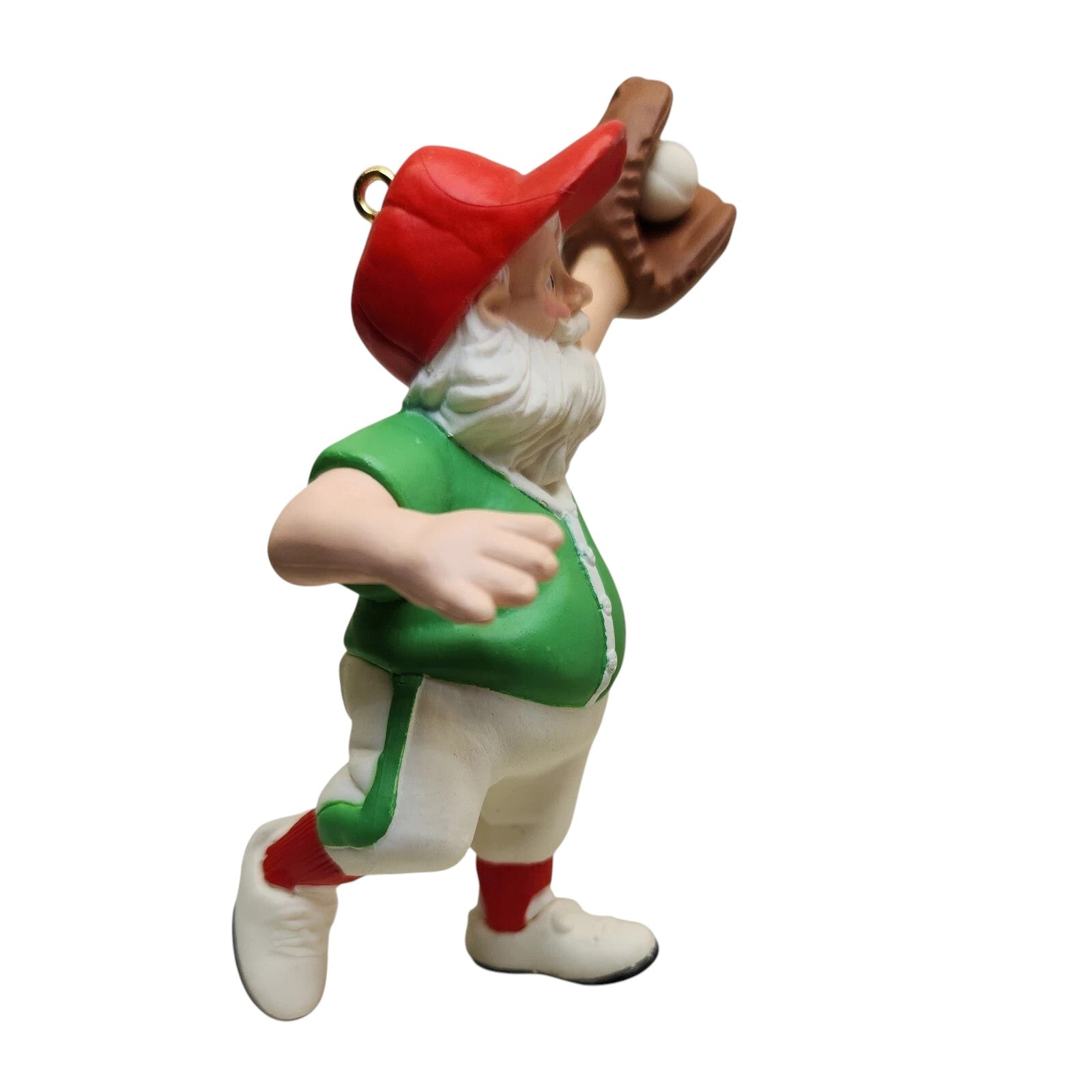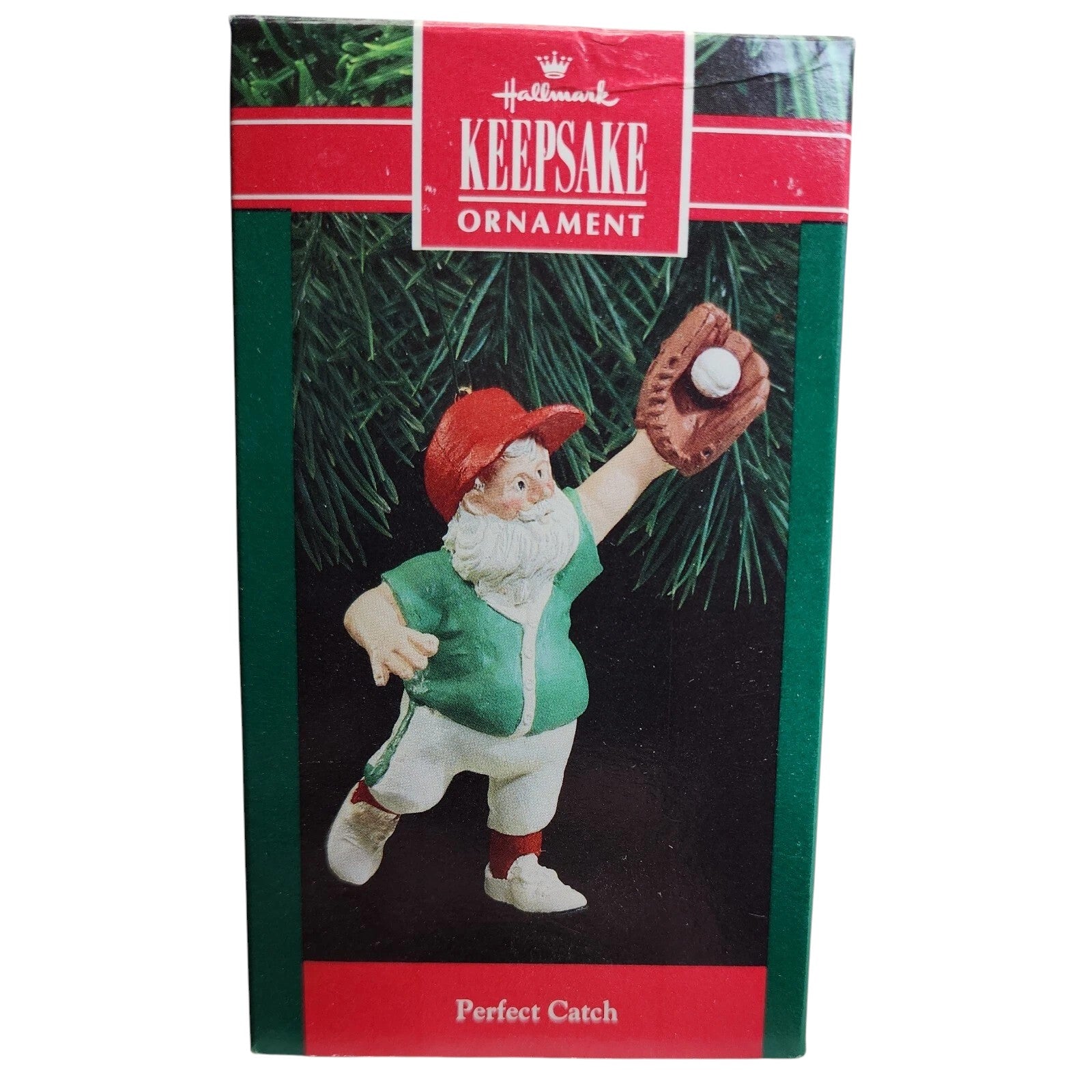 Step up to the plate with 1990 Perfect Catch, a whimsical ornament featuring jolly Santa Claus in mid-air, catching a pop fly during a friendly baseball game. Modeled in painted resin/plastic with festive green jersey and red cap, this collectible is full of movement and holiday spirit. The package includes the original Hallmark Keepsake red-and-green box (when mint in box) and a gold-tone hanger loop. No power is required—just attach the loop and hang it for instant seasonal fun.