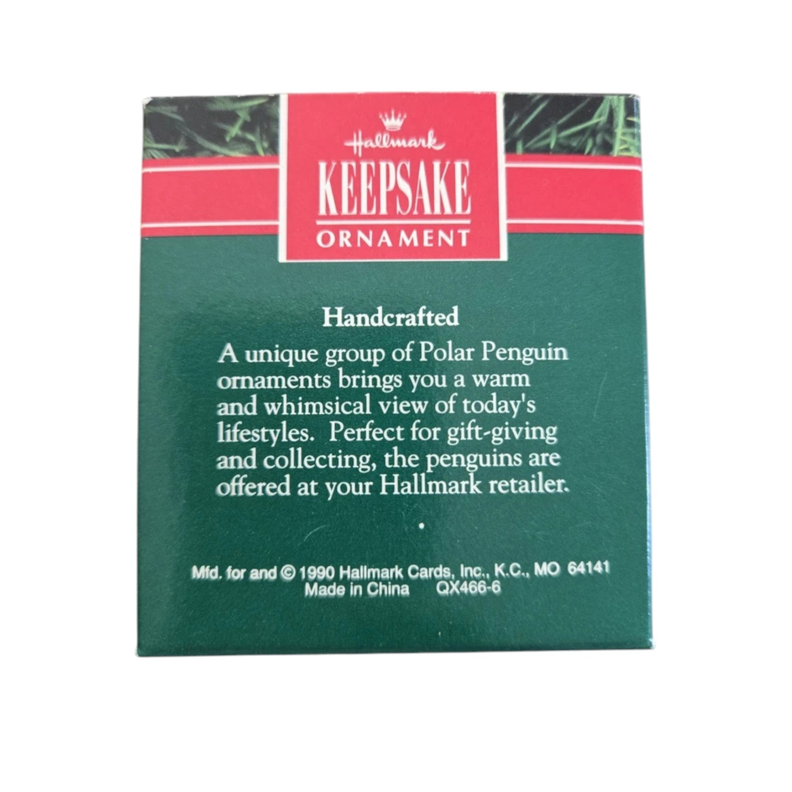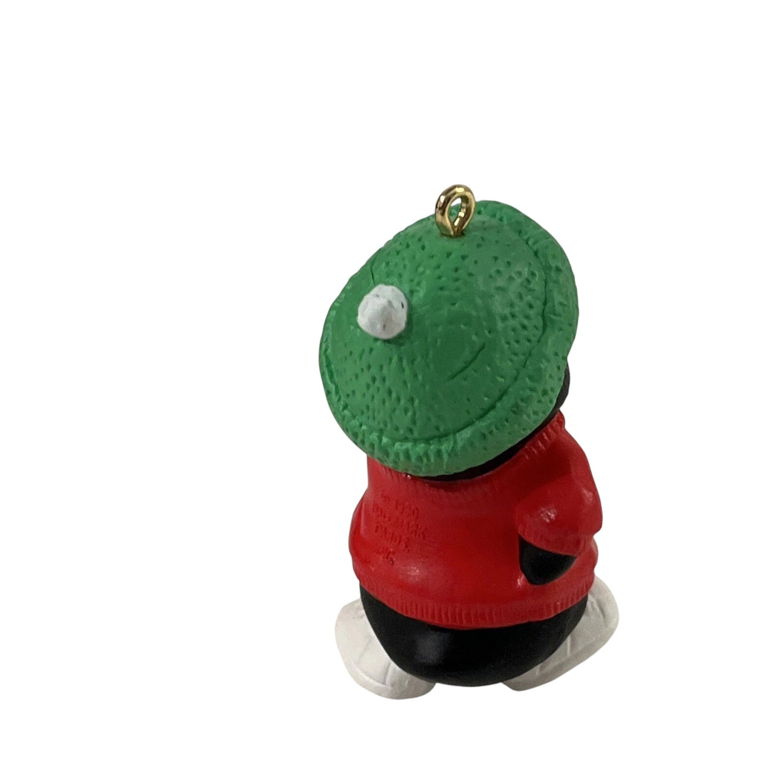 This charming miniature ornament from 1990 features an adorable penguin dressed in a festive green hat and bright red sweater emblazoned with “Polar College.” With a playful jogging stance, it captures whimsical winter fun. The original red‑and‑green Hallmark Keepsake box and the gold-tone hanging loop are included when sold mint in box. No power is needed—just hang it on your tree and enjoy the cozy vintage vibe.