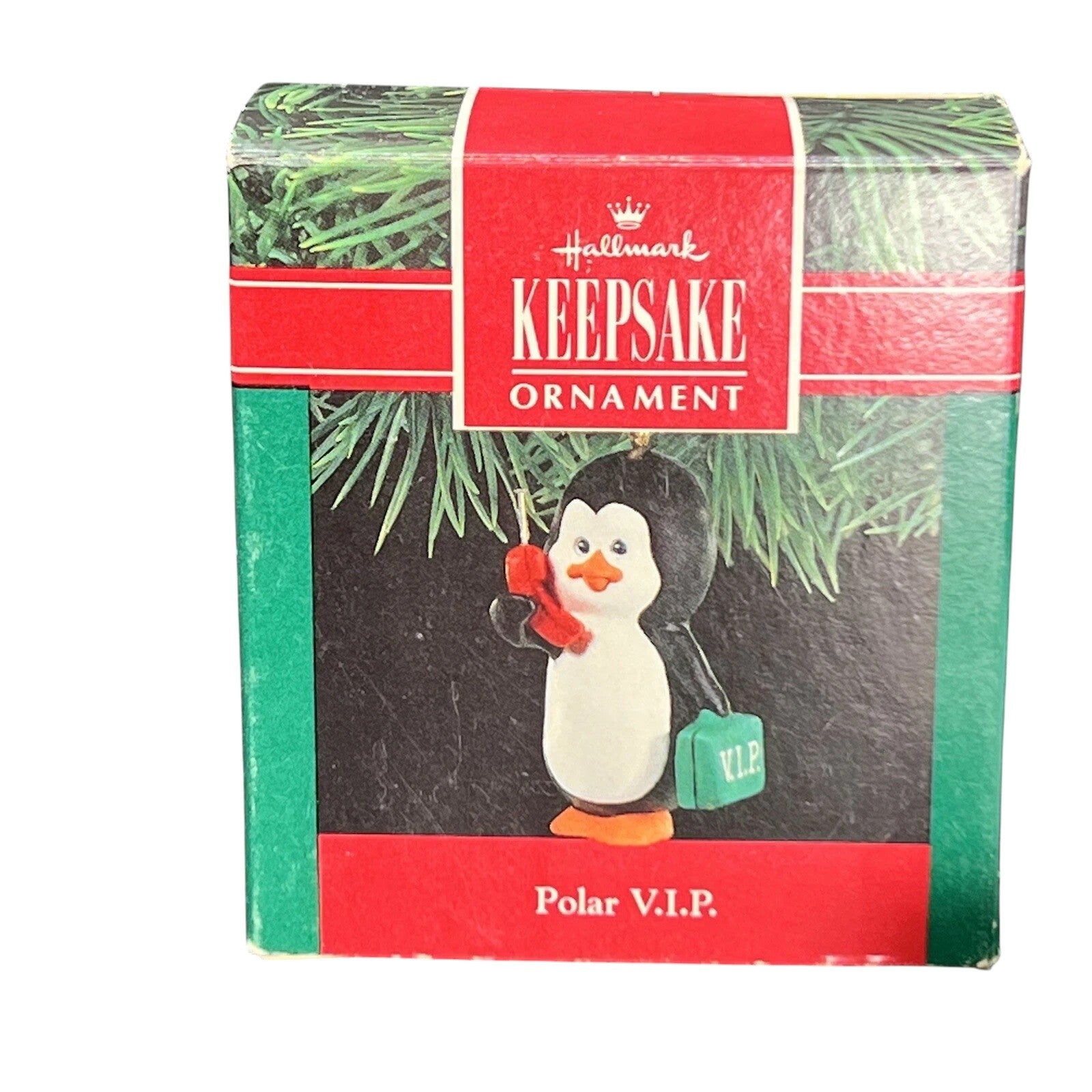 Elevate your tree with a dash of retro flair using the 1990 Polar V.I.P. ornament from Hallmark’s Polar Penguin series. This miniature resin penguin embodies high-society humor—complete with a briefcase and a red phone, ready for important calls from the North Pole. Crafted by artist Bob Siedler, it stands approximately 2 inches tall, arrives mint in its original Keepsake box, and requires no power—simply hang to showcase its charming personality.