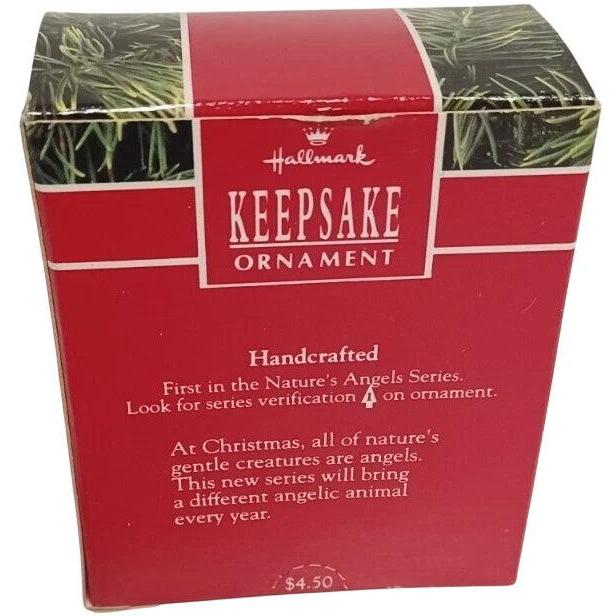 Introducing the serene 1990 Nature’s Angels ornament—first in Hallmark’s Nature’s Angels Miniature series. This delicate figurine features a small bunny dressed in a flowing white robe with a halo and tiny blue angel wings, evoking gentle, natural grace. The full mint-in-box version typically includes the original miniature Keepsake packaging and a ribbon loop for hanging. No batteries, cords, or light strings required—this miniature angel collectible is purely devotional and display-ready.
