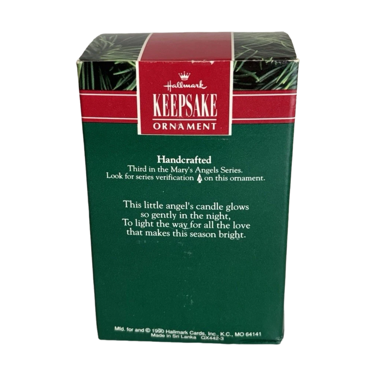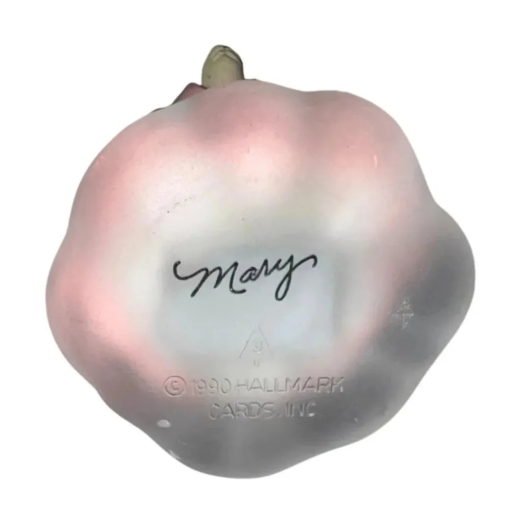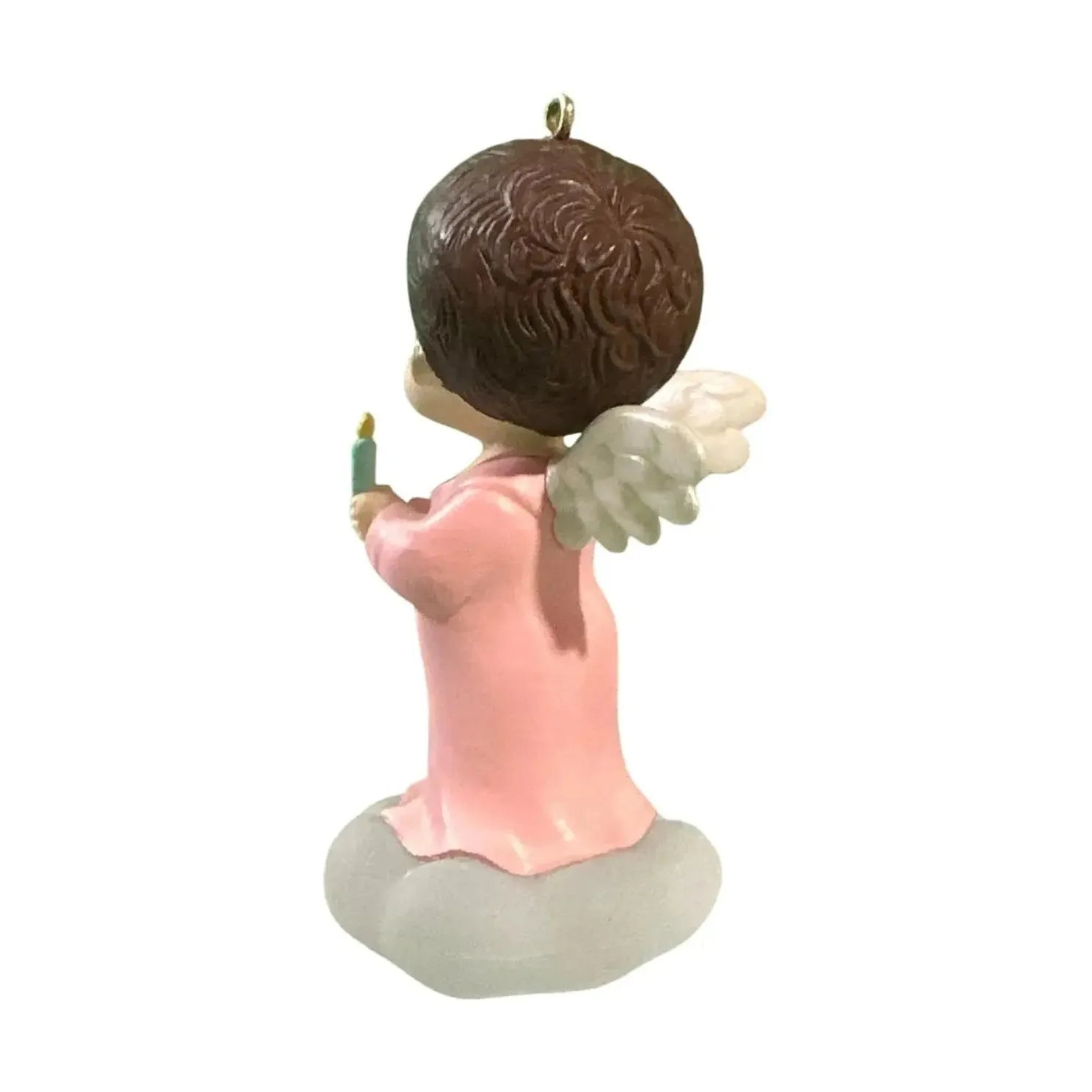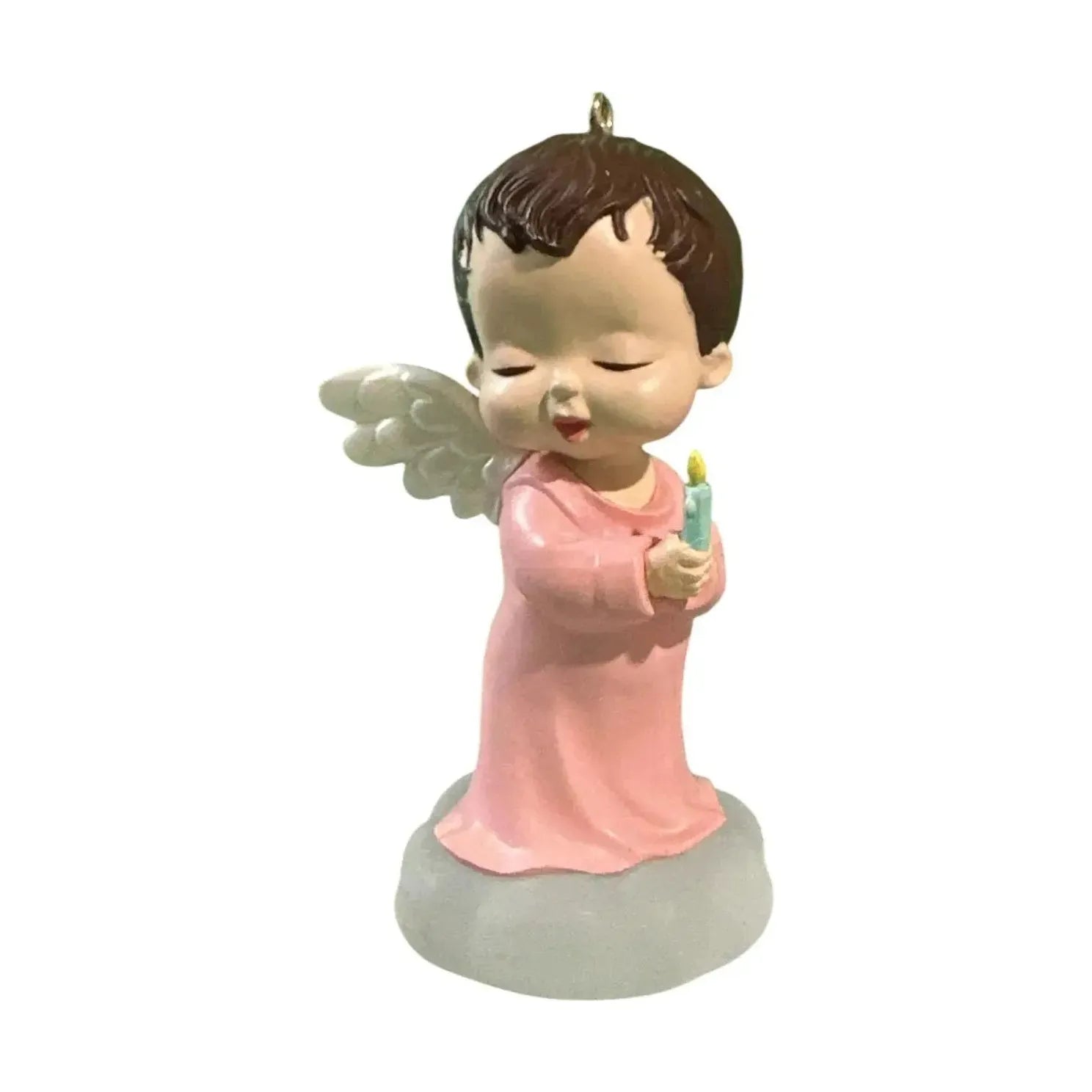 Grace your holiday ensemble with 1990 Rosebud, the third heartfelt angel in Hallmark’s beloved Mary’s Angels series. Dressed in a pink gown with delicate wings and holding a softly glowing candle, Rosebud stands upon a frosted acrylic cloud, her pose radiating peaceful serenity. Designed by Robert Chad, this collectible includes the original Hallmark Collector’s Series box and a gold-tone hanger loop when in mint-in-box condition. No power is required—simply hang and let Rosebud’s gentle glow warm your season.