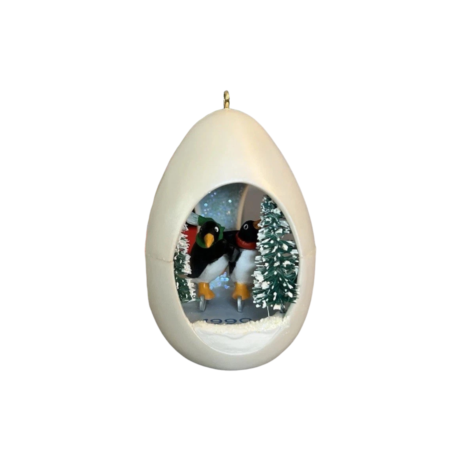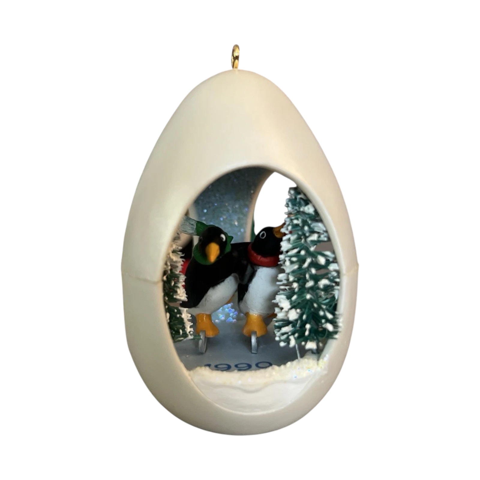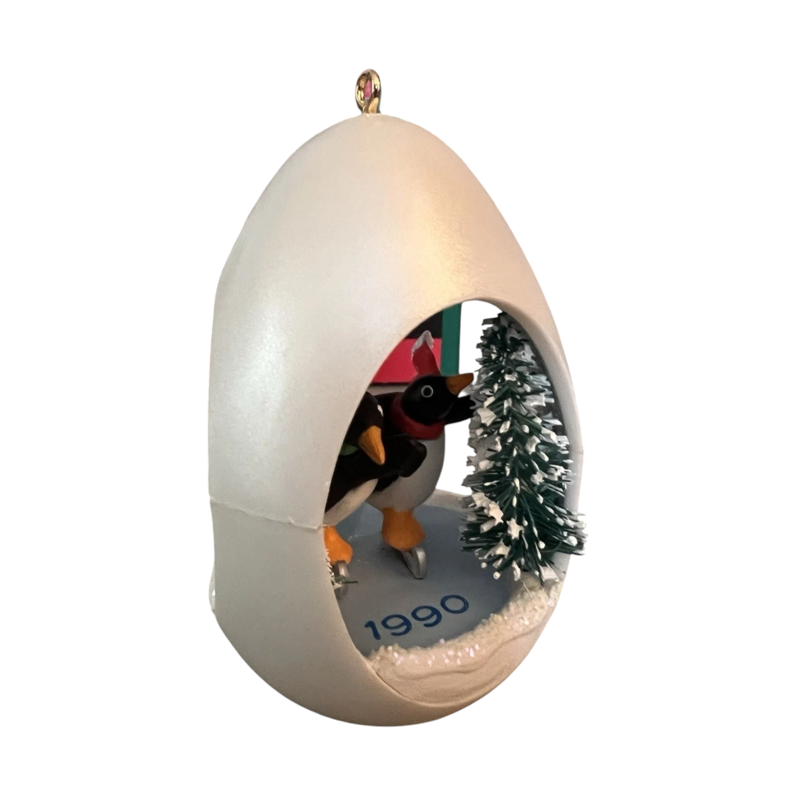 Step into a wintry adventure with 1990 Winter Surprise—Penguins Ice Skating, featuring two playful penguins gliding across a frozen lake inside a glittering white egg-shaped ornament. The picturesque scene includes bottle-brush pine trees and a twinkling blue sky backdrop, evoking nostalgic charm. When mint in box, this collectible includes the original Hallmark Collector’s Series packaging and a gold-tone hanger loop. No batteries or power required—just hang or display to relish its subtle sparkle and festive whimsy.