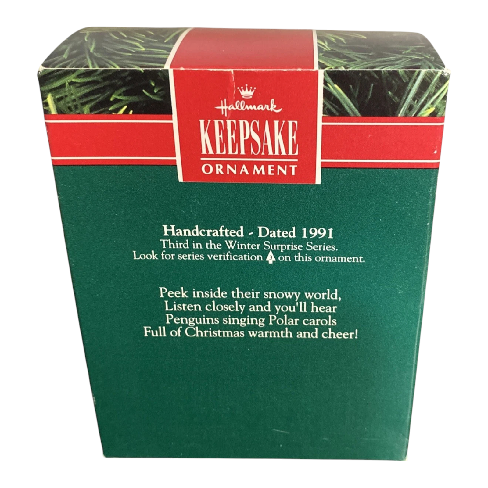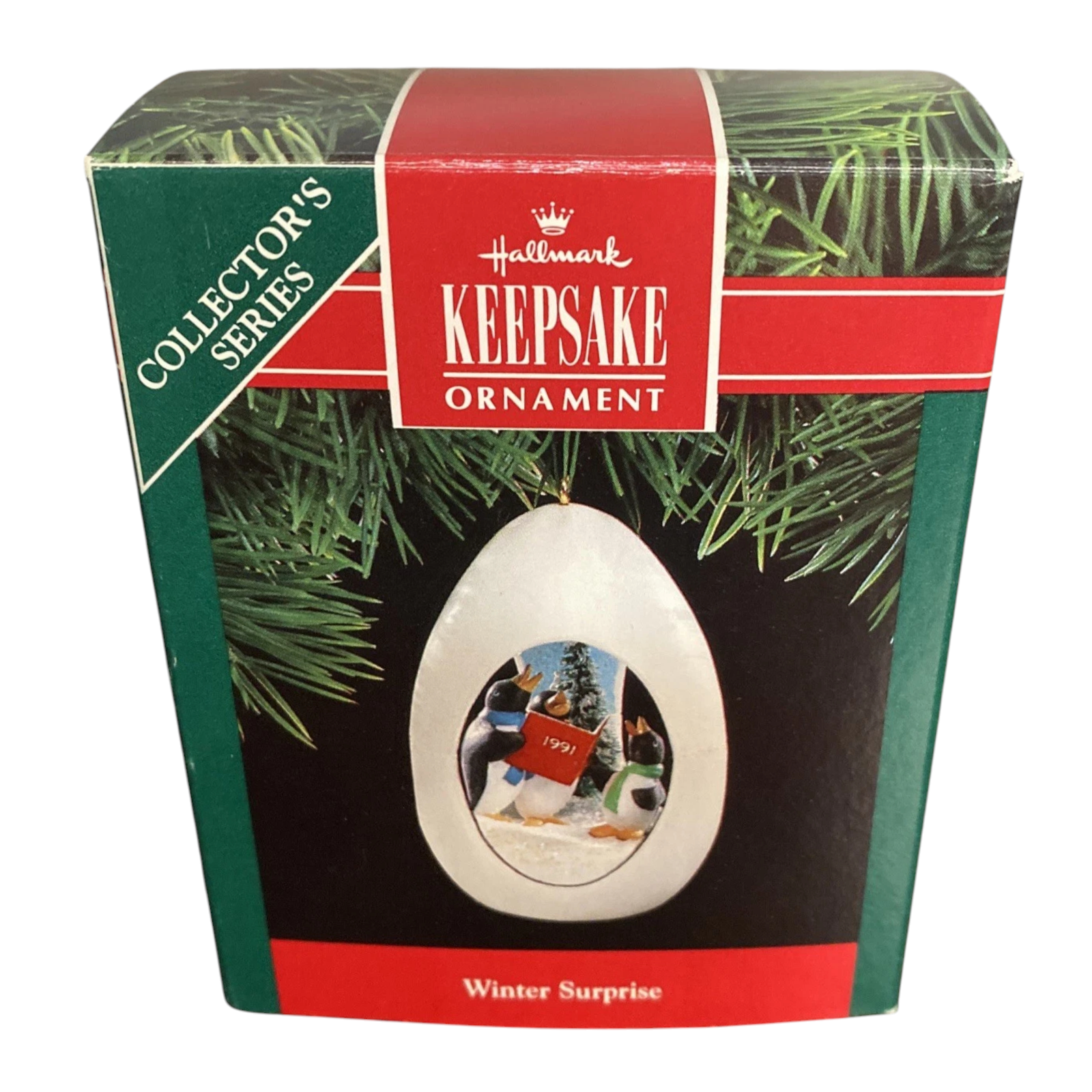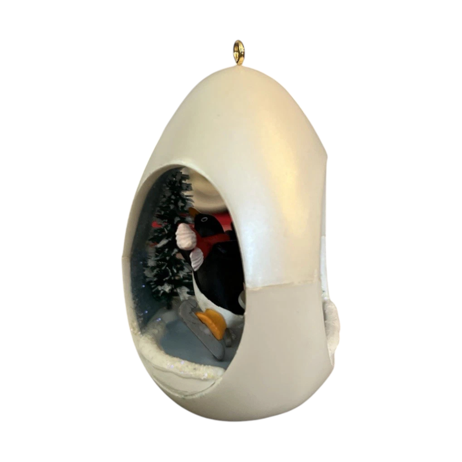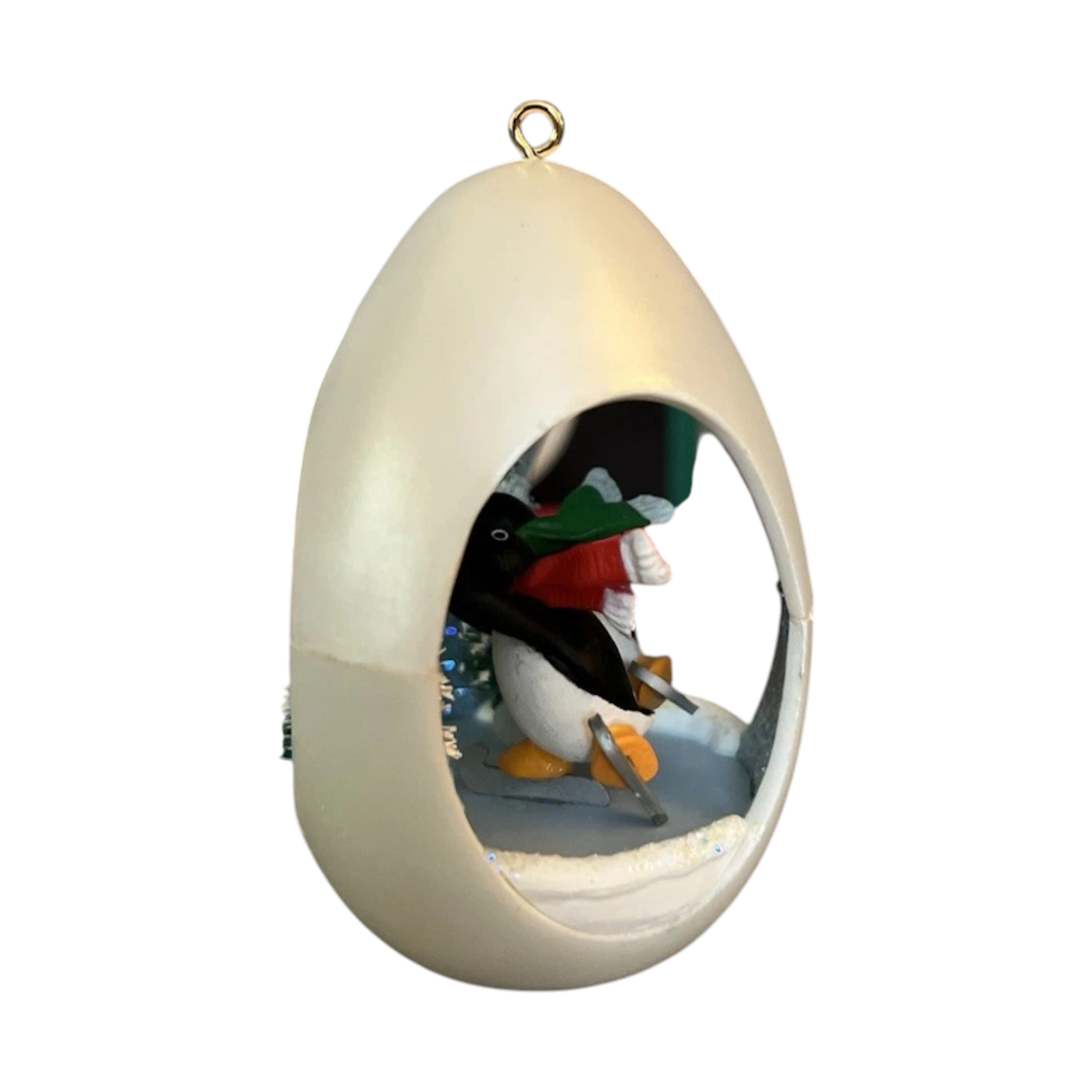 Step into a wintry adventure with 1990 Winter Surprise—Penguins Ice Skating, featuring two playful penguins gliding across a frozen lake inside a glittering white egg-shaped ornament. The picturesque scene includes bottle-brush pine trees and a twinkling blue sky backdrop, evoking nostalgic charm. When mint in box, this collectible includes the original Hallmark Collector’s Series packaging and a gold-tone hanger loop. No batteries or power required—just hang or display to relish its subtle sparkle and festive whimsy.