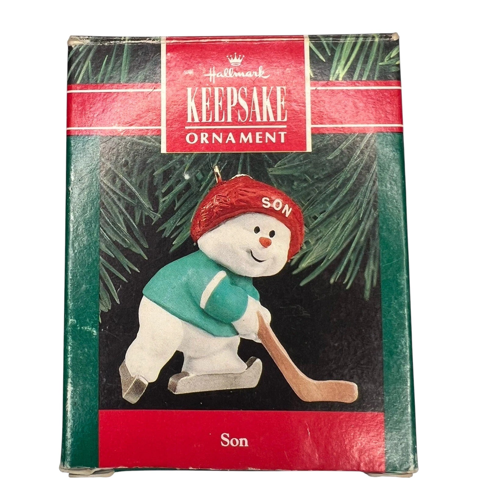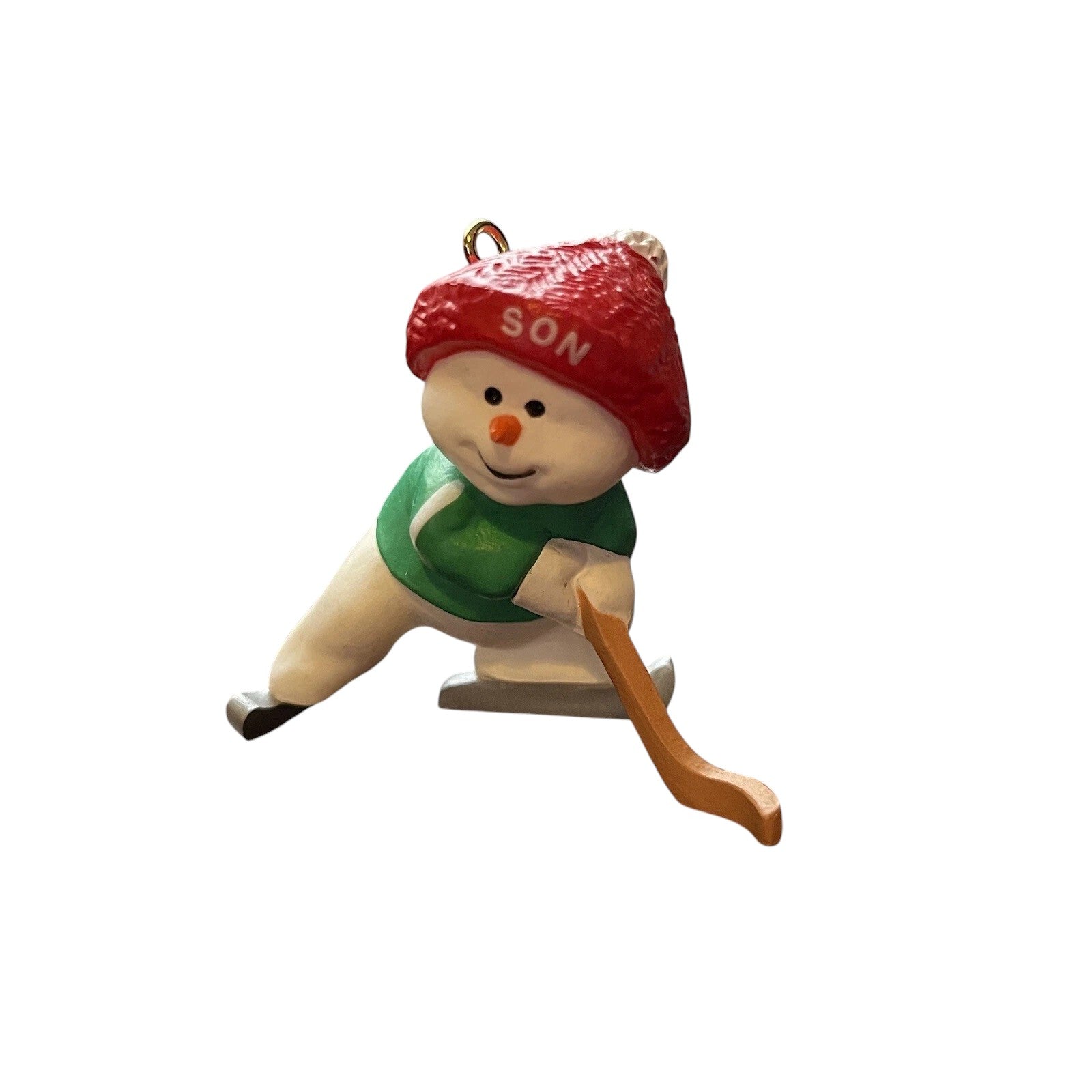 Celebrate the sporty son in your life with this playful 1990 Son ornament from Hallmark’s Family collection. Crafted as a charming resin bear clad in a cozy sweater, complete with a hockey stick, the design perfectly captures youthful energy and winter fun. Packaged mint in its original Keepsake box, this ornament requires no power—you can hang it right out of the box and let the holiday spirit take over.