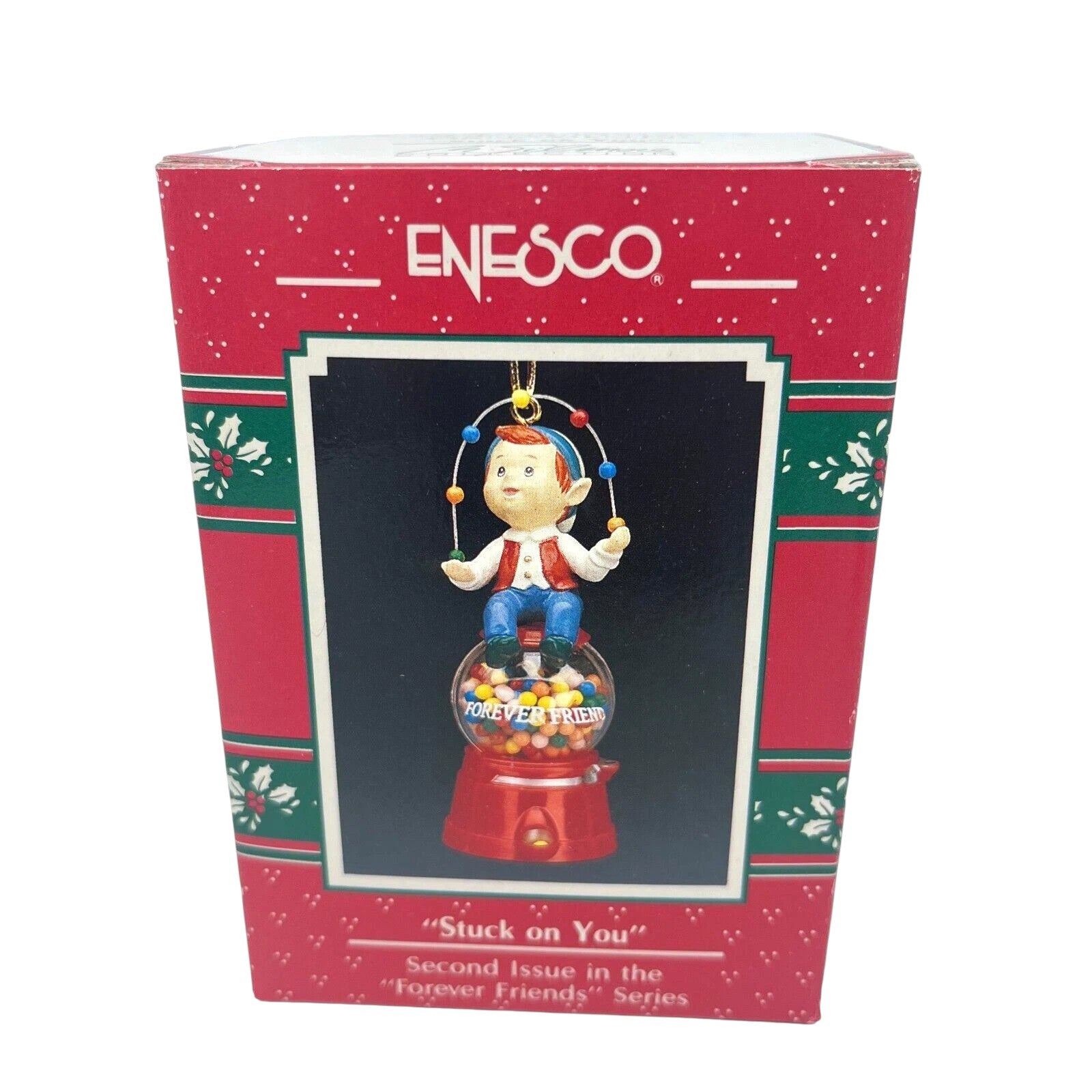 Celebrate the bonds that stick with you in the 1990 Stuck on You ornament from Enesco, the second issue in the heartwarming “Forever Friends” series. This sweet ornament features two lovable teddy bears caught in a playful tangle of red holiday ribbon as they snuggle close in an affectionate embrace. With expressive faces, finely sculpted fur, and hand-painted detail, this charming piece beautifully represents the joy of friendship and togetherness. It comes with the original Enesco packaging, making it a perfect collectible or thoughtful gift. No cords, lights, or batteries—just forever friends wrapped in love.