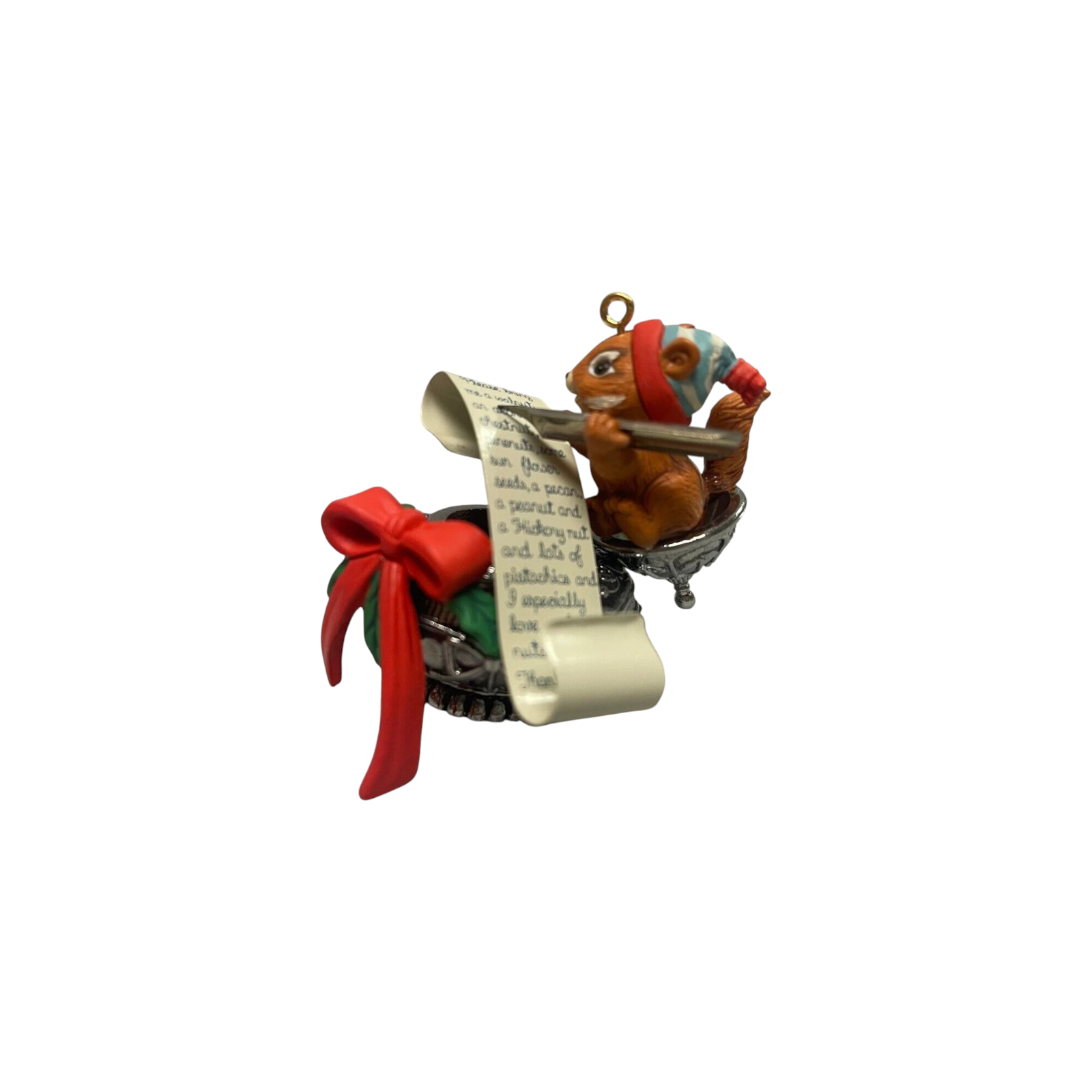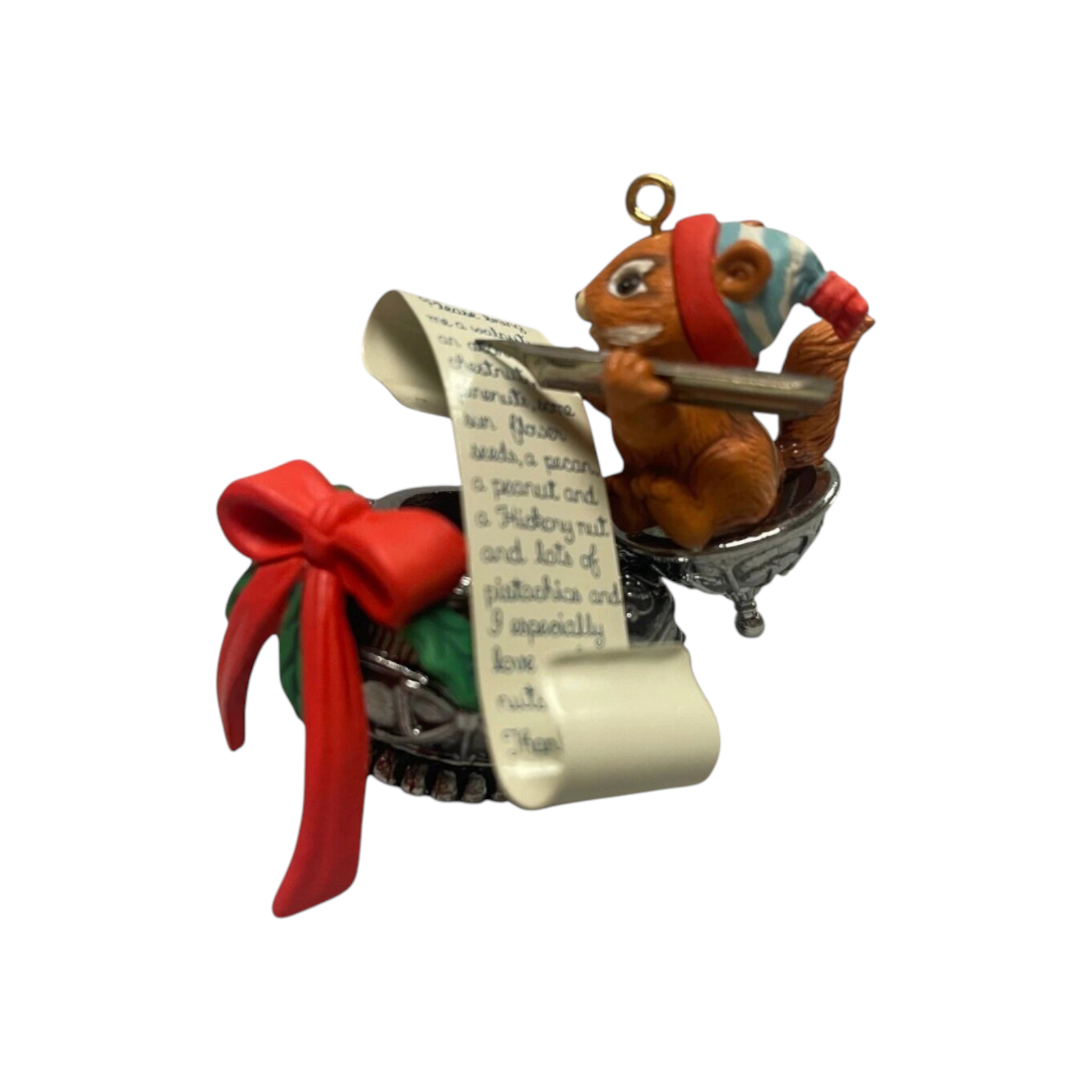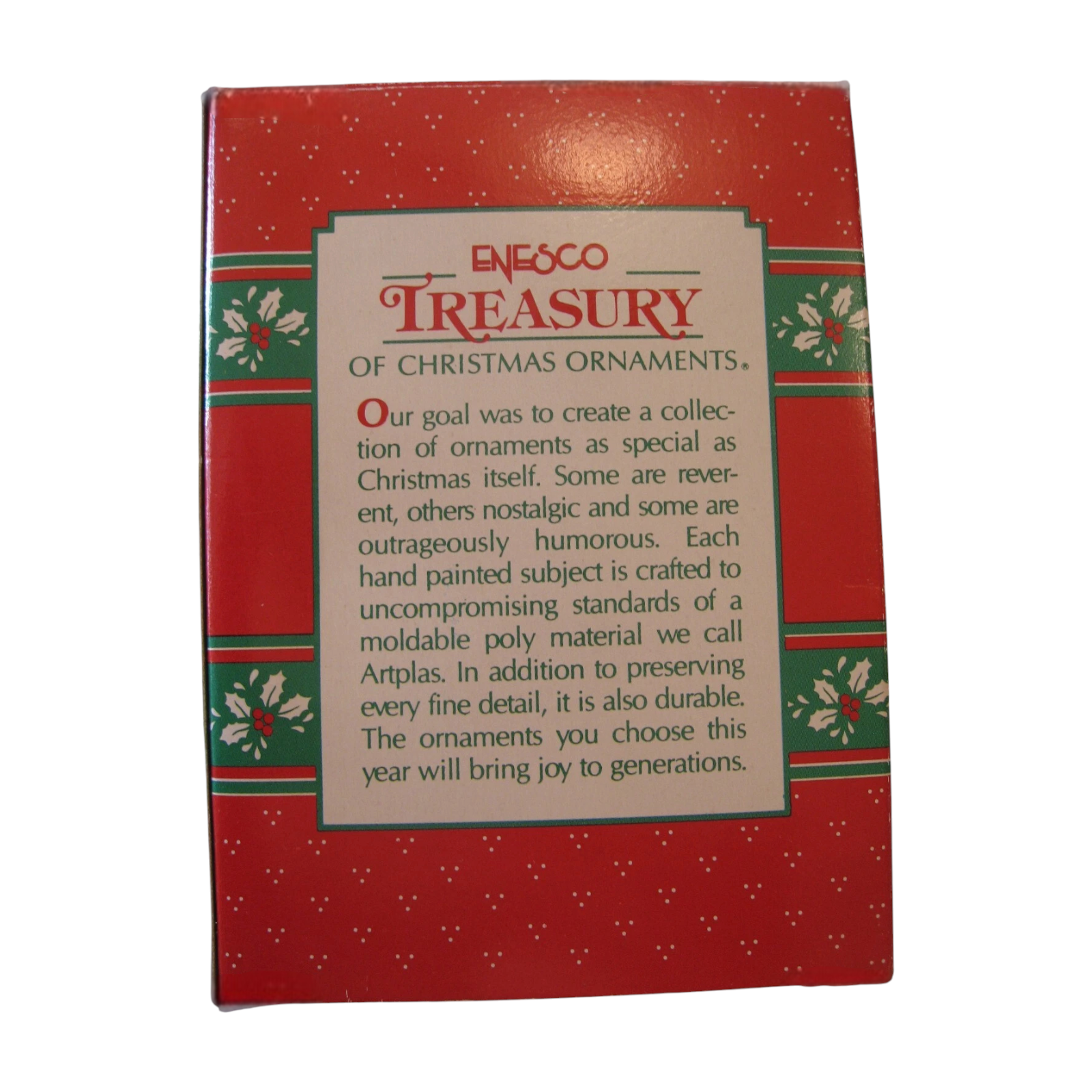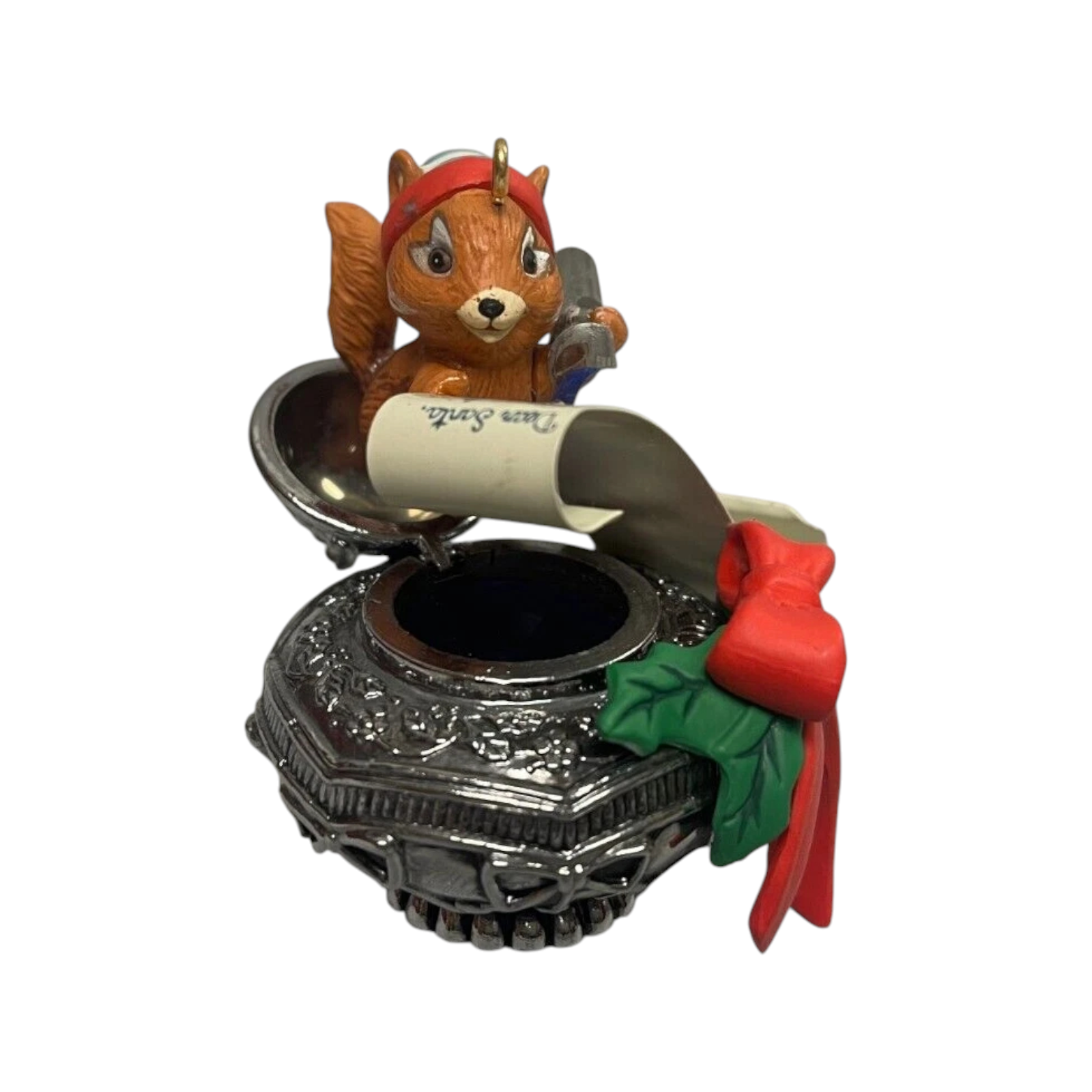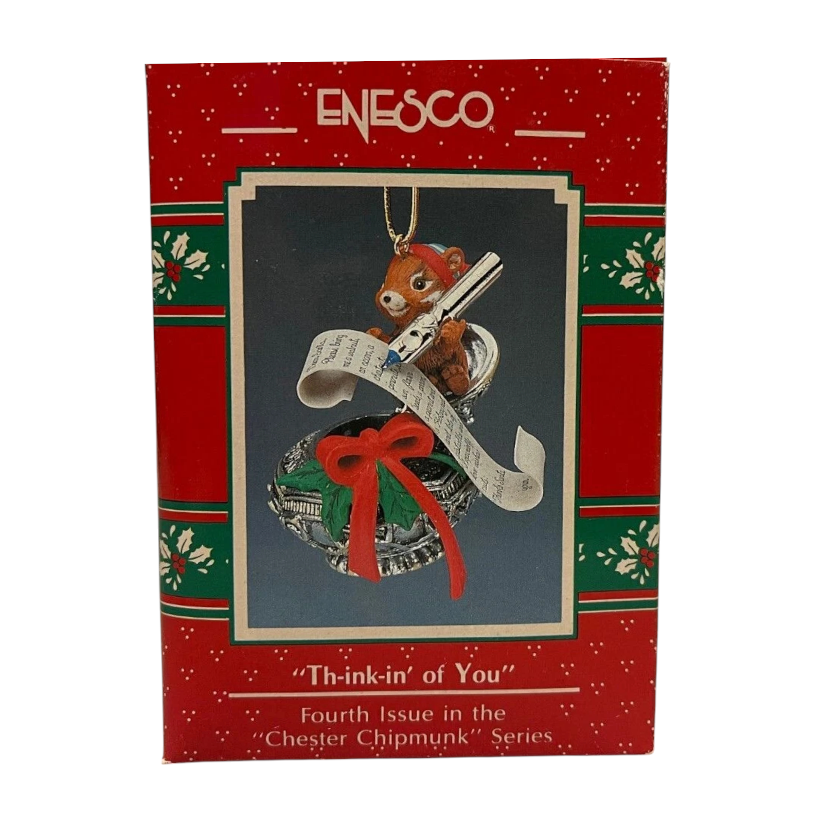 Send a heartfelt message with the 1990 Th-ink-in' of You ornament from Enesco—the fourth issue in the charming “Chester Chipmunk” series. This delightful ornament features Chester, the lovable chipmunk, seated with an ink bottle and feather quill, writing a heartfelt note on a heart-shaped piece of paper. With rosy cheeks, an affectionate gaze, and detailed sculpting, this piece captures the warmth of connection and thoughtfulness. Crafted in resin and hand-painted in soft, vintage tones, it comes in its original Enesco box. No cords or batteries required—just a sweet reminder of someone special.