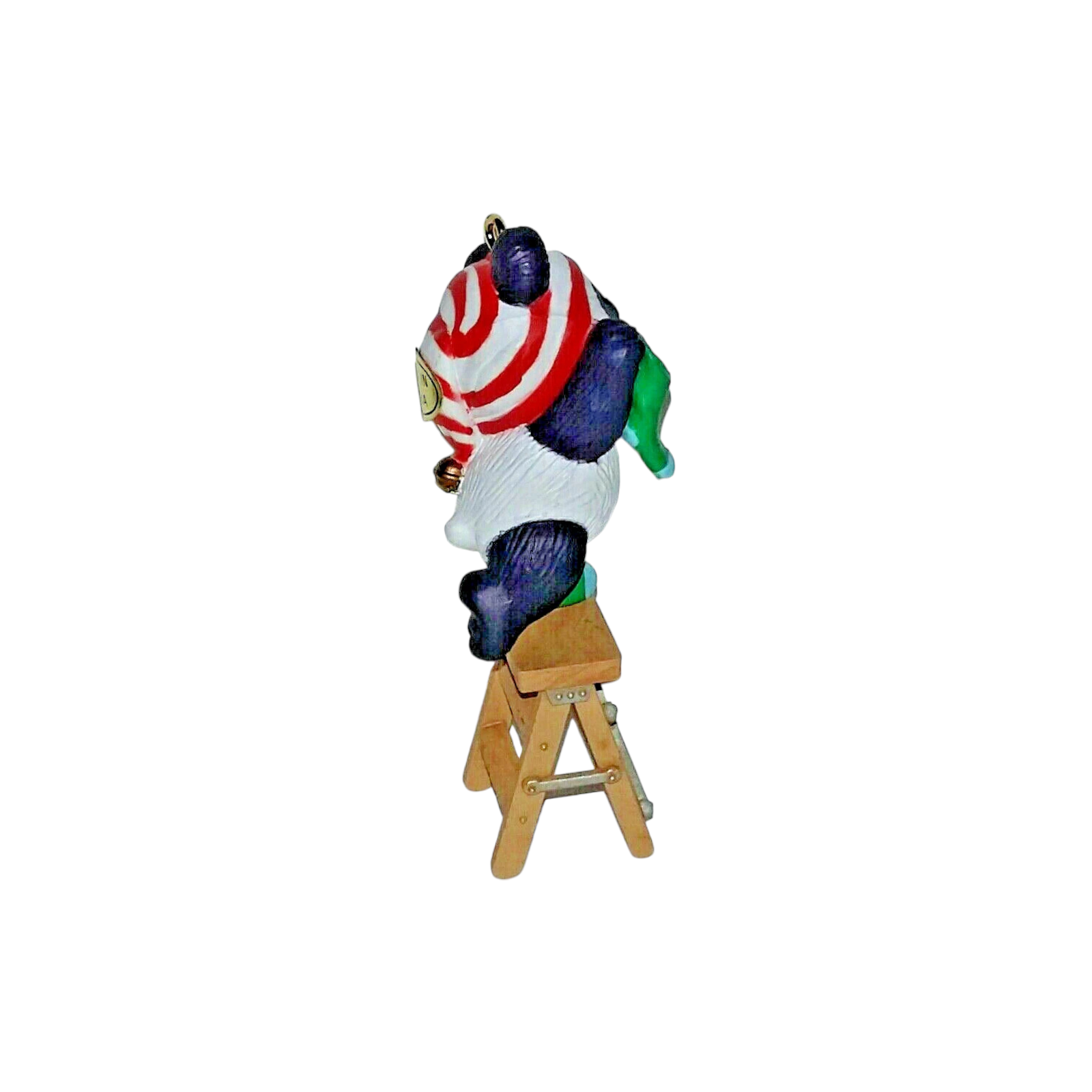 Celebrate the joyful anticipation of Christmas with this charming 1990 “The Stockings Were Hung” ornament featuring a playful panda bear from the Heirloom Collection. The design showcases the panda in a festive pose, hanging a stocking with holiday flair, and is rendered in vibrant holiday colors with fine sculptural detail that gives it a cheerful and collectible appeal. Designed by artist Mike Gilmore, the piece blends vintage charm and whimsical character, making it a standout for collectors of animal-themed or early ’90s holiday ornaments. Its dated 1990 release enhances its appeal to long-time ornament hunters, and its compact size keeps it versatile for tree display or seasonal décor.