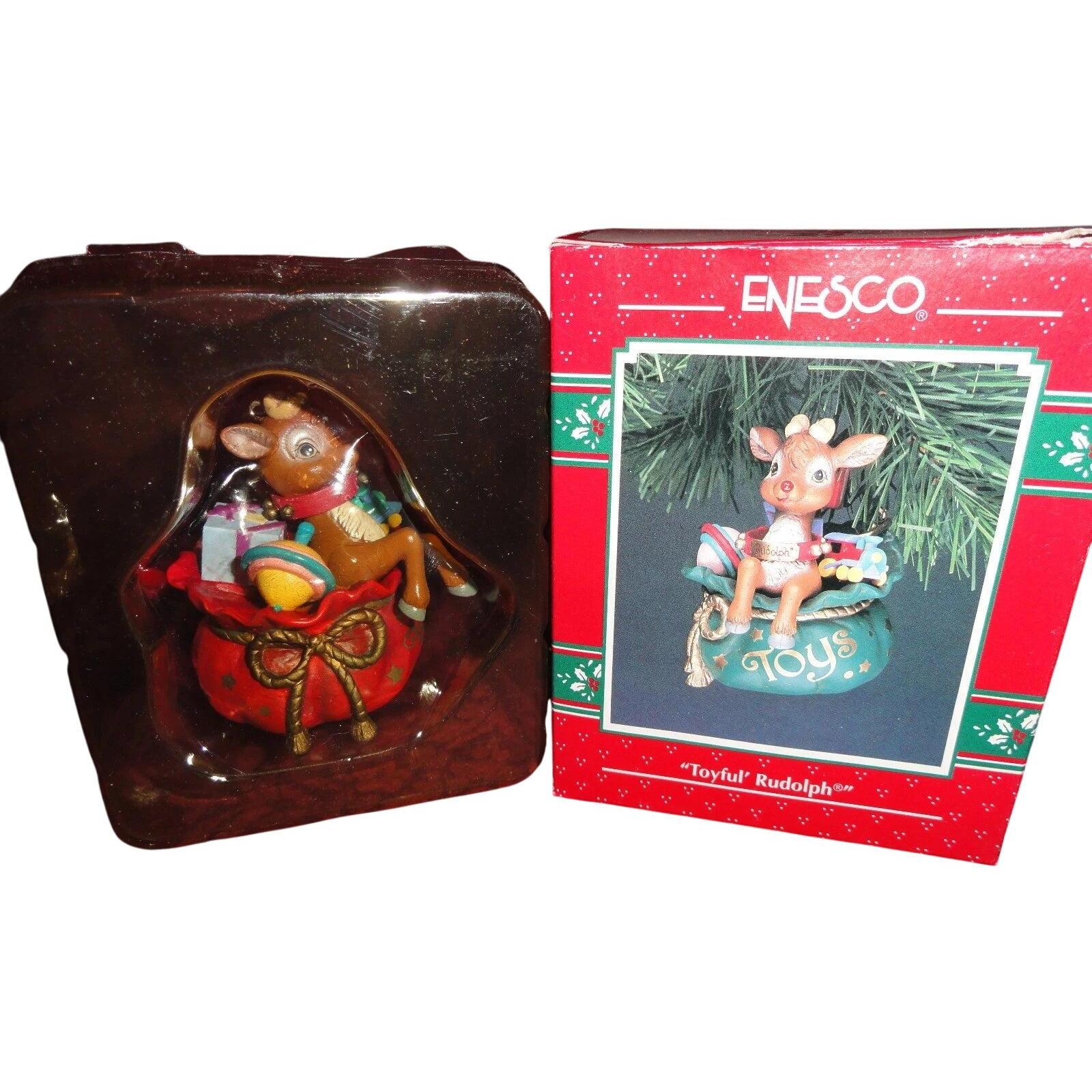 Light up your holidays with the vintage “Toyful Rudolph” ornament by Enesco, item 593982. This heartwarming collectible features Rudolph the Red-Nosed Reindeer joyfully carrying a stack of Christmas toys, his bright red nose shining with festive cheer. Hand-painted in vibrant seasonal colors, it showcases Enesco’s charming craftsmanship and captures the timeless magic of the beloved holiday character. A perfect gift for Rudolph fans and vintage collectors alike, this ornament brings nostalgia, warmth, and Christmas spirit to any tree or festive display.