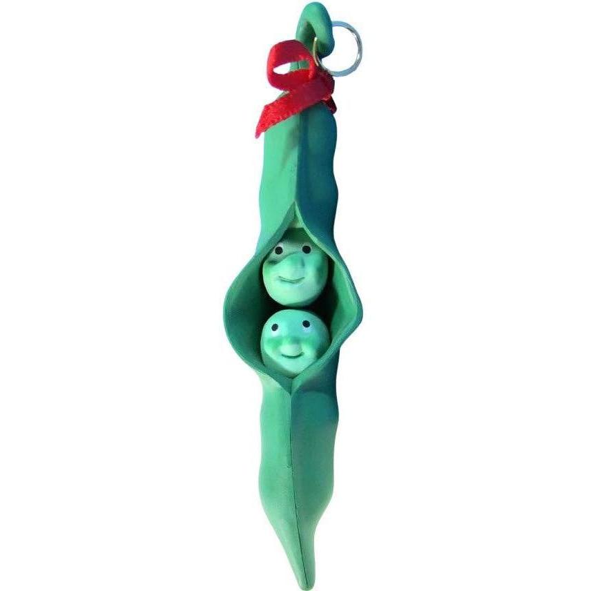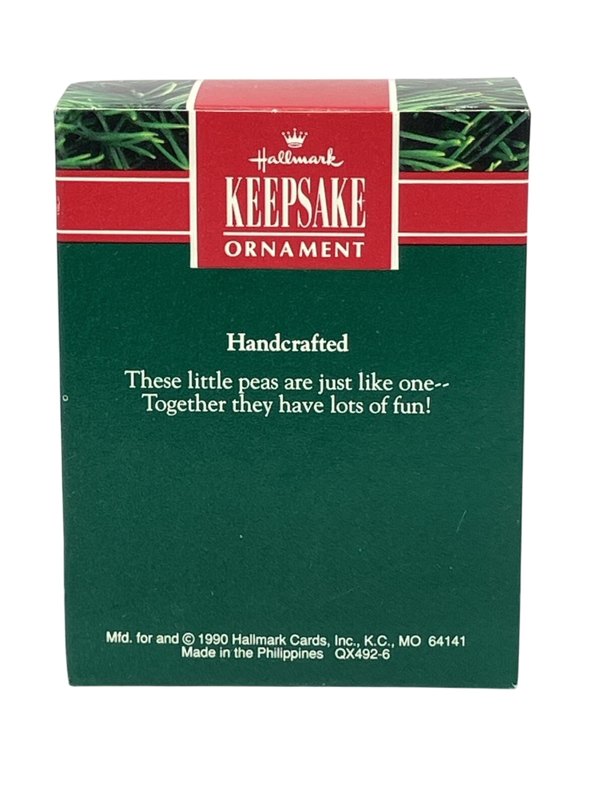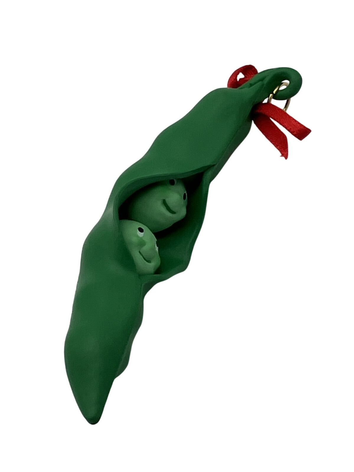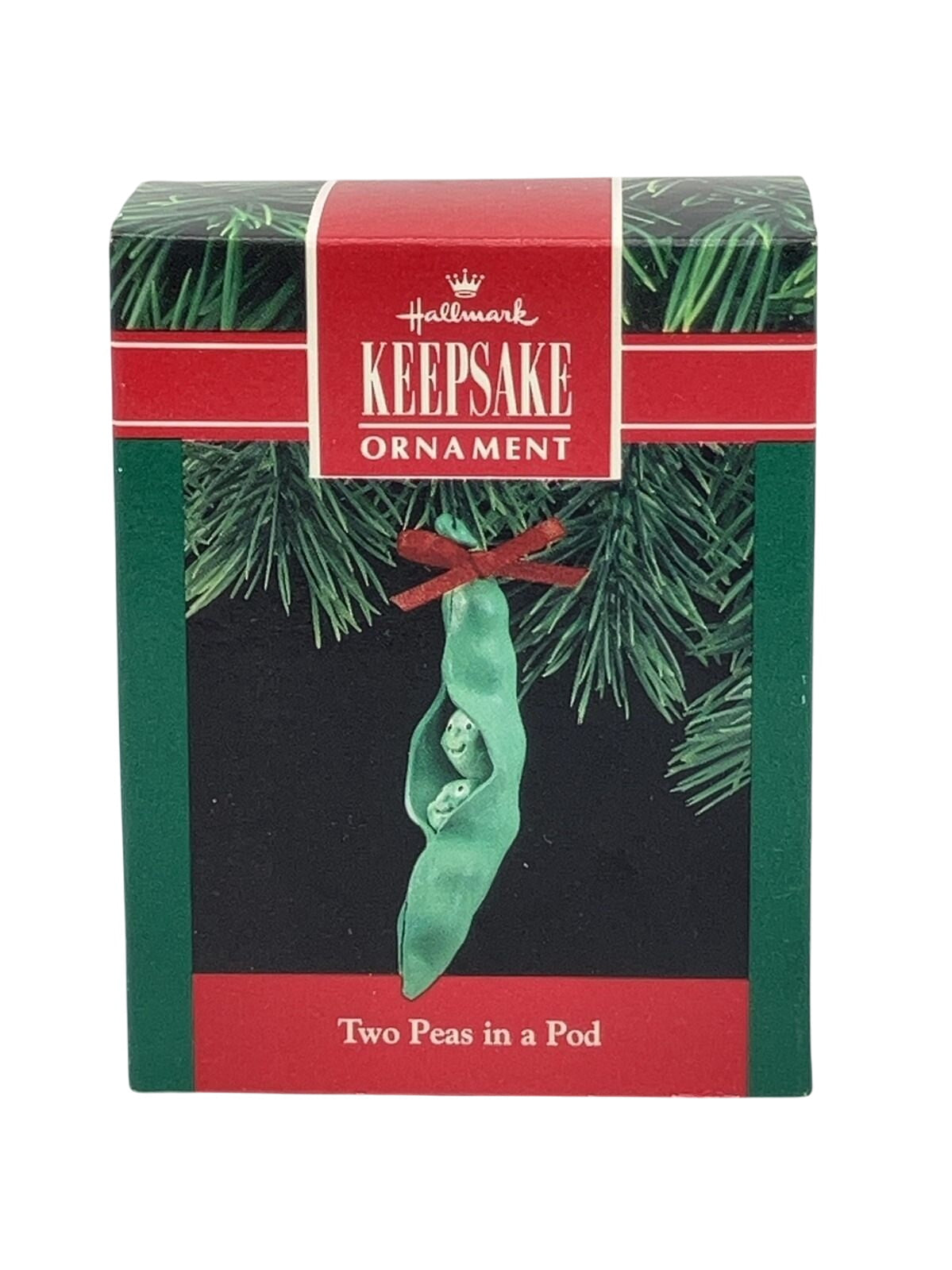 The delightful 1990 Two Peas in a Pod ornament showcases two smiling peas nestled within a vibrant green pod, tied with a festive red satin ribbon. This cheerful symbol of togetherness and love is ideal for couples or friendship-themed holiday décor. Mint-in-box versions include the original Hallmark Collector’s Series box and a gold-tone hanging loop. No power is required—just hang for instant nostalgic charm.