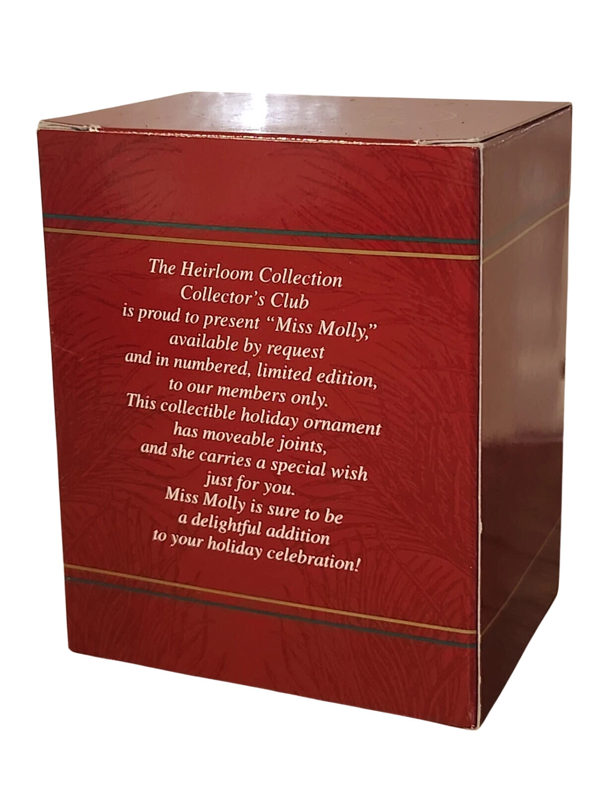 Add a touch of vintage sweetness with the Miss Molly ornament from Carlton Cards' exclusive Members Only Heirloom series. This charming teddy bear is dressed in a lacy bonnet and ribboned outfit, holding a festive red envelope—an adorable nod to holiday greetings. The package includes the original ornament box (Members Only style) with molded insert and hang tag. No batteries, lights, or cords required—just unbox and hang for instant nostalgic cheer