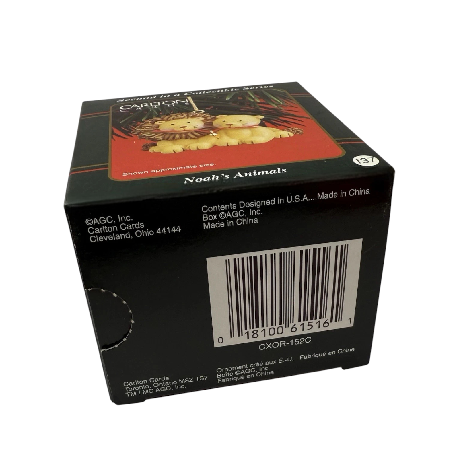 Bring biblical charm to your holiday décor with the Noah’s Animals ornament from Carlton Cards’ Little Heirloom Treasures Collection. This whimsical design features a stately lion and lioness pair—rendered in warm golden tones and detailed fur texture—as a nod to the story’s beloved creatures two by two. It includes the original green-style Carlton Cards Heirloom box with molded insert and hang-tag. No batteries, lights, or cords are required—just unpack and hang for instant festive storytelling.