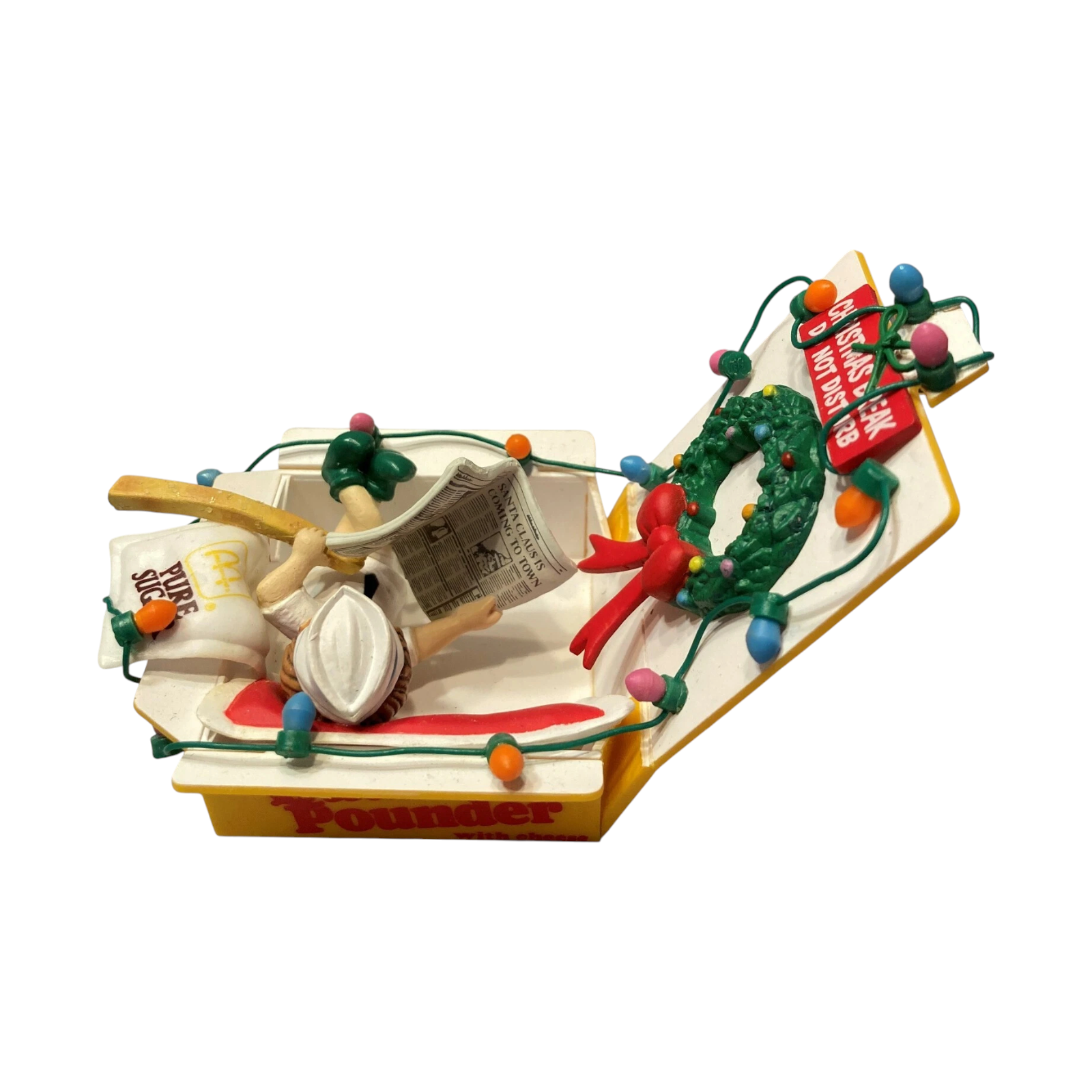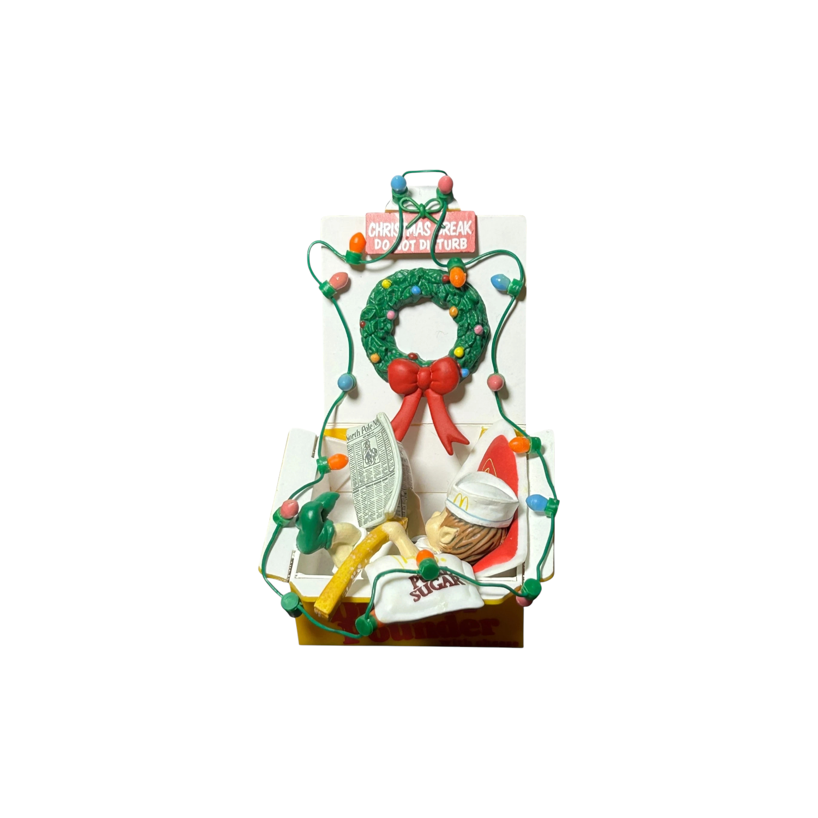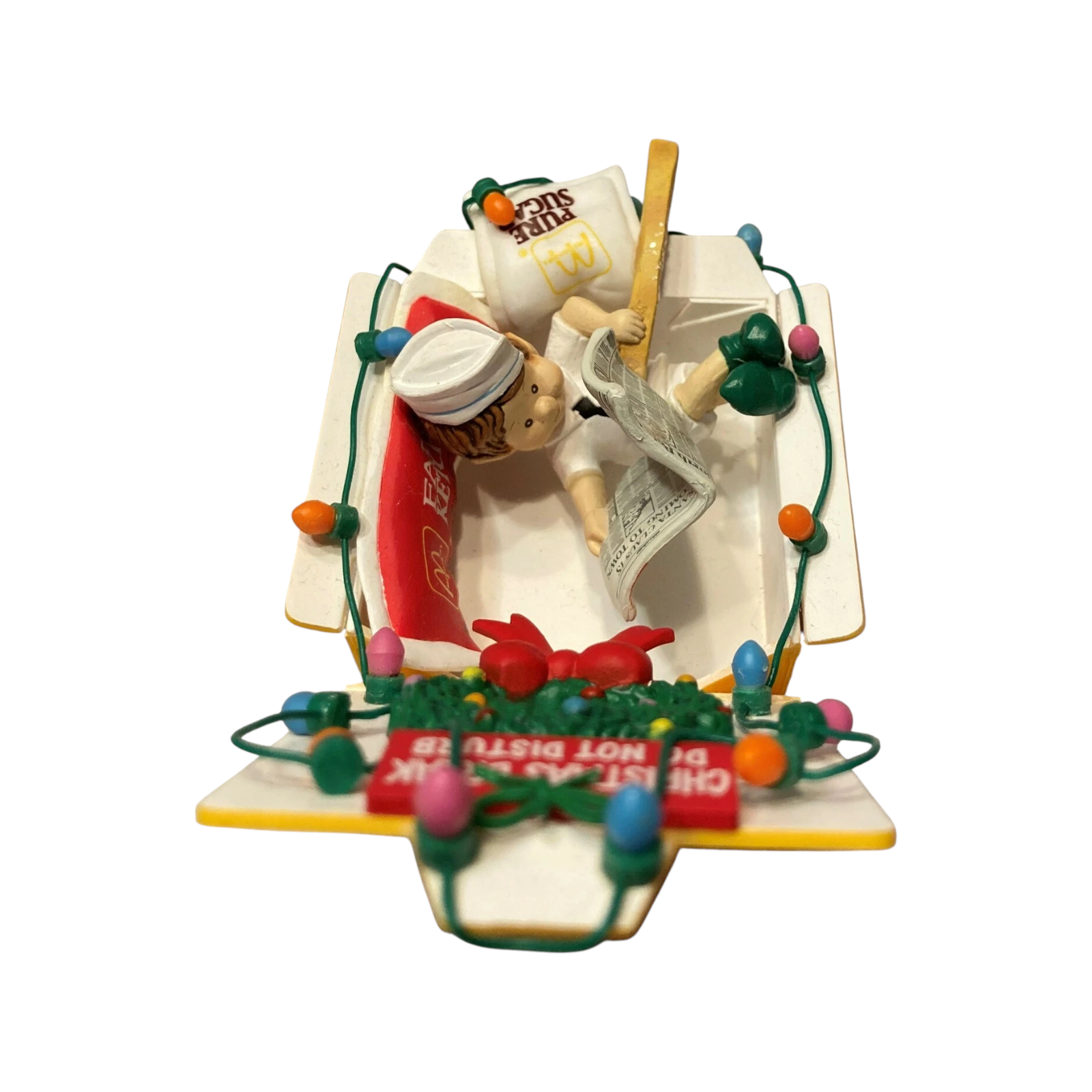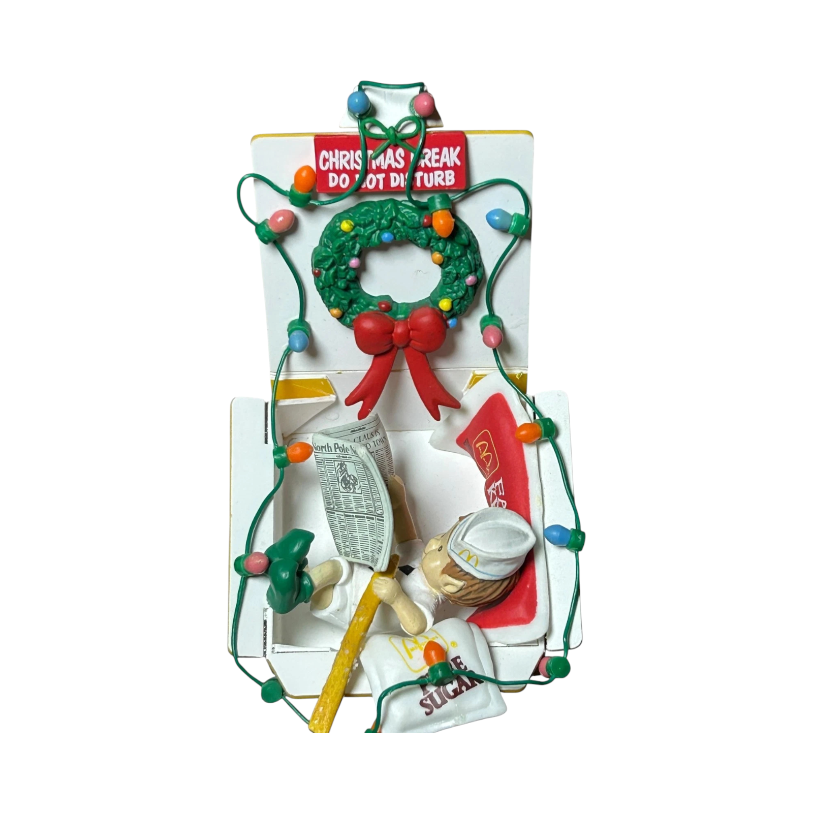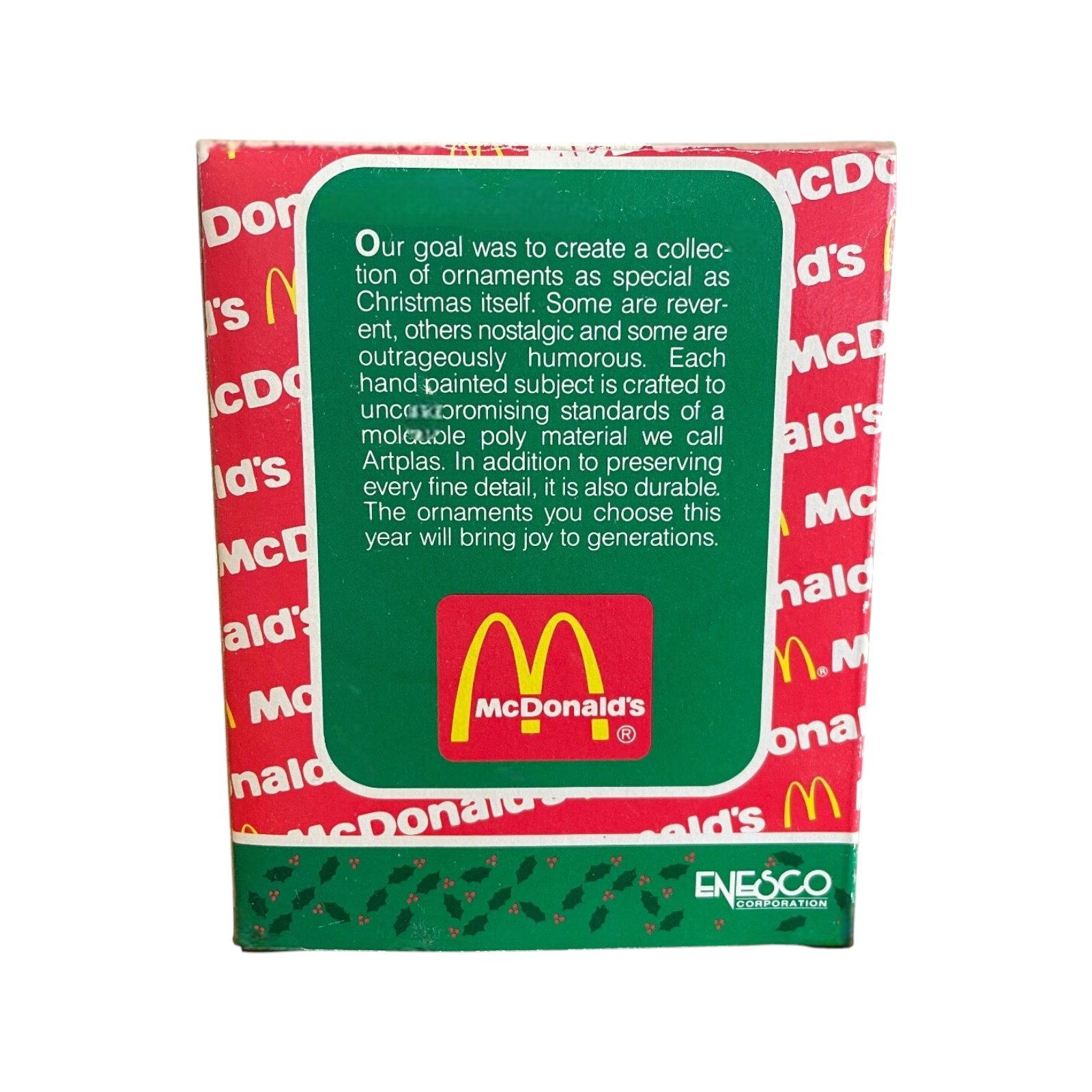 Charming and collectible, the 1991 A Quarter Pounder with Cheer ornament from Enesco’s McDonald’s Collection celebrates the joy of the season with a festive fast-food twist. The design features a happy Quarter Pounder burger stacked with fries, topped with a smiling McDonald’s character hat, and is accented with holiday greenery and ribbons. It arrives in its original branded box, complete with collector’s tags and protective insert.