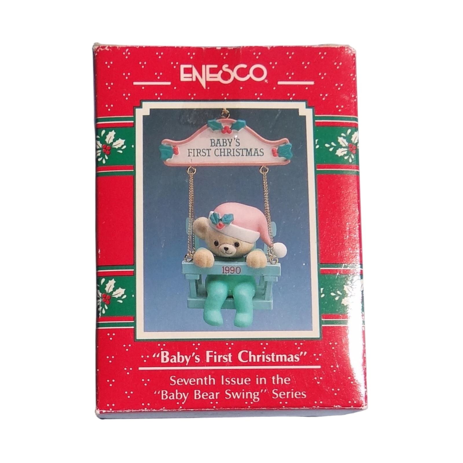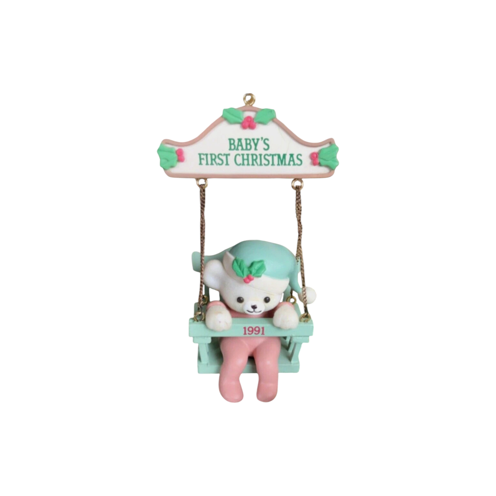 Celebrate a child’s milestone with this sweet 1991 “Baby’s First Christmas” ornament featuring an adorable teddy bear seated on a swing, holding or next to a “Baby’s First Christmas” sign dated 1991. The piece is crafted in molded plastic or ArtPlas-style resin with hand-painted detail, gold-tone chain links for the swing, and festive touches of red, green and soft pastels. As the eighth and final (or near final) issue in the Baby Bear Swing dated series, it holds both sentimental value for new-born celebrations and collector appeal for completion of the series. Ideal for gifting or display, this ornament brings both nostalgia and craftsmanship to your holiday décor.