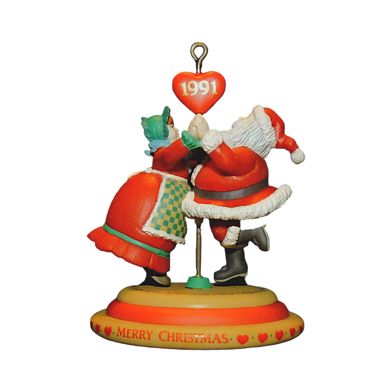 This 1991 “Christmas Couple (Santa Claus)” ornament features a joyful depiction of Mr. and Mrs. Santa Claus dancing together in full holiday regalia—red and white outfits, festive accents and a lively pose that captures the warmth and romance of the season. Crafted in molded painted plastic typical of the Heirloom series, this piece appeals to collectors of vintage holiday décor, couple-themed ornaments, or Santa motifs. The design blends friendship, festive celebration and nostalgic charm, making it a standout keepsake for tree display or gifting to couples.