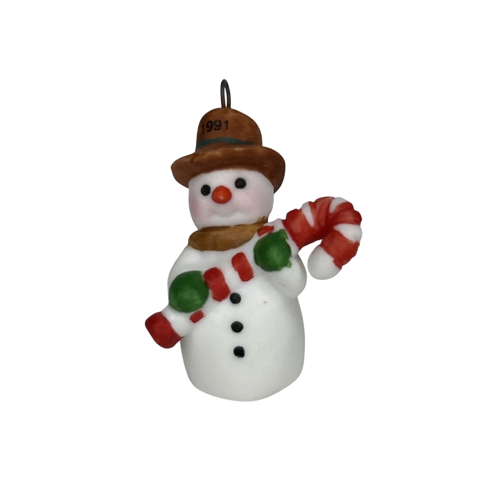 Sweeten holiday decor with 1991 Cool 'n' Sweet, a miniature keepsake snowman holding a giant candy cane, wearing a whimsical hat boldly printed with “1991”. Crafted from fine porcelain by artist Sharon Pike, this petite collectible stands just about 1″ tall. Mint-in-box examples include the original Collector’s Series miniature box and gold-tone hanging loop. No power is needed—just hang on a tabletop tree or display for a delightfully festive touch.